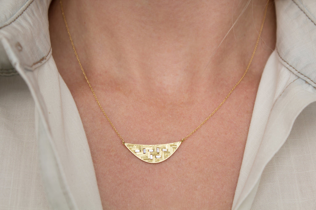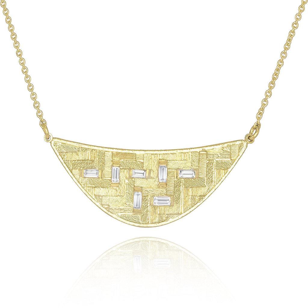 Jo Hayes Ward Diamond Baguette Crescent Parquet Gold Necklace