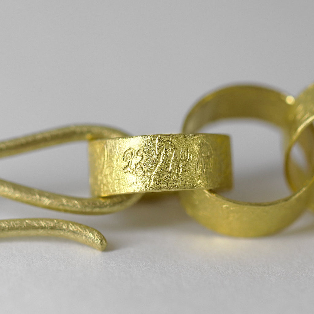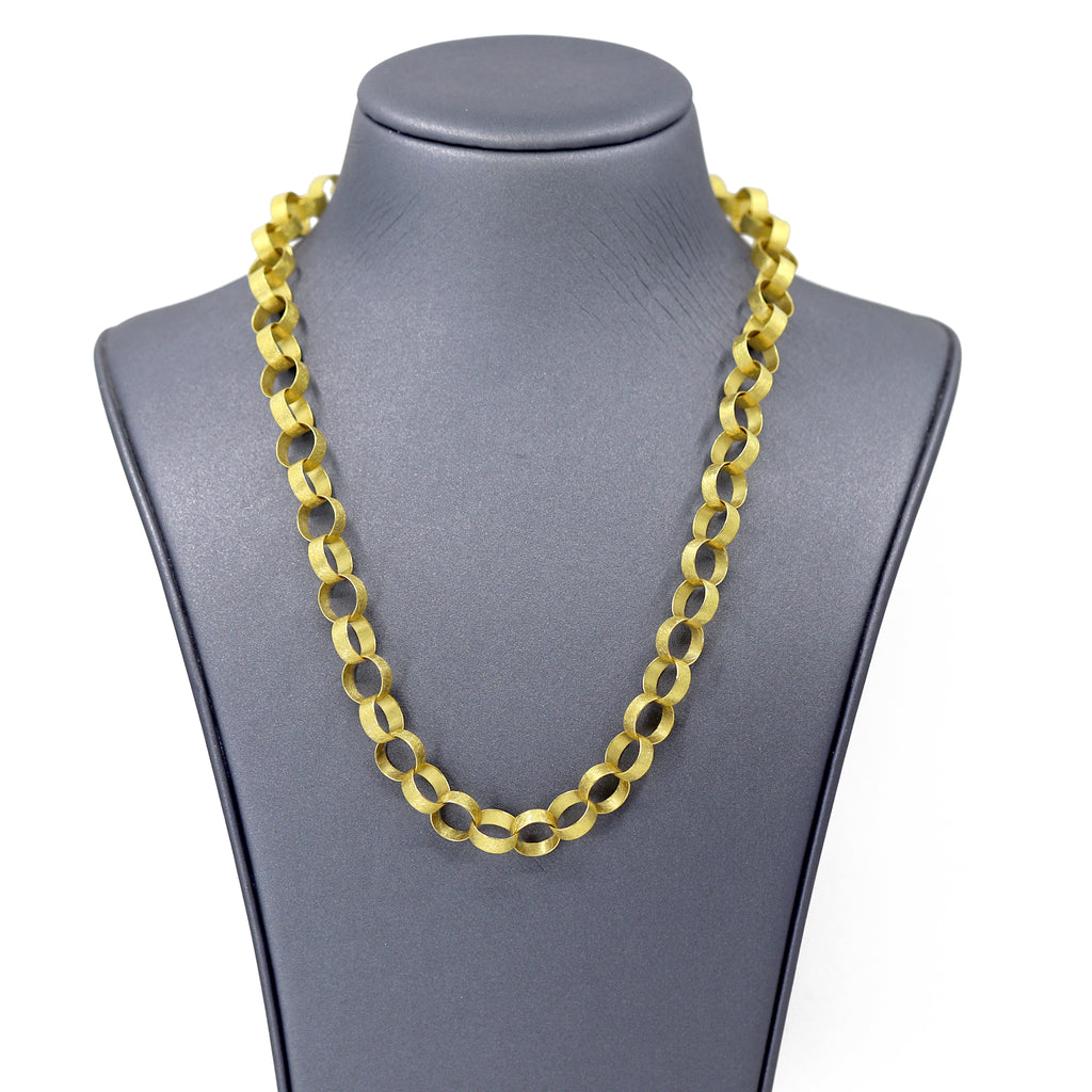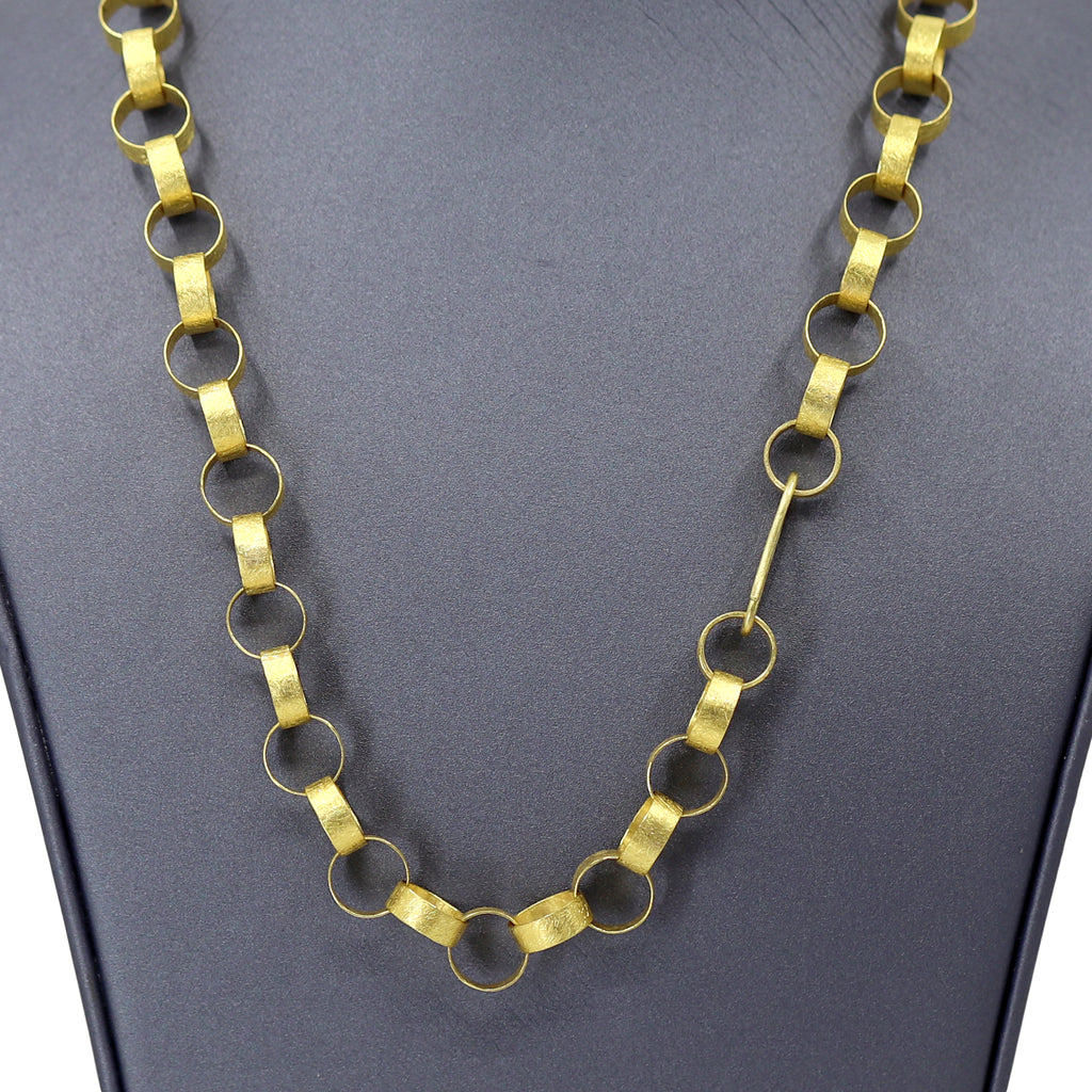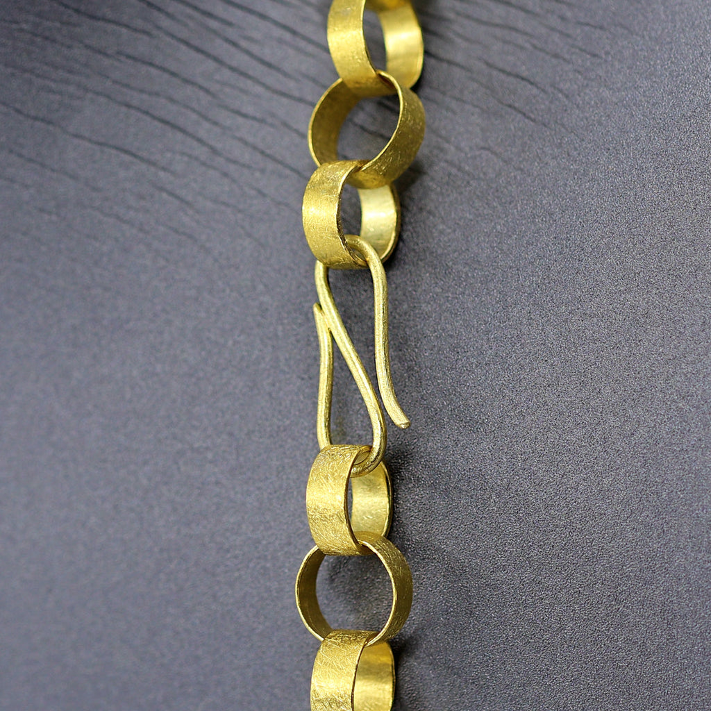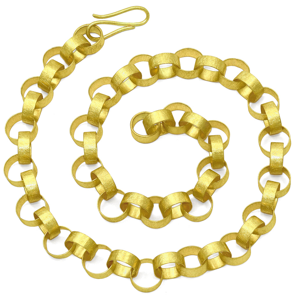 Heavy Round Paper Chain Link Necklace handmade by jewelry artist Petra Class featuring fifty-five individually and intricately hand-fabricated 22k yellow gold links highlighted by the artist's signature finish. The artisan chain measures 18 inches in length and is finished with a handmade hook clasp that seamlessly integrates into the design for added versatility.