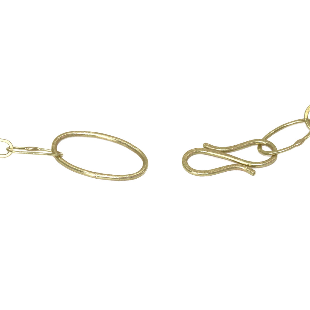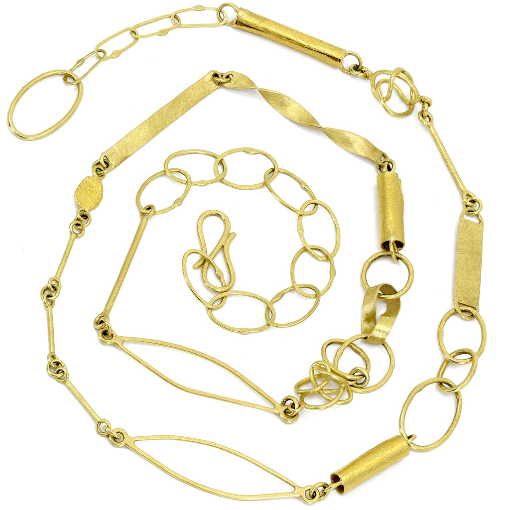 One of a Kind Mix 'n Mingle Chain hand-fabricated by jewelry maker Petra Class featuring a spectacular assortment of the artist's signature 18k yellow gold and 22k yellow gold links intricately laid out and connected to optimize wearability in multiple positions and at multiple lengths. The artisan chain is 24.5 inches in length and is finished with a handmade hook and eye clasp that seamlessly integrates into the design. Stamped and Hallmarked