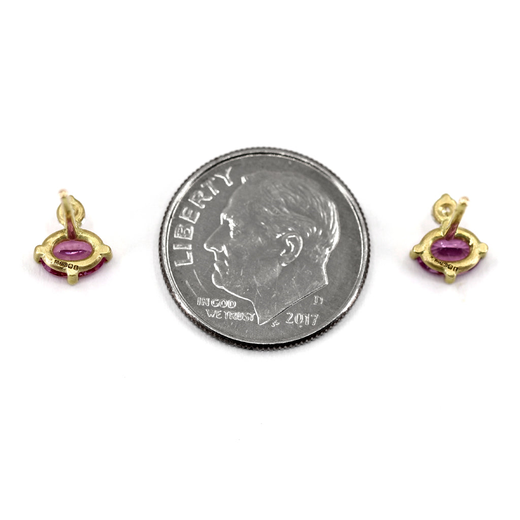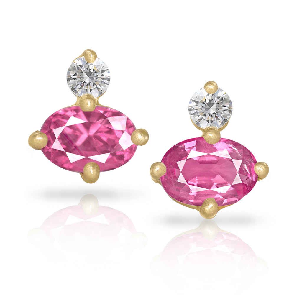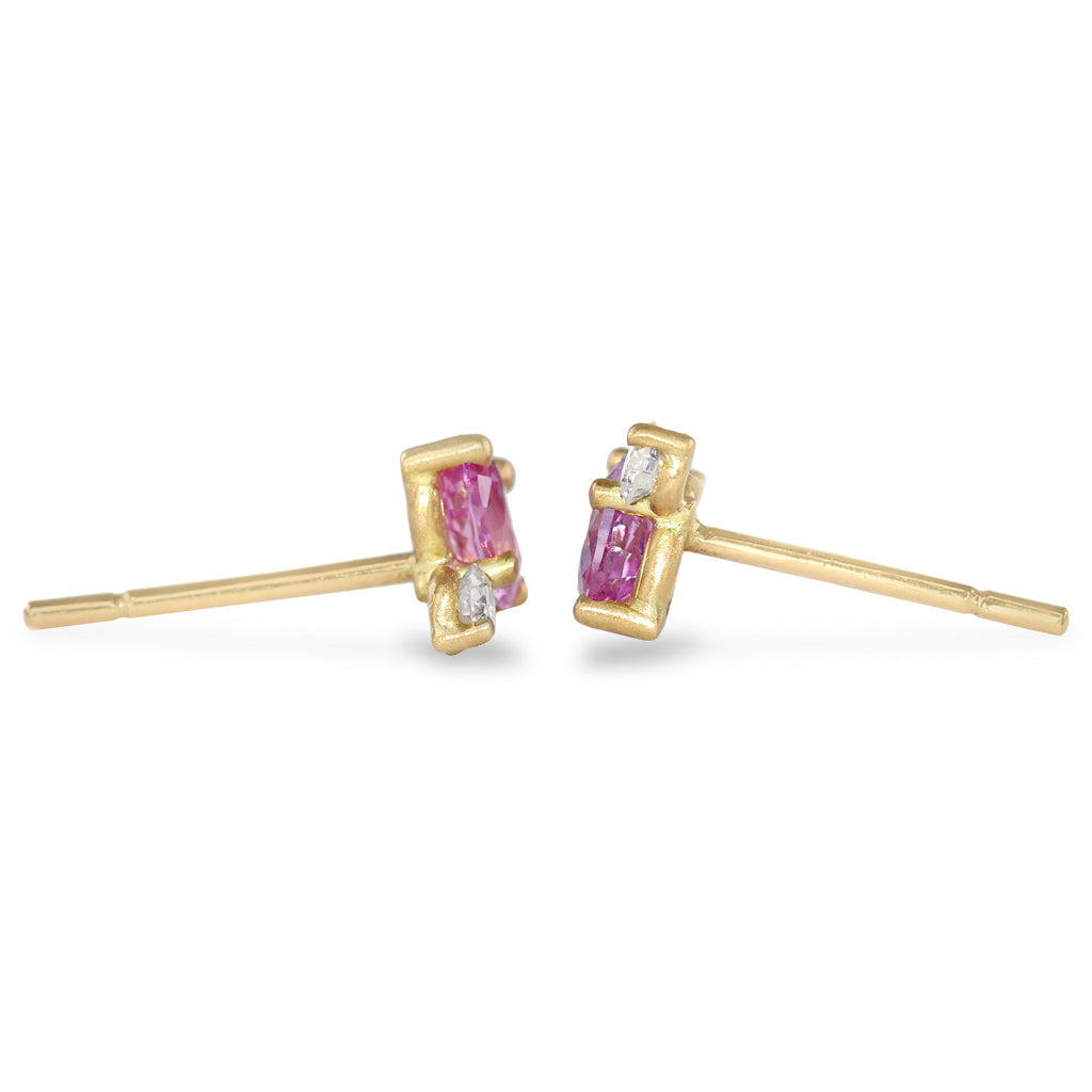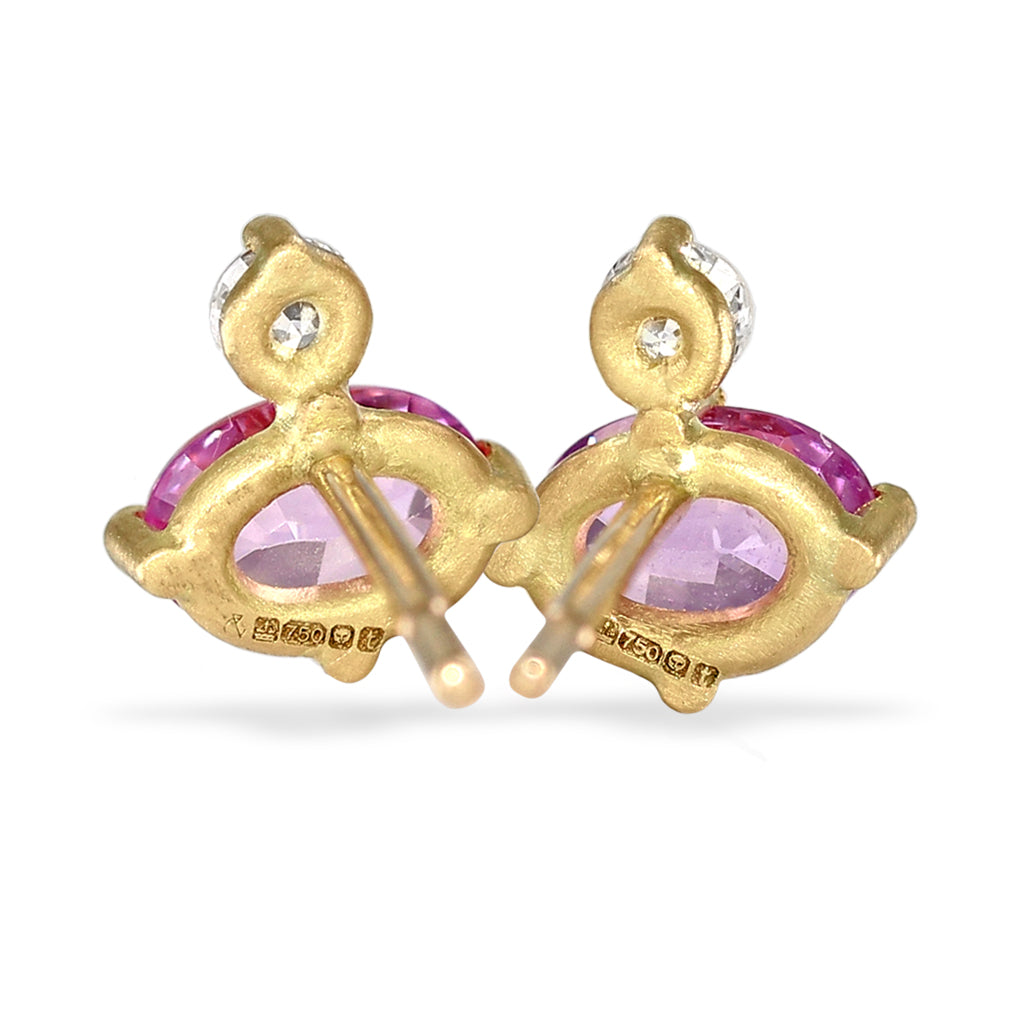 Tiny Oval Duo Stud Earrings hand-fabricated in London by jewelry maker Shimell and Madden, featuring a gorgeous pair of shimmering faceted oval pink sapphires set beneath two round brilliant-cut white diamonds totaling 0.10 carats, all bezel-set in signature satin-finished 18k yellow gold and finished with 18k gold posts and backs. Stamped and Hallmarked.