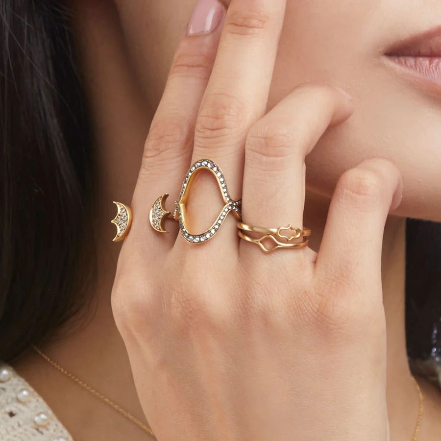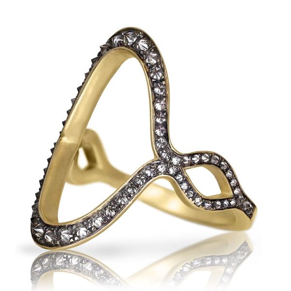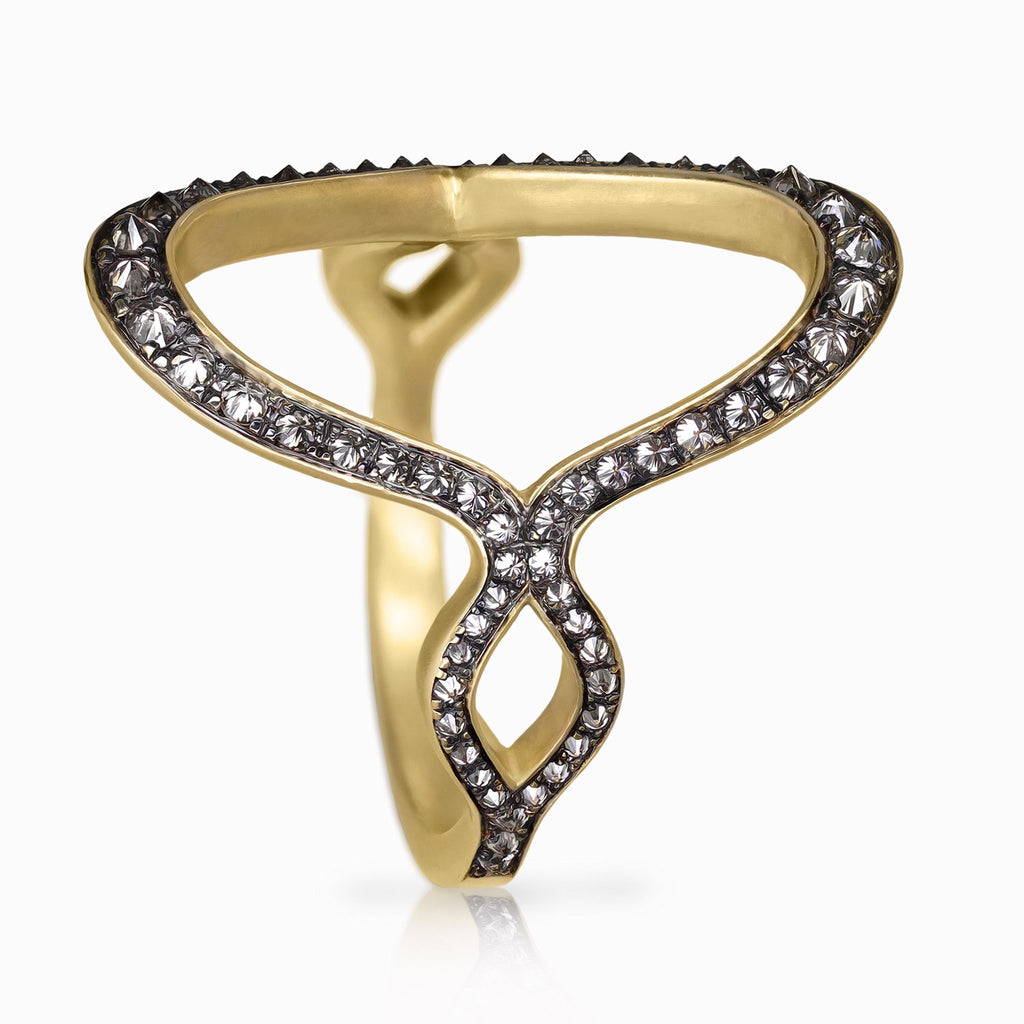Jaws Ring by jewelry designer Anahita in 18k yellow gold studded with inverted set champagne pave diamonds totaling 0.65 carats, resembling an open jaw.