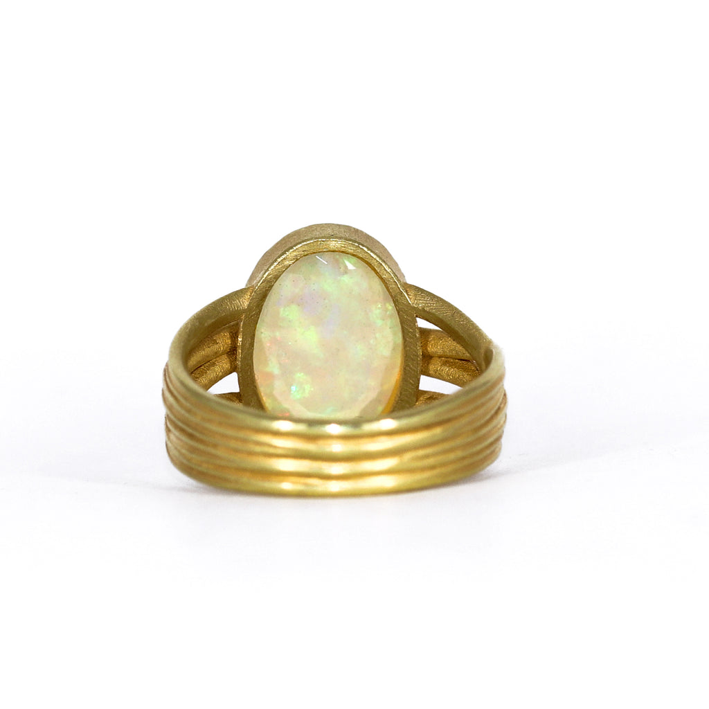 One of a Kind Multiwrap Band Ring hand-fabricated by master jewelry maker Barbara Heinrich showcasing an 2.89 carat rose-cut oval Ethiopian opal with brilliant rainbow color play and flash. The gorgeous gemstone rests in an 18k yellow gold bezel seamlessly connected to Barbara's signature multiwrapped ribbon band. Size 7.5 (can be sized).