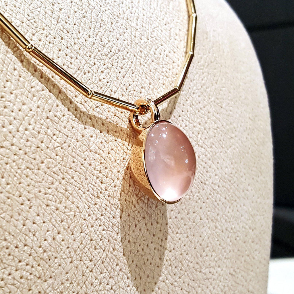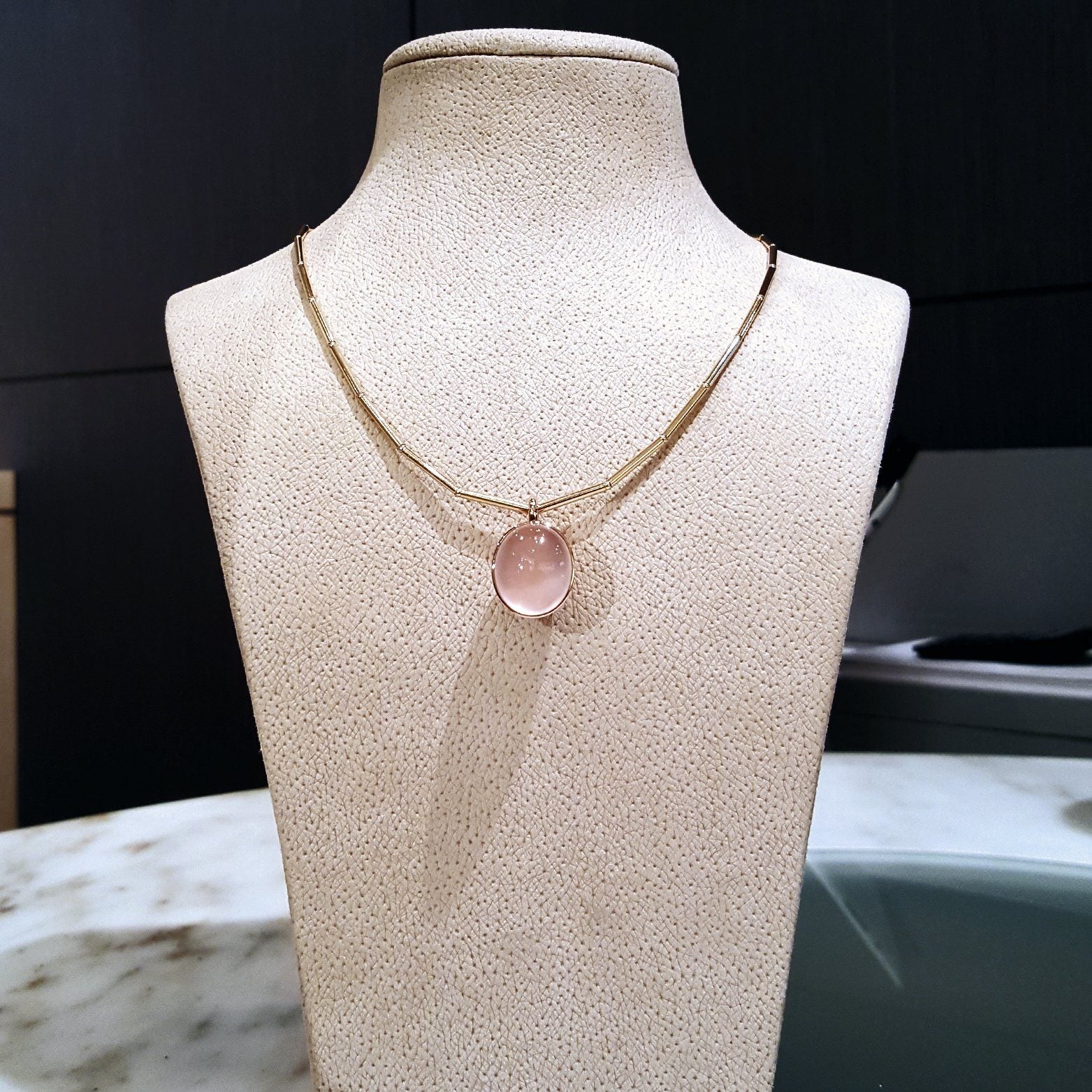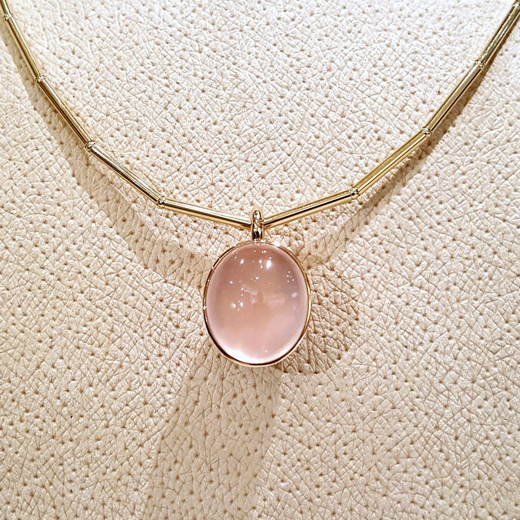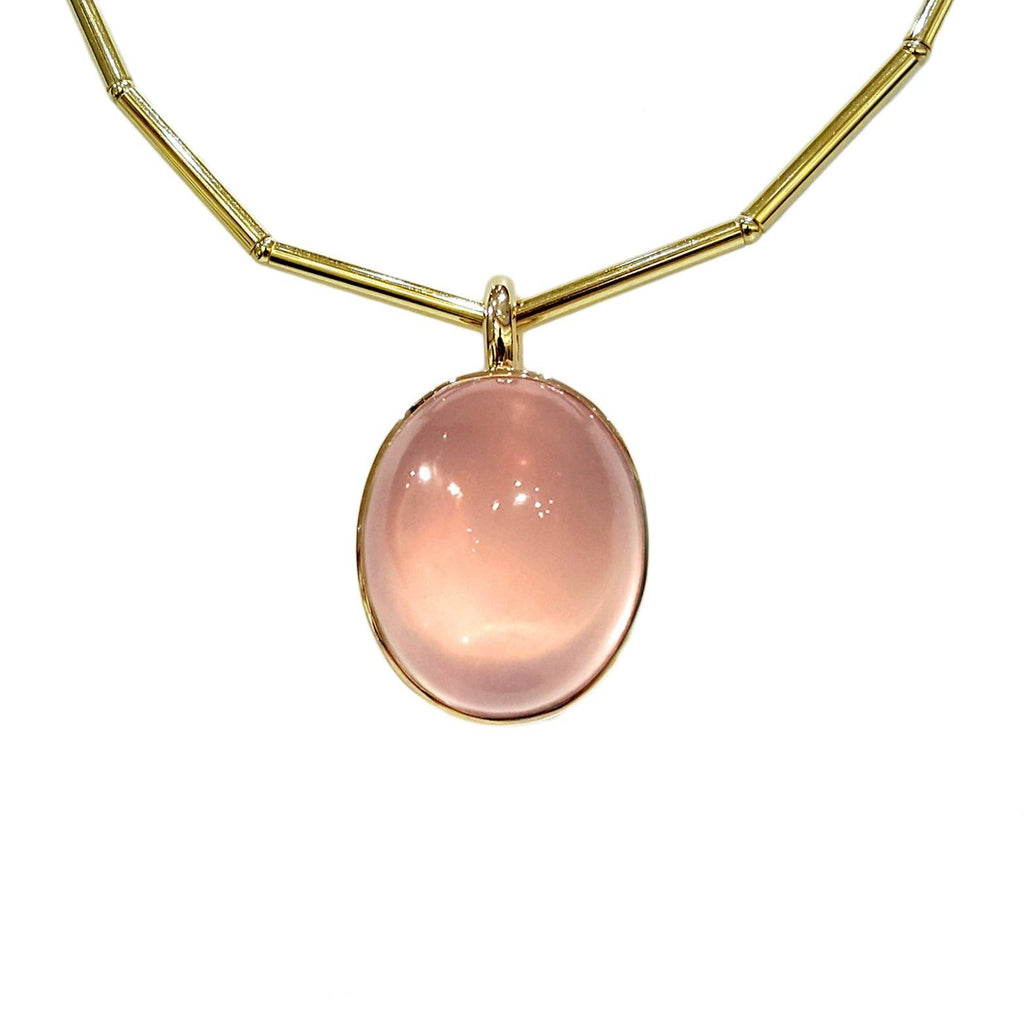 One-of-a-Kind Bowl Pendant handcrafted by acclaimed jewelry designer Erich Zimmermann in 18k gold with a 20.01 carat oval cabochon-cut rose quartz. The Rose quartz, natural and hand-cut in Germany, has truly phenomenal optical qualities as it glows in any light setting. Pendant priced with gorgeous handmade 17.5" yellow gold tubular chain with spring-closure. Available separately.