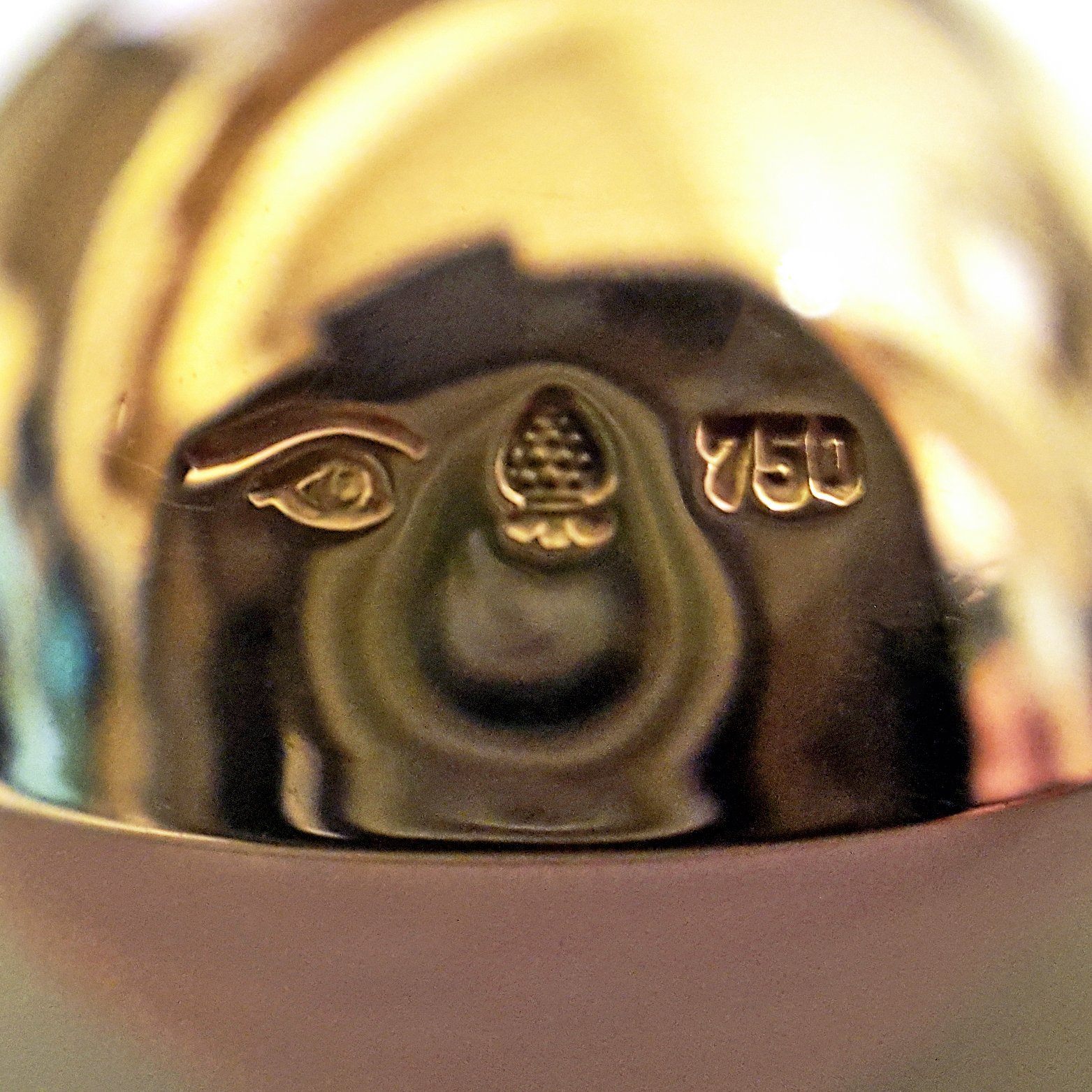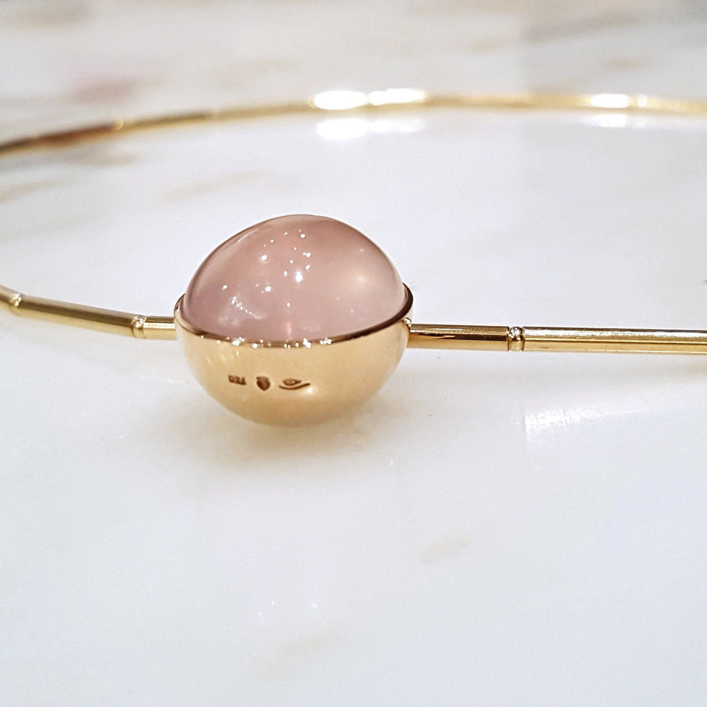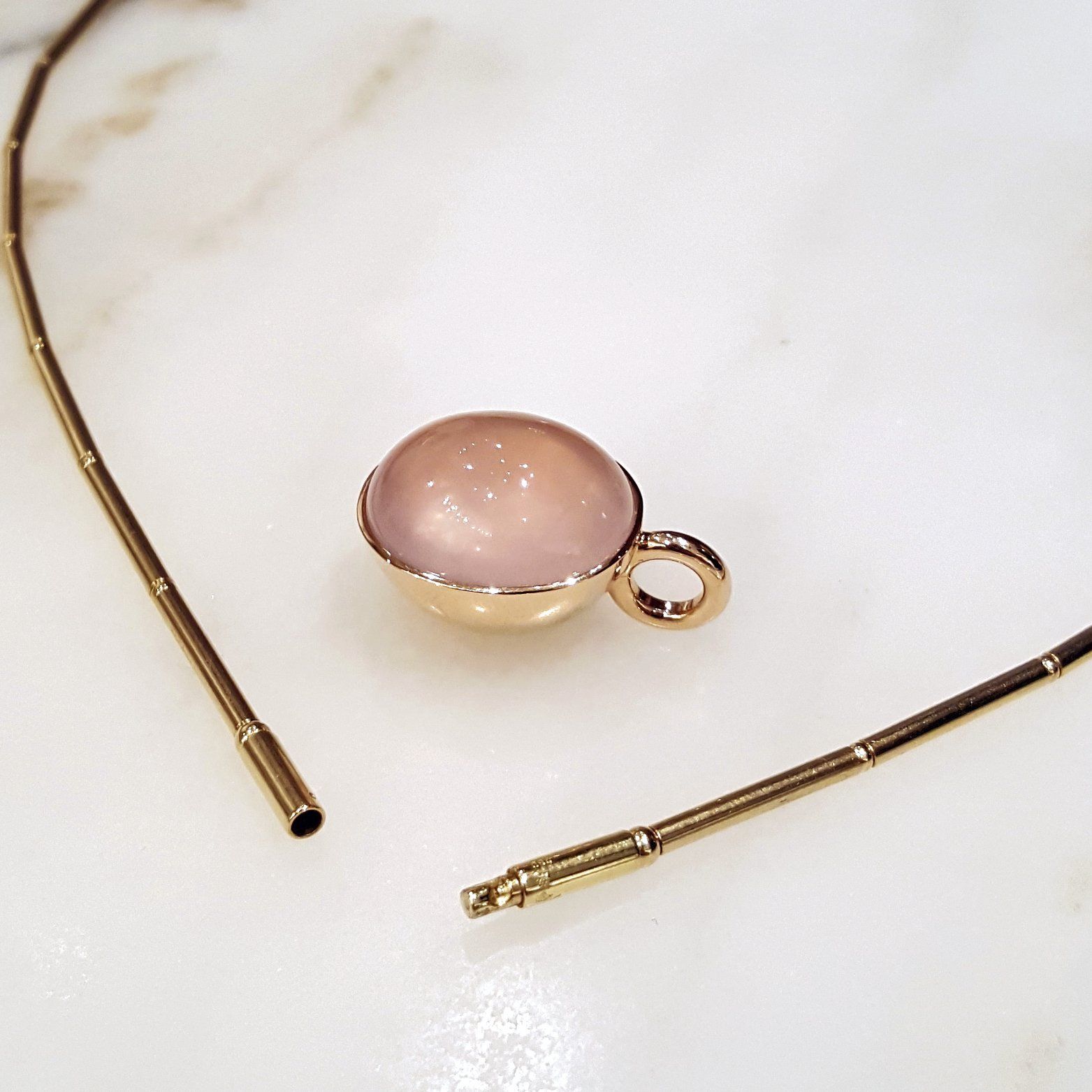 One-of-a-Kind Bowl Pendant handcrafted by acclaimed jewelry designer Erich Zimmermann in 18k gold with a 20.01 carat oval cabochon-cut rose quartz. The Rose quartz, natural and hand-cut in Germany, has truly phenomenal optical qualities as it glows in any light setting. Pendant priced with gorgeous handmade 17.5" yellow gold tubular chain with spring-closure. Available separately.