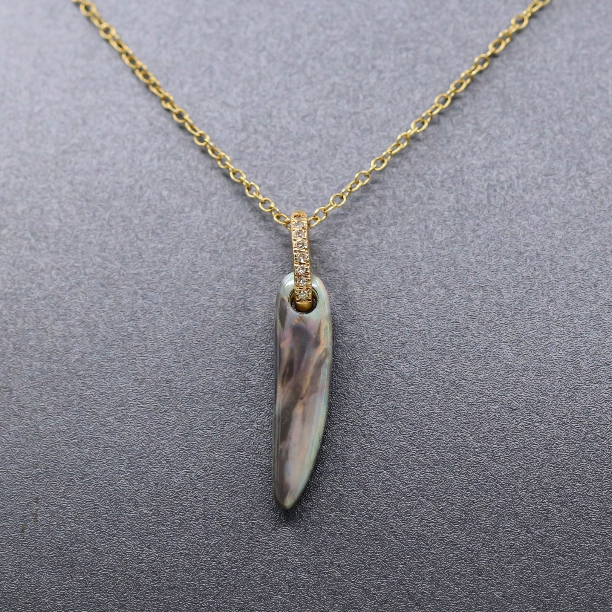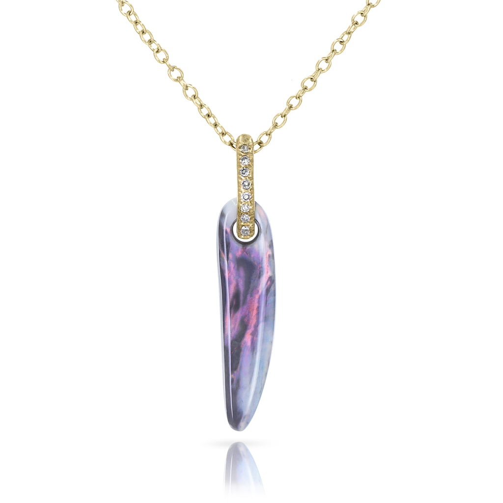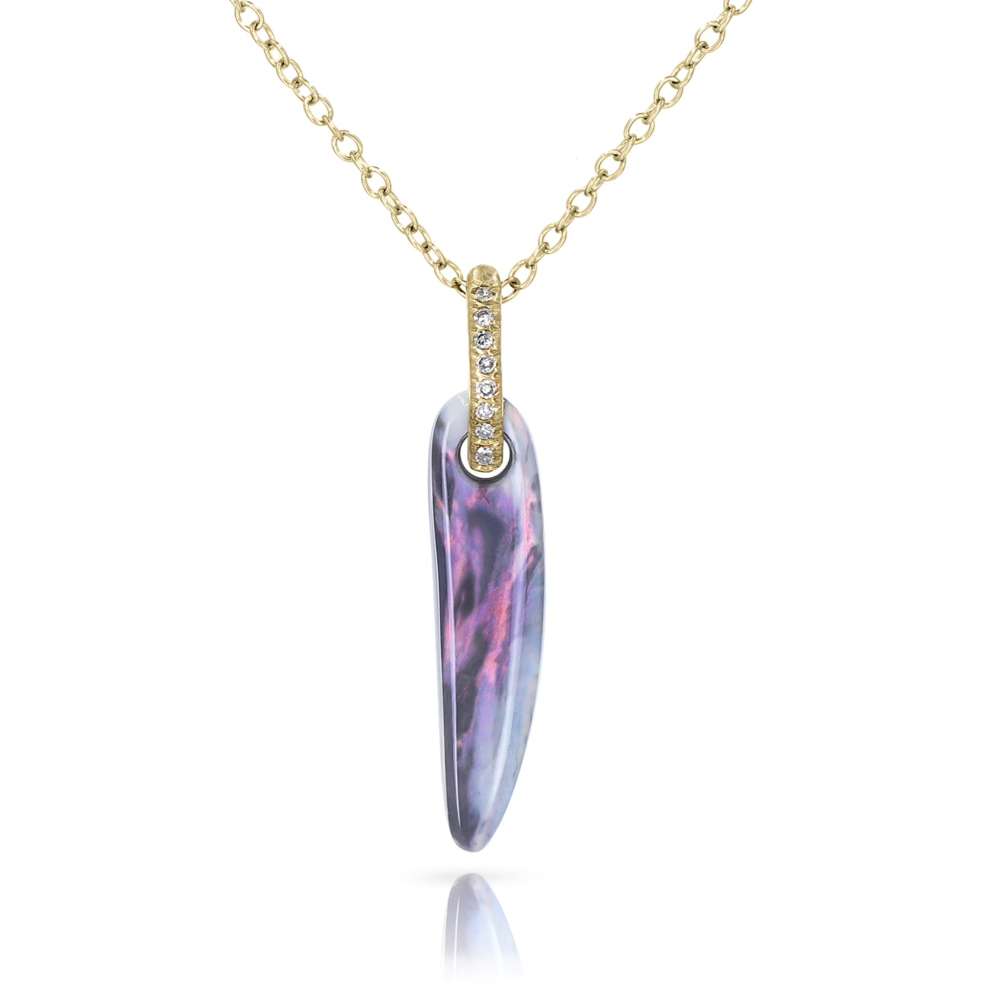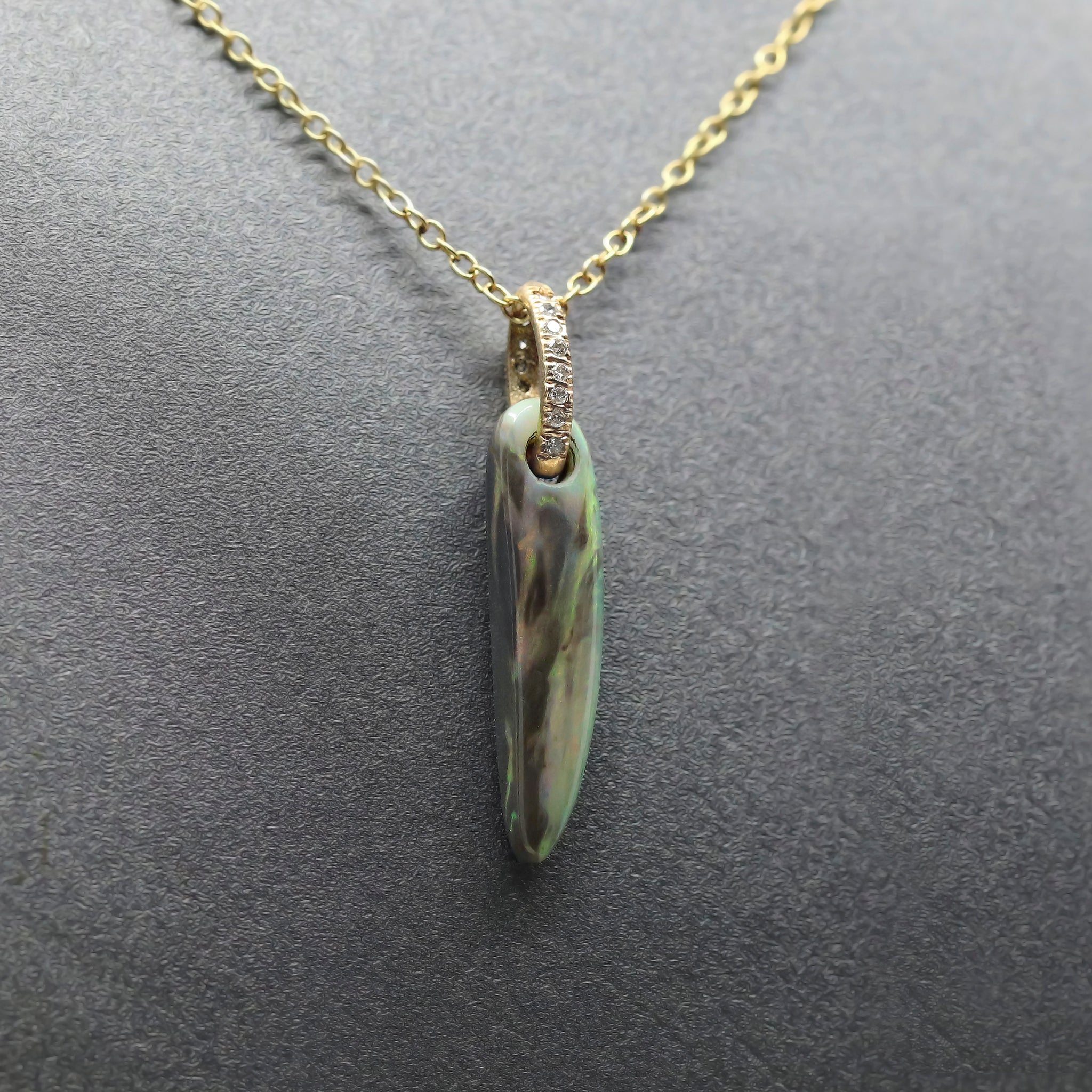 One of a Kind Floating Opal Necklace by jewelry designer Julie Romanenko featuring a beautiful elongated and curved natural Australian opal drop that features a unique change in colors, revealing flashes of red and pink from certain angles, with a subtle electric green from others. The gorgeous gem dangles from a diamond-embedded 14k yellow gold bail, currently accompanied by a 18 inch + 20 inch 14k yellow gold cable chain with "S" clasp. Alternative chain options available.