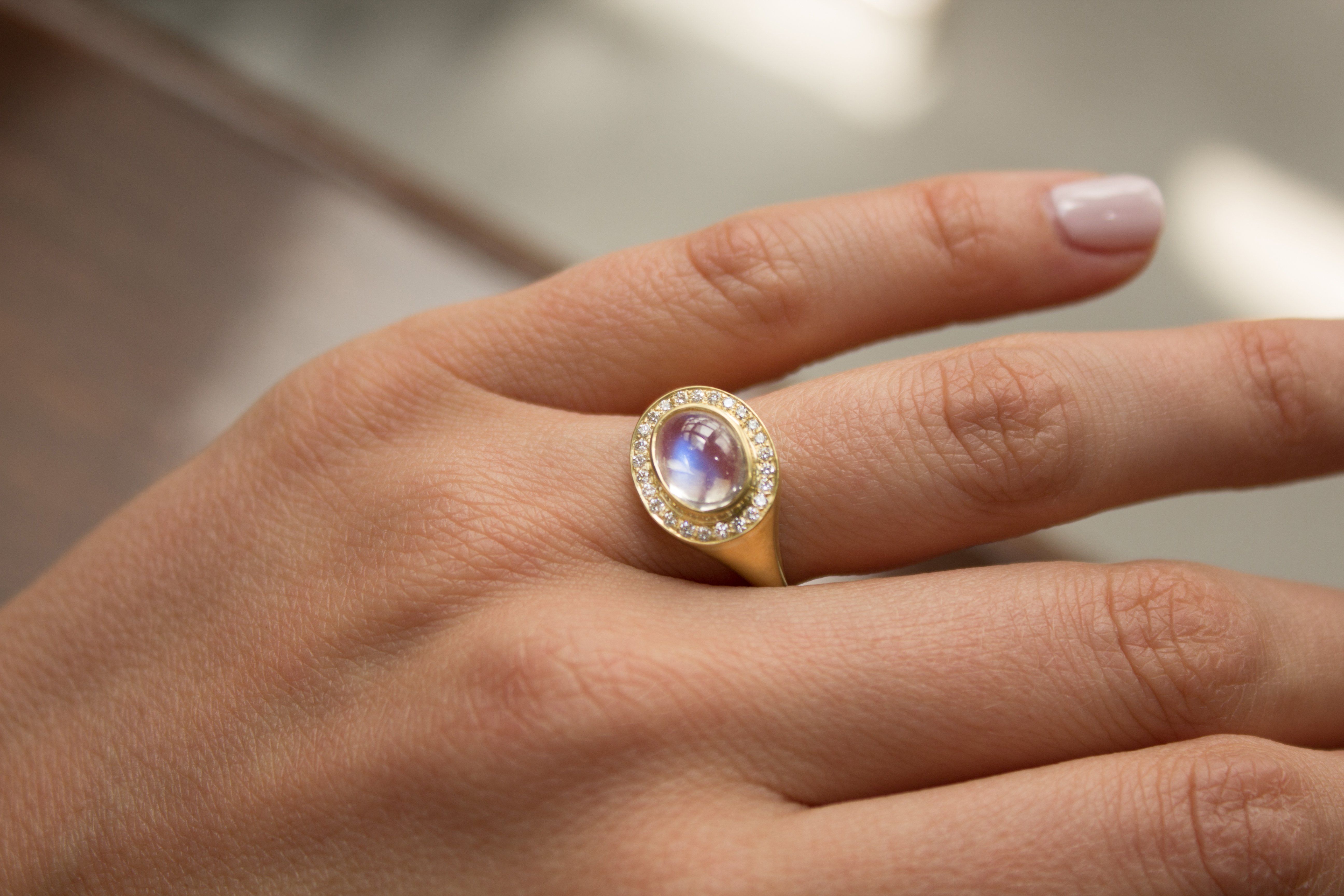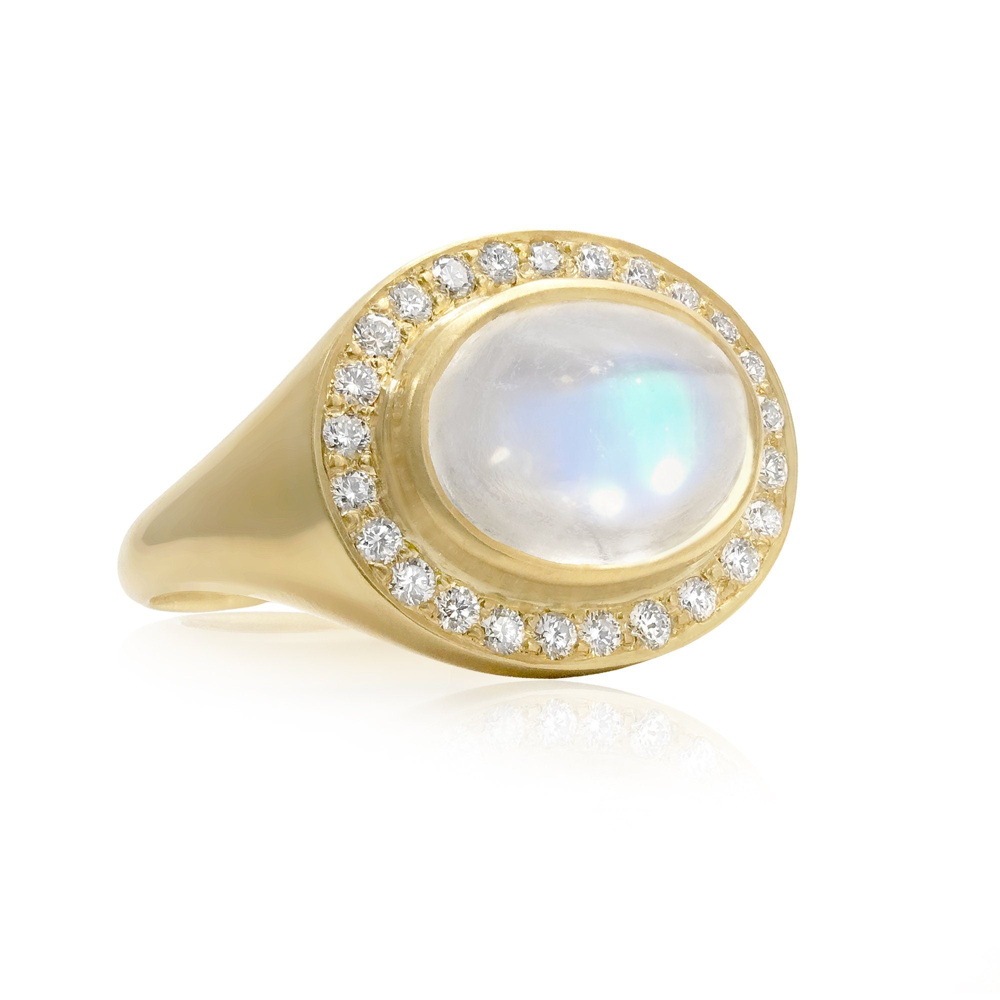One of a Kind Crown Ring handcrafted by jewelry designer Tej Kothari in matte-finished 18k yellow gold featuring a beautiful oval rainbow moonstone cabochon surrounded with round brilliant-cut white diamonds. Stamped and Hallmarked 18k - Kothari.