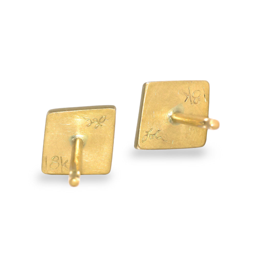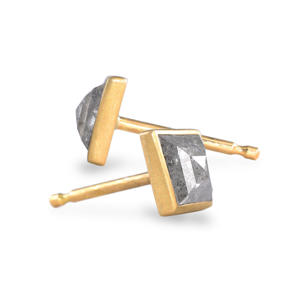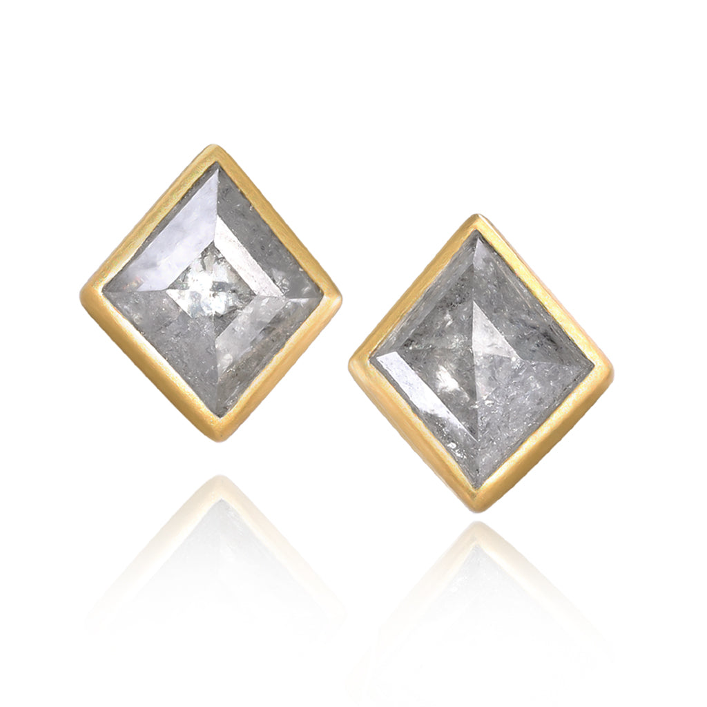 One of a Kind Stud Earrings handmade by renowned jewelry artist Lola Brooks featuring a gorgeous matched pair of shimmering, faceted grey diamond kites totaling 0.99 carats. The diamonds are bezel-set in Lola's signature-finished 18k yellow gold and finished with 18k yellow gold posts and backs.