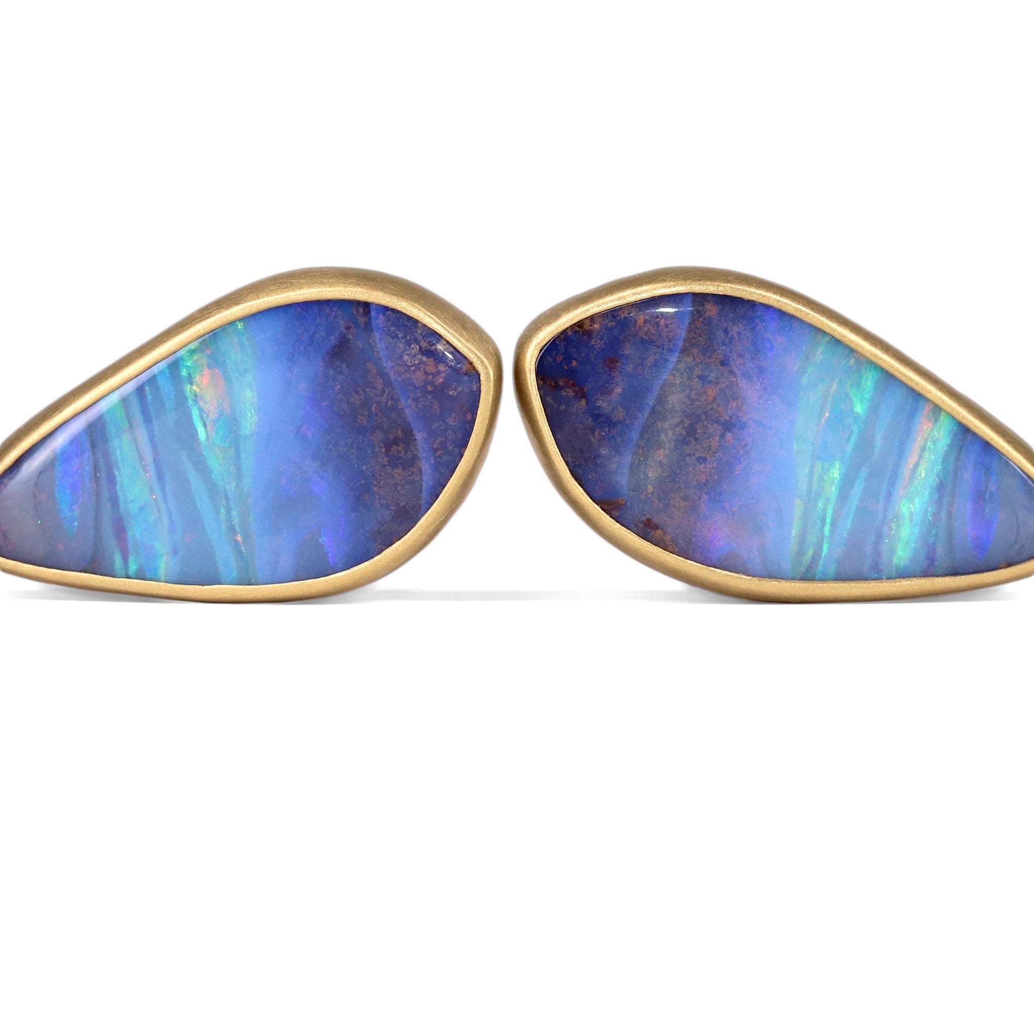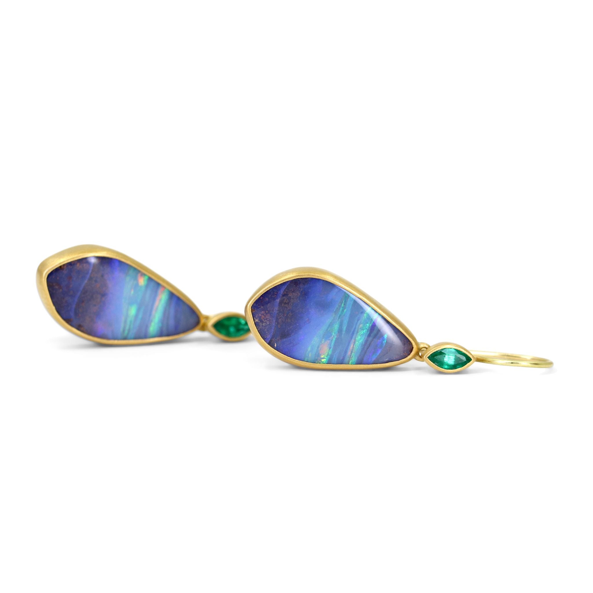 One of a Kind Earrings hot off the bench from award-winning maker Lola Brooks, hand-fabricated in 22k yellow gold showcasing a spectacular, fiery pair of oceanic boulder opal totaling 13.98carats, bezel-set beneath a matched pair of Columbian emerald marquis totaling 0.35 carats and finished on 18k yellow gold ear wires.