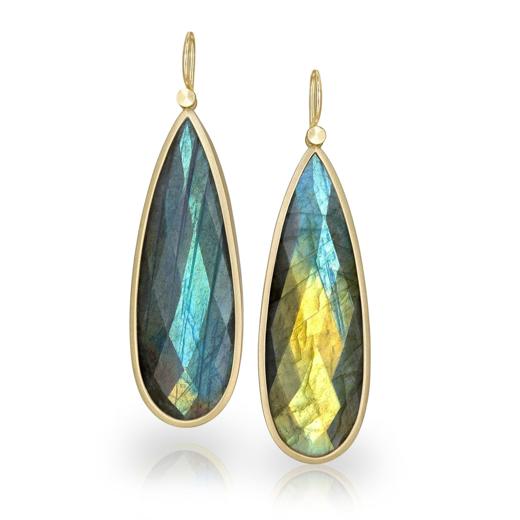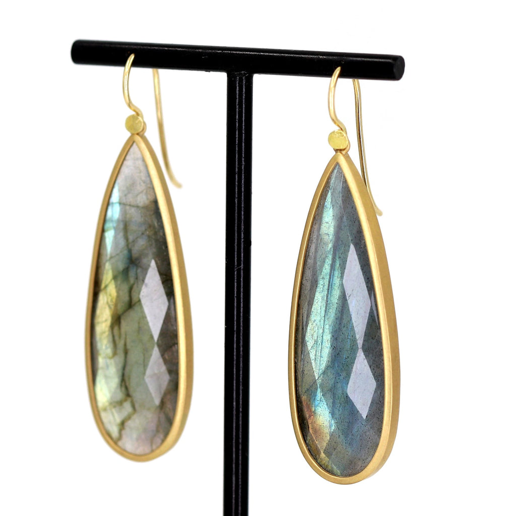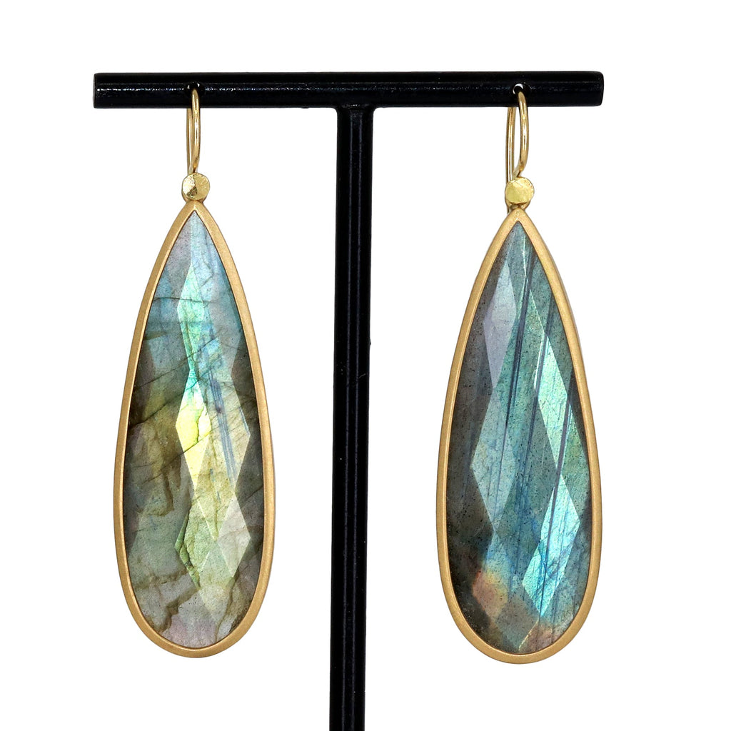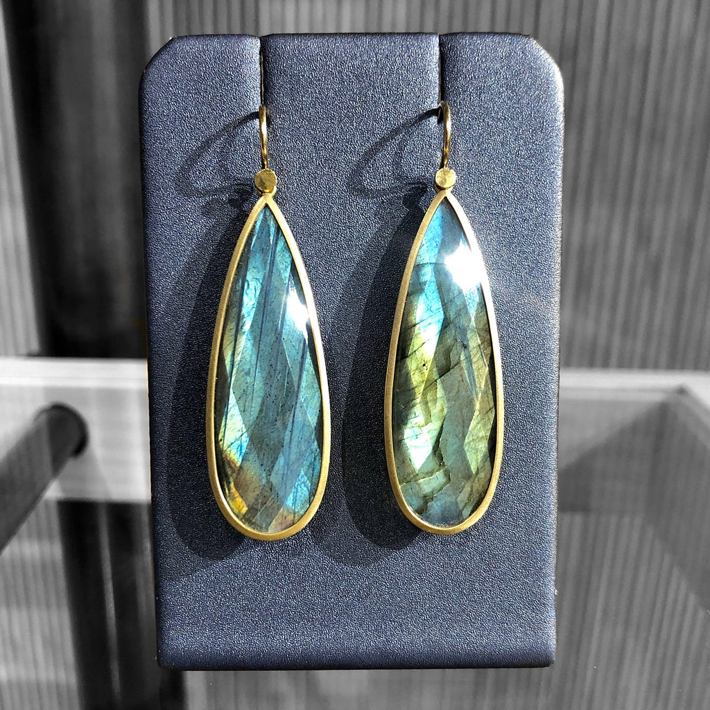 One of a Kind Drop Earrings by jewelry maker Lola Brooks hand-fabricated in matte-finished 18k yellow gold featuring a spectacular matched pair of shimmering, fiery faceted labradorite (43.39tcw), bezel-set and finished on the artist's signature accented 18k yellow gold ear wires.