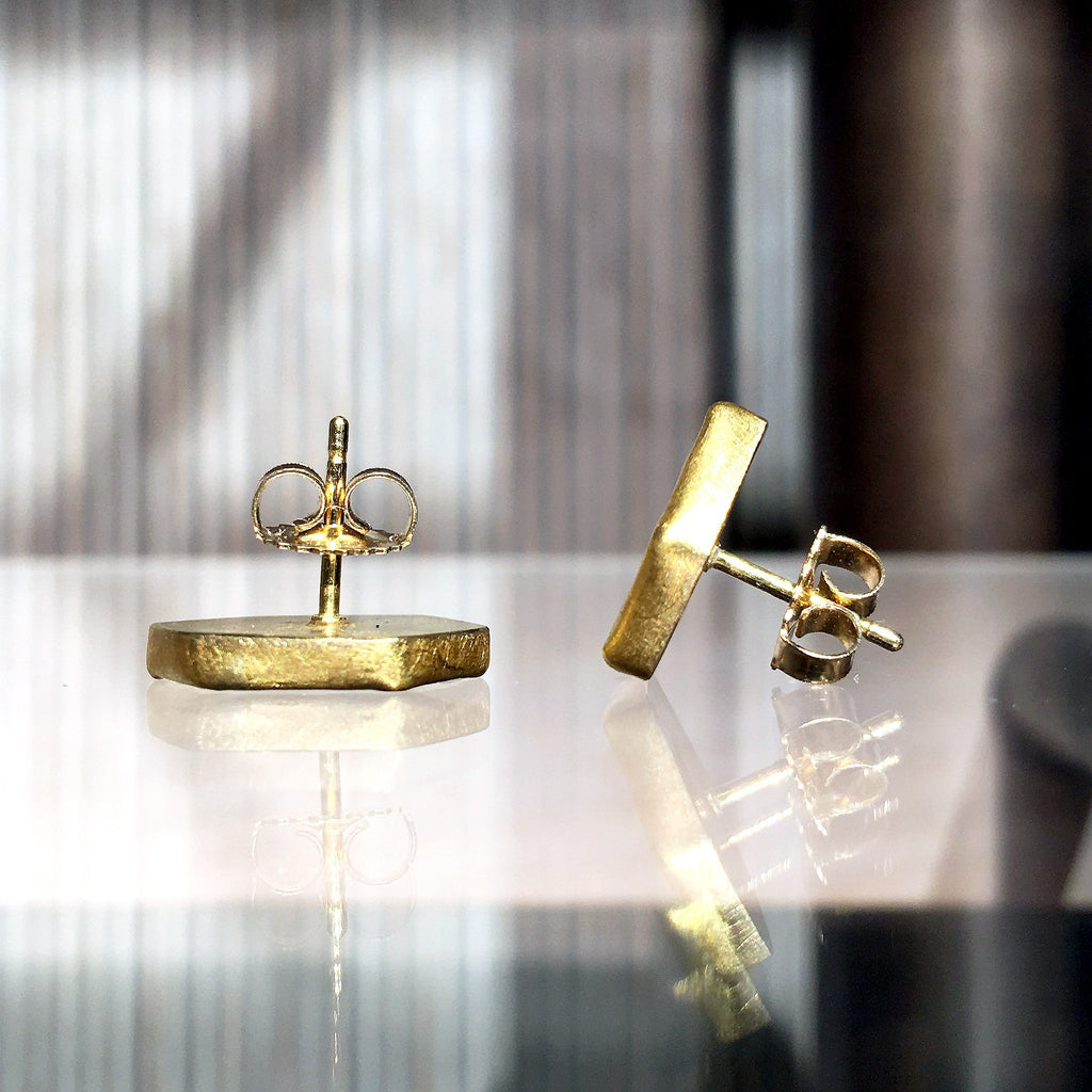 One of a Kind Studs handmade by jewelry designer Petra Class in matte-finished 22k yellow gold with two blue sapphire slices that have a unique, understated glow. On 18k yellow gold posts. Stamped and Hallmarked 18k / 22k / PC