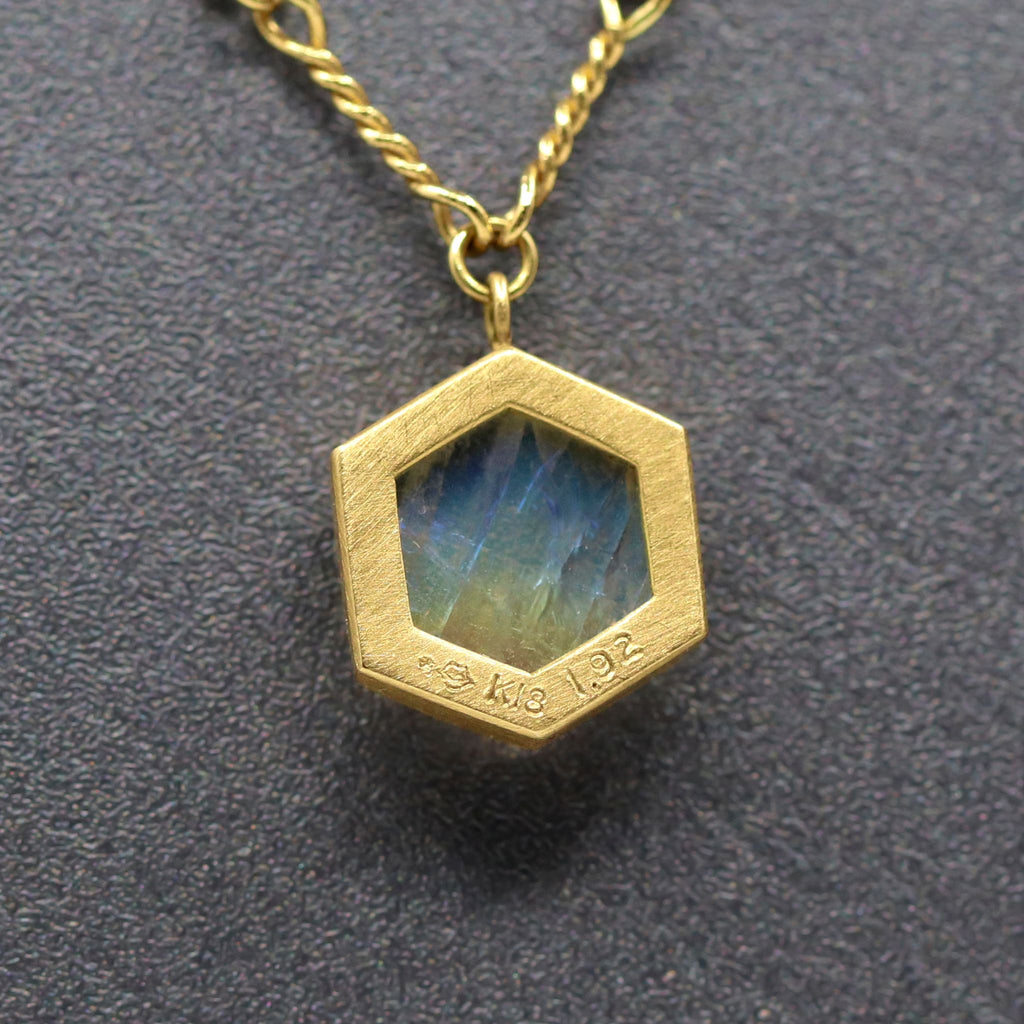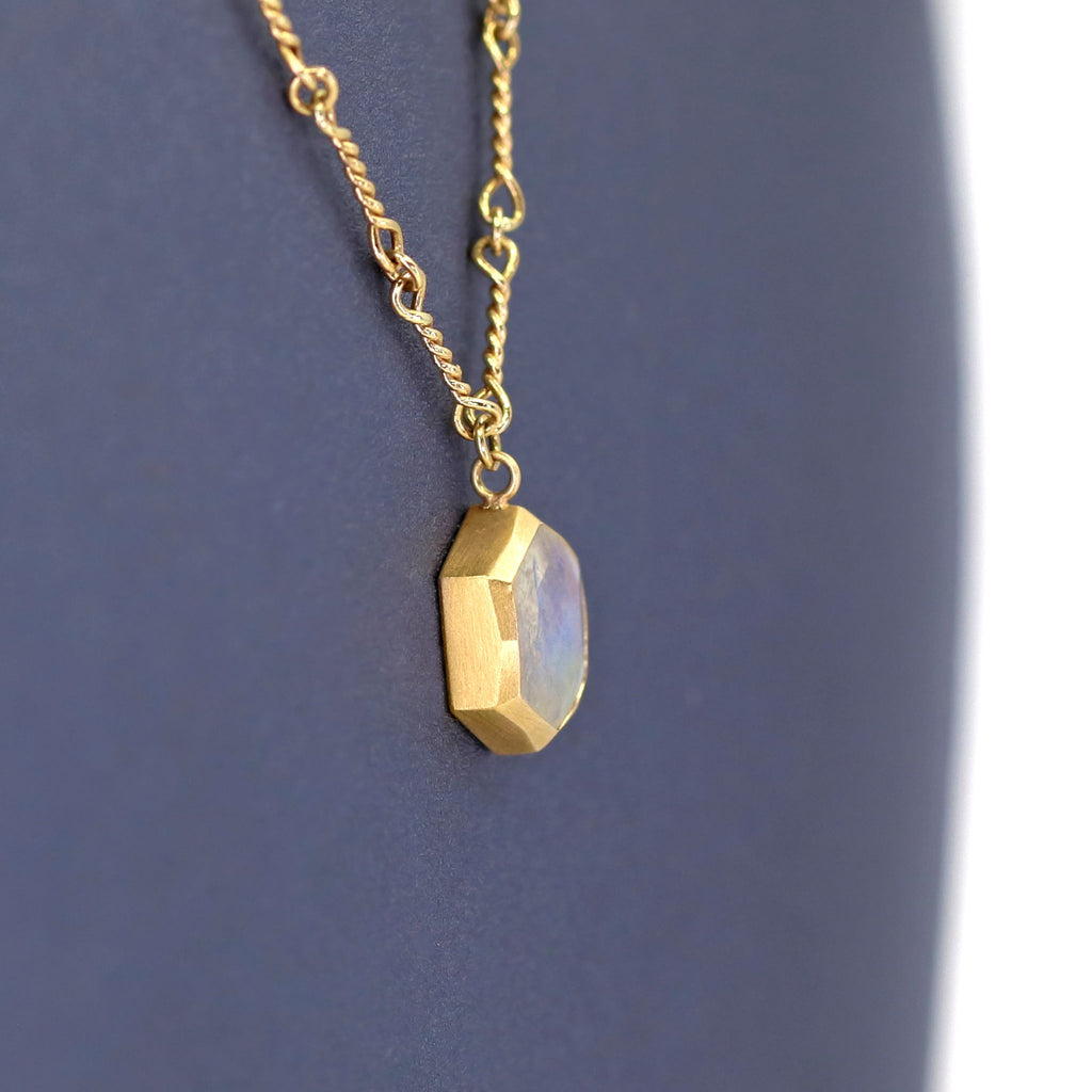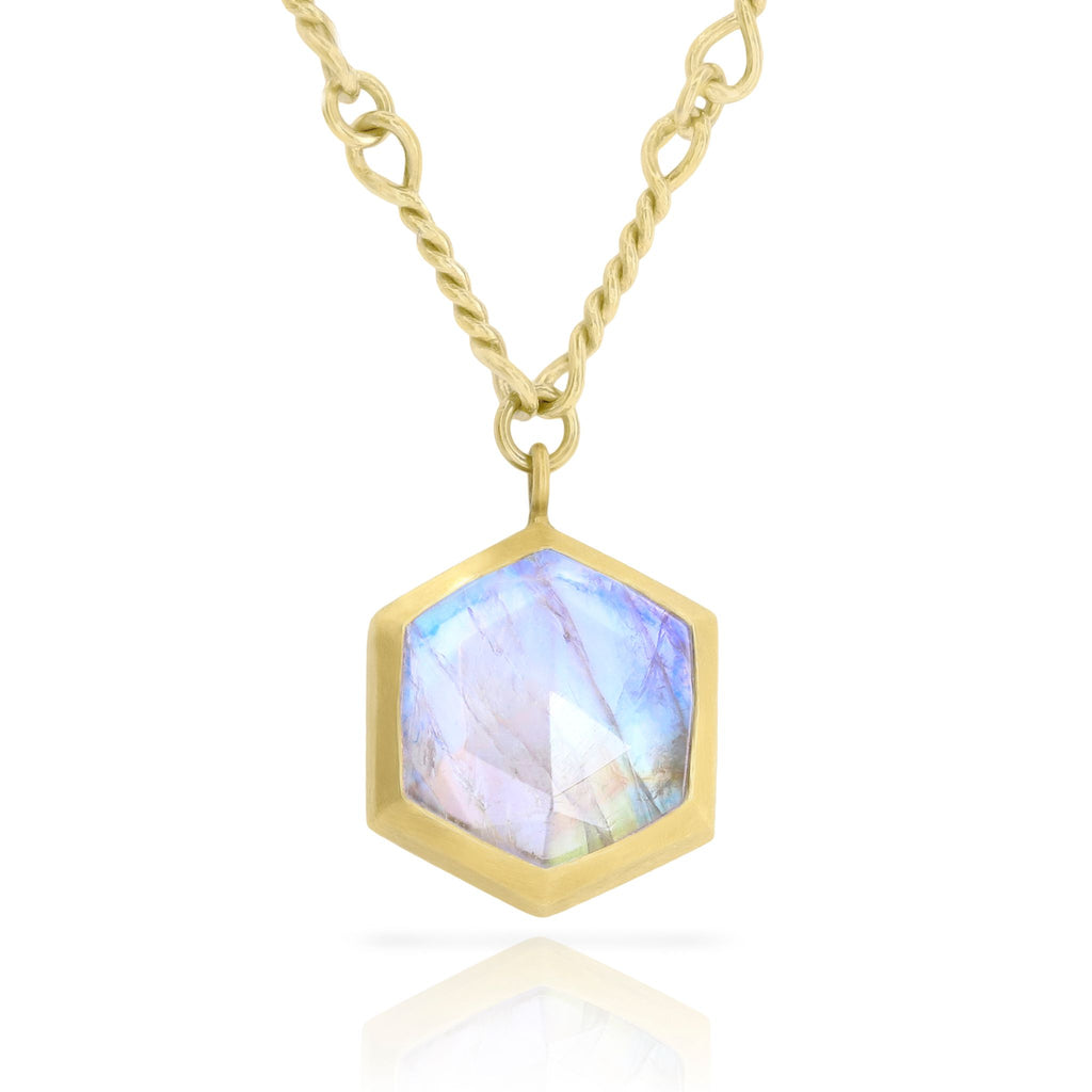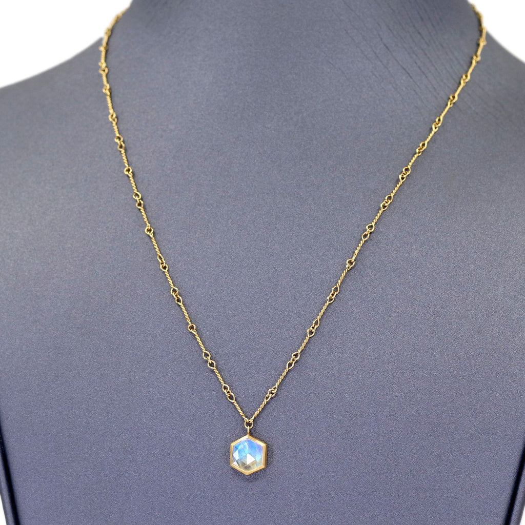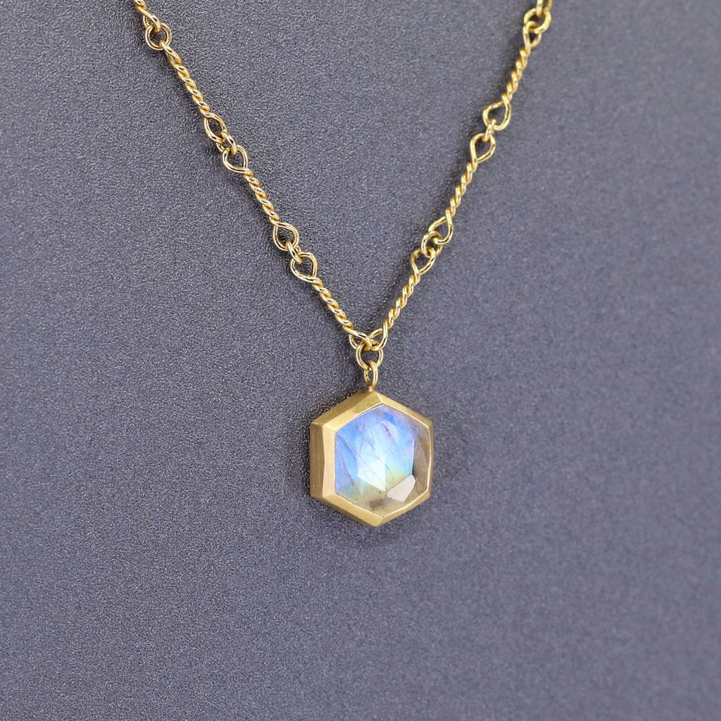 One of a Kind Hexagon Necklace hand-fabricated in Japan by jewelry designer Shinobu Marotta (Talkative Atelier) showcasing a vibrant faceted hexagonal rainbow moonstone framed and bezel-set in satin-finished 18k yellow gold on a signature 18k yellow gold twisted links chain. 17" in total length.
