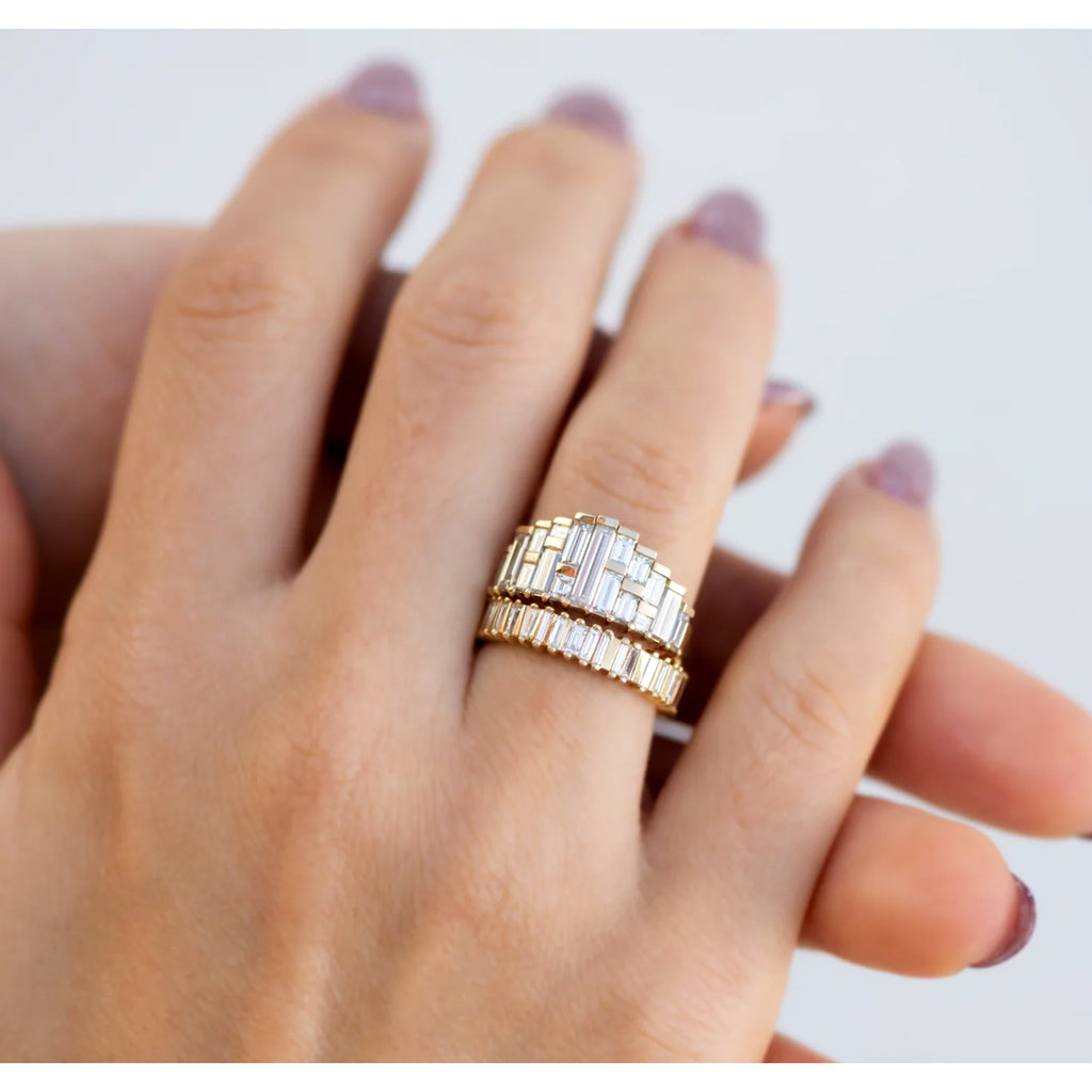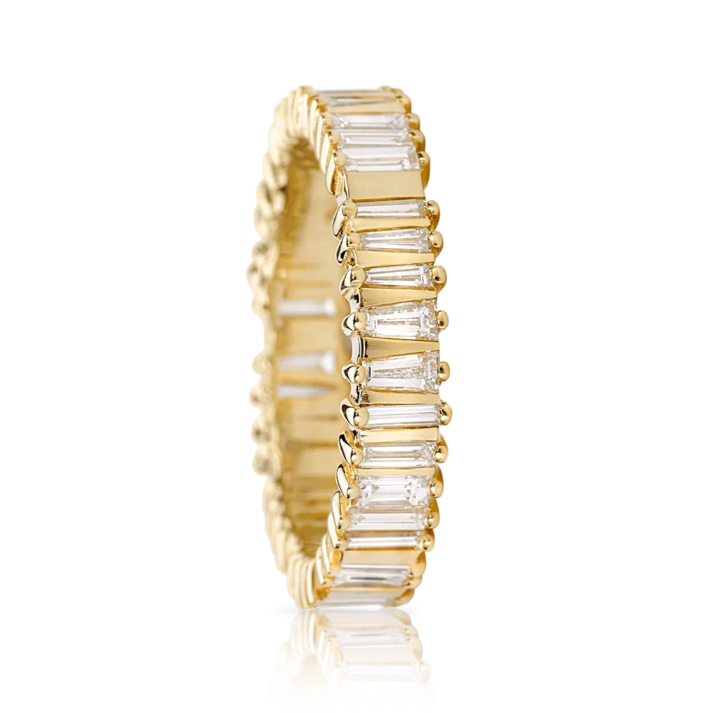 Bridge Eternity Band handcrafted by jewelry designer Artemer showcasing an array of tapered baguette and trapeze cut diamonds totaling 1.20 carats set in 18k yellow gold on a 4mm width band.