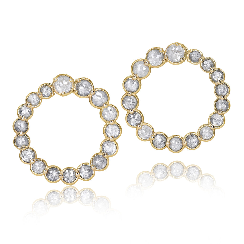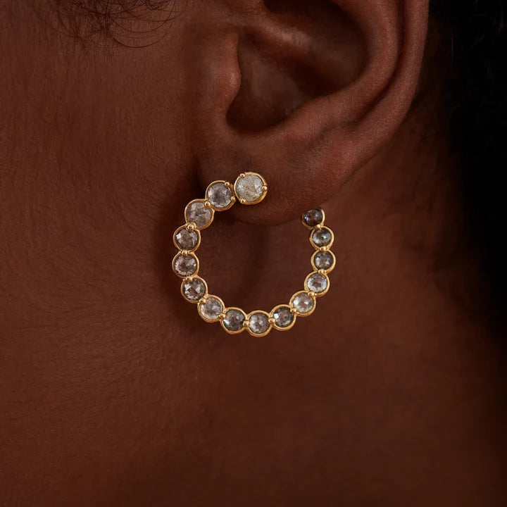 Spiral Hoop Earrings handcrafted by jewelry designer Artemer showcasing rose cut salt and pepper diamonds totaling 6.6 carats set in high polished 18k yellow gold that effortlessly curve around your ear.