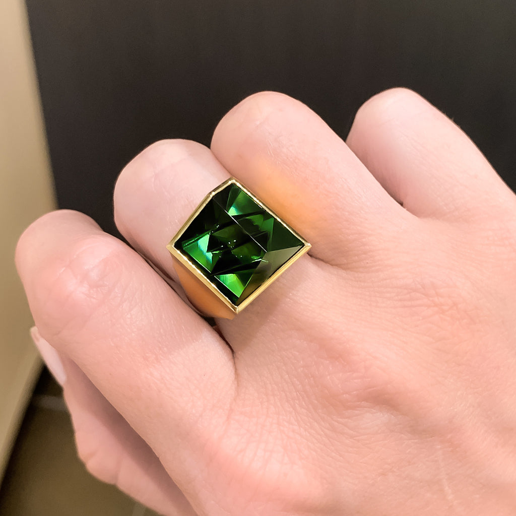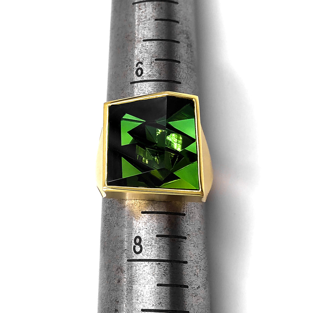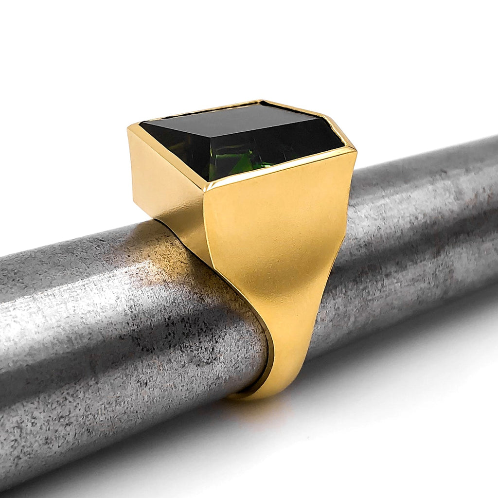 One-of-a-Kind Ring handcrafted in Germany by Atelier Munsteiner showcasing a top quality, hand-cut 10.87 carat deep green tourmaline in satin-finished 18k yellow gold. Size 7.0 (can be sized). Stamped and Hallmarked.