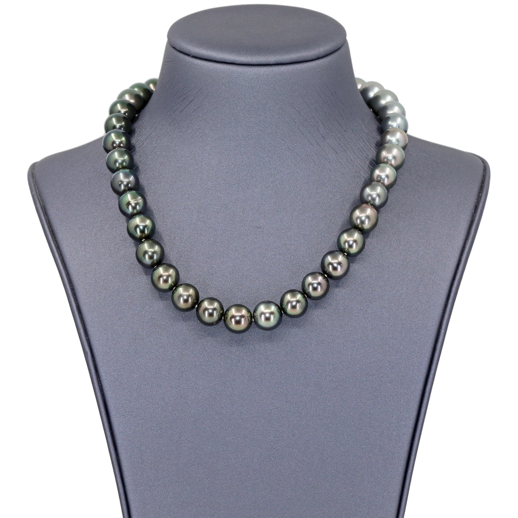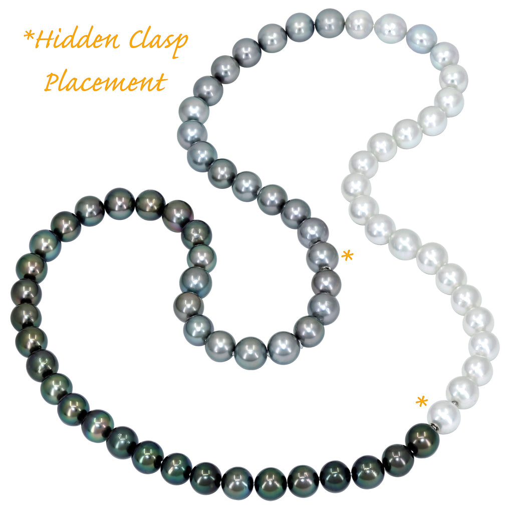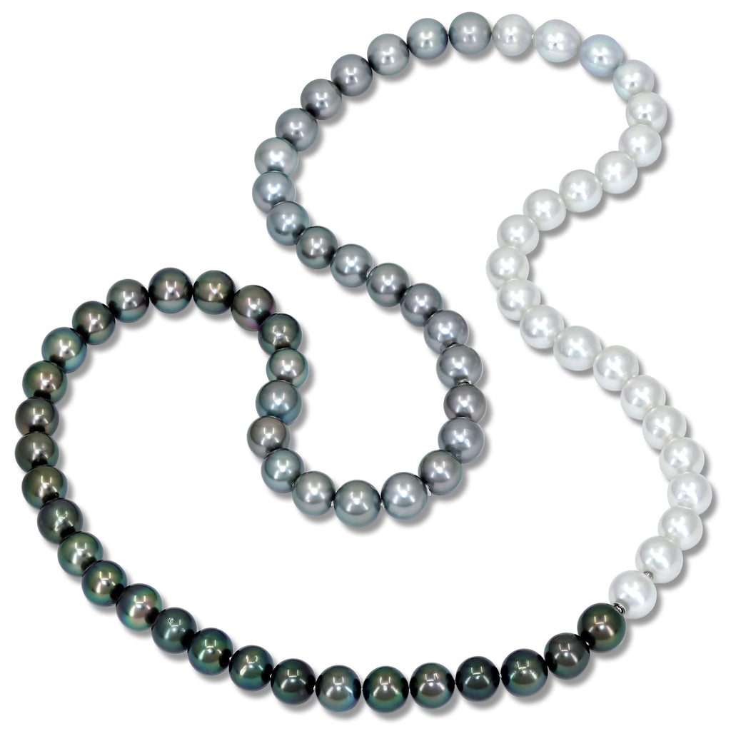 Versatility at its finest! This one-of-one Ombré Necklace can be worn a a number of ways - as pictured, it showcases a spectacular 34" strand of Ombré Tahitian and South Sea pearls, with 72 perfectly matched 11.5mm pearls that ascend in color from deep black Tahitians to lustrous white South Sea pearls. Hand-fabricated in Germany by award-winning jewelry maker Peter Schmid of the world-renowned Atelier Zobel, the necklace features two hidden pearl clasps that fully detach from the strand, offering the lucky owner the ability to wear the darker 17" Tahitian strand and/or the 16.5" lighter Tahitian and South Sea pearl strands individually. Stamped 925 Ni.