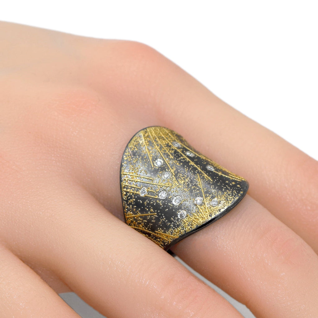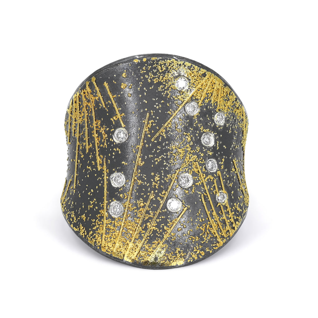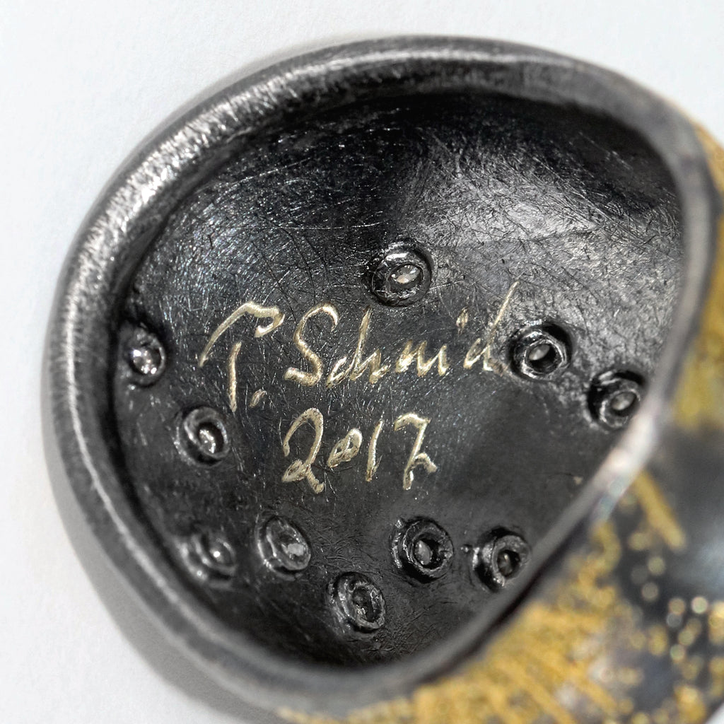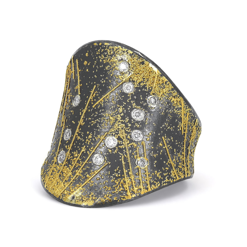 One of a Kind Ring handcrafted by master jewelry artist Atelier Zobel (Peter Schmid) featuring 0.11 total carats of round brilliant-cut white diamonds in oxidized sterling silver and 24k gold. Size 7.5. Stamped P. Schmid 2017 925 with the Atelier Zobel - Zo - hallmark.