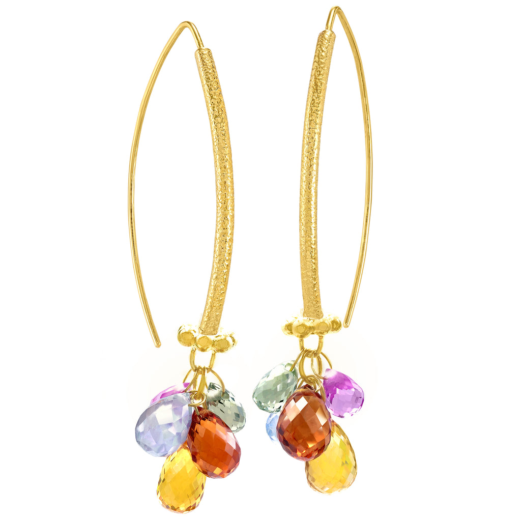 Navette Wire Earrings handcrafted by award winning jewelry maker Barbara Heinrich in signature finished 18k yellow gold featuring ten multicolored sapphires totaling 7.12 carats and accented with granulated navette-shaped ear wires. Stamped and Hallmarked