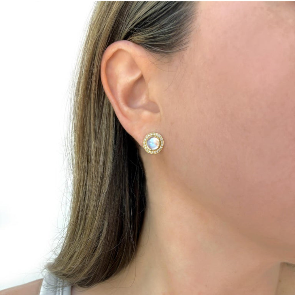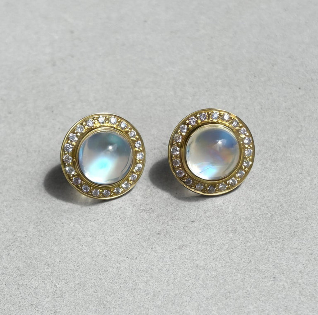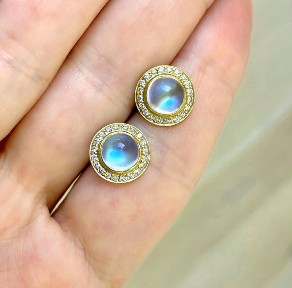 One of a Kind Button Stud Earrings handmade in matte-finished 18k yellow gold by jewelry artist Tej Kothari showcasing a gorgeous matched pair of vibrant rainbow moonstone cabochons surrounded by round white diamonds totaling 0.25 carats in weight. The studs are hand-fabricated in 18k yellow gold and finished with 18k yellow gold posts and backs. Stamped 18k / 750.