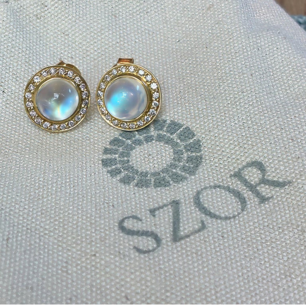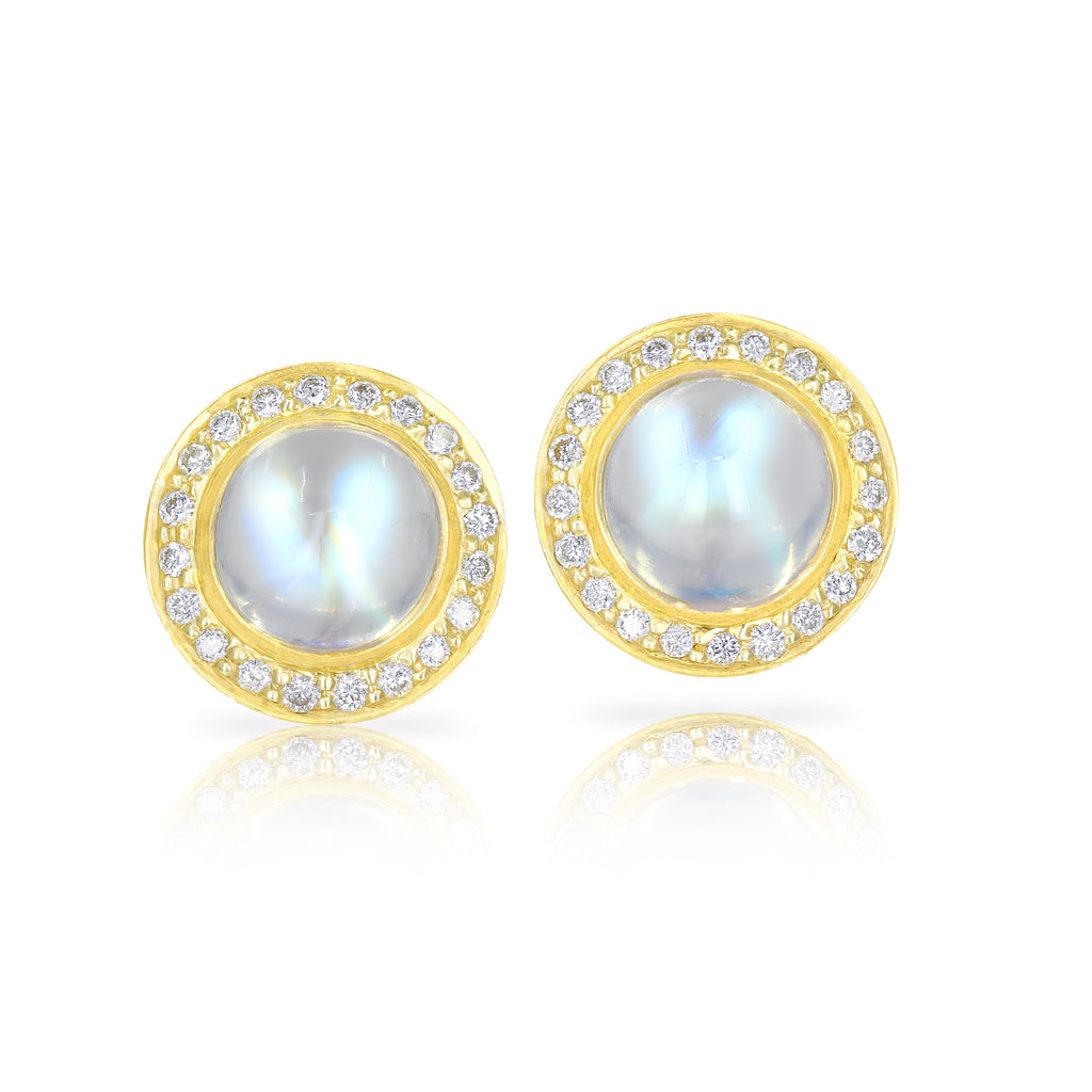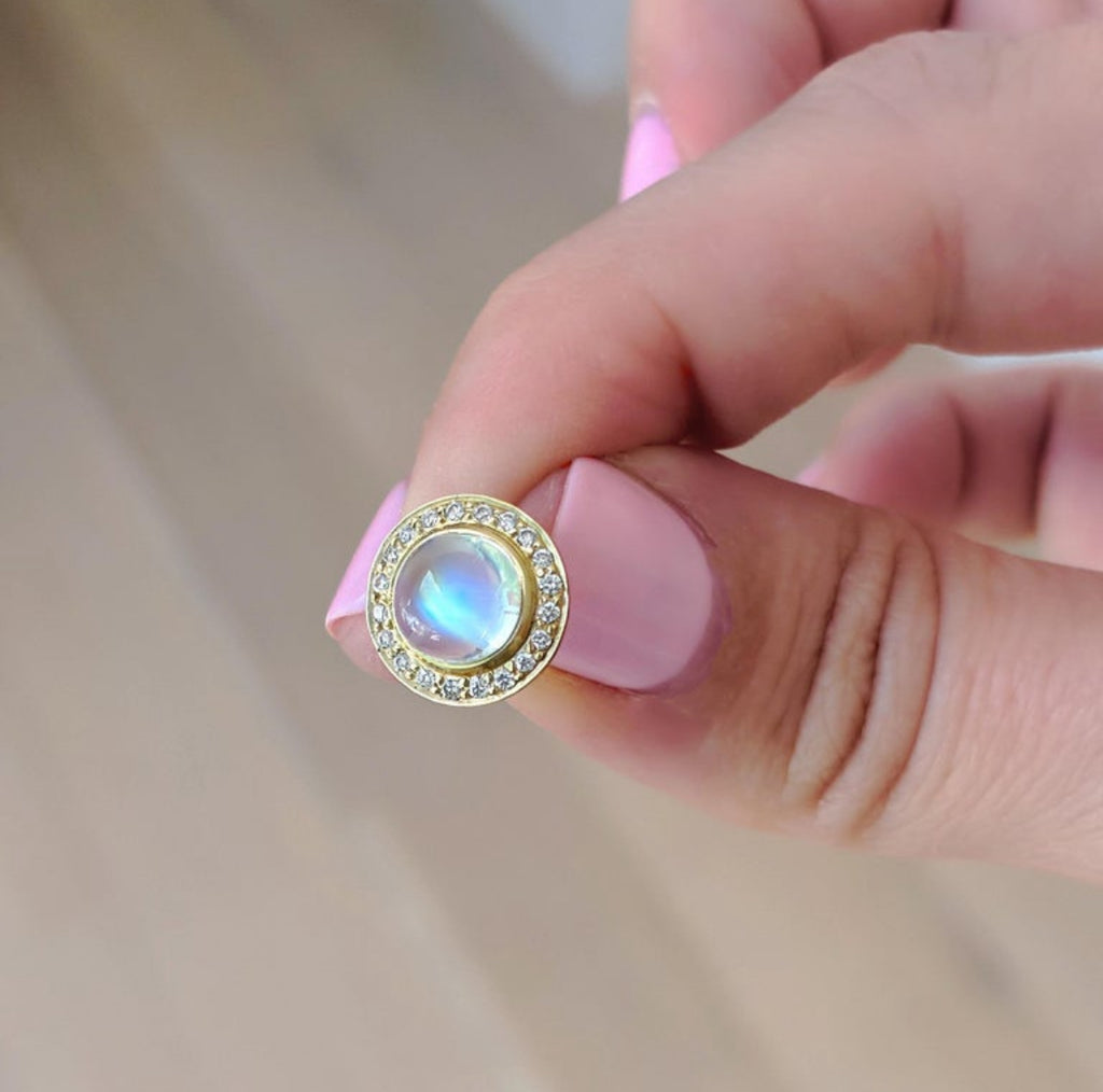 One of a Kind Button Stud Earrings handmade in matte-finished 18k yellow gold by jewelry artist Tej Kothari showcasing a gorgeous matched pair of vibrant rainbow moonstone cabochons surrounded by round white diamonds totaling 0.25 carats in weight. The studs are hand-fabricated in 18k yellow gold and finished with 18k yellow gold posts and backs. Stamped 18k / 750.