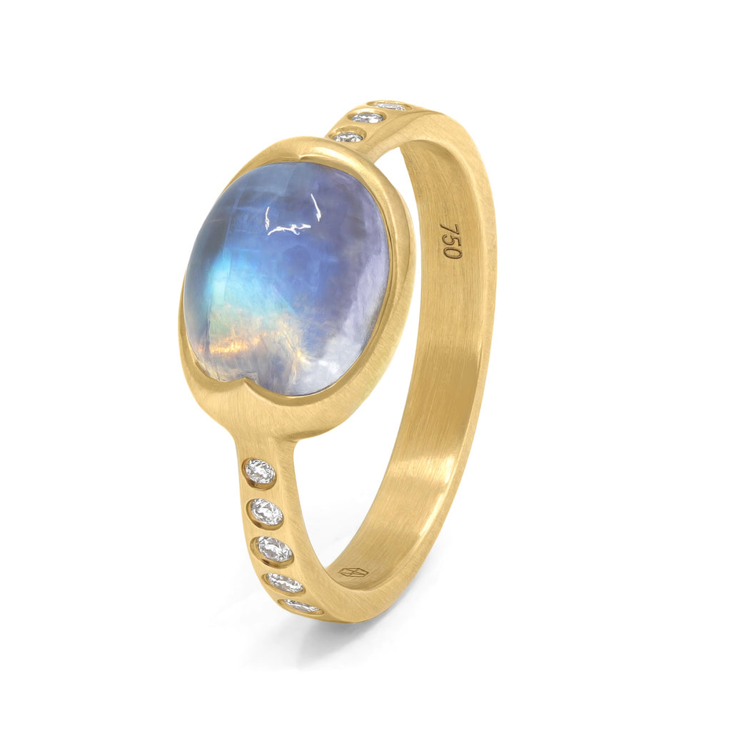Rainbow Moonstone Ring by jewelry designer Anahita in 18k yellow gold featuring a 3.7 total carat rainbow moonstone cabochon accented with pave diamonds totaling 0.19 carats. Ring can be sized.