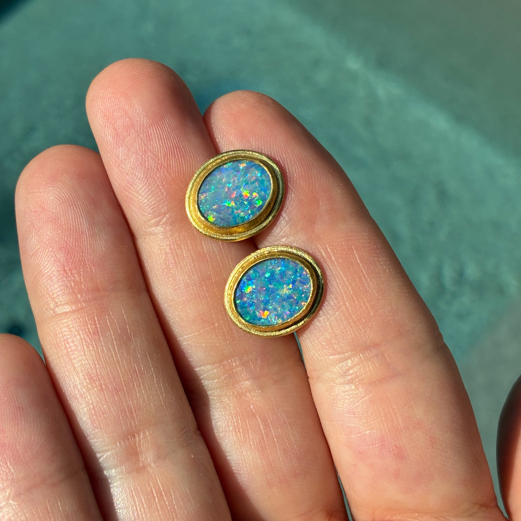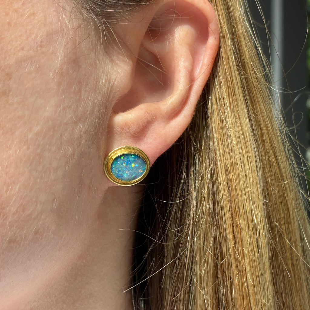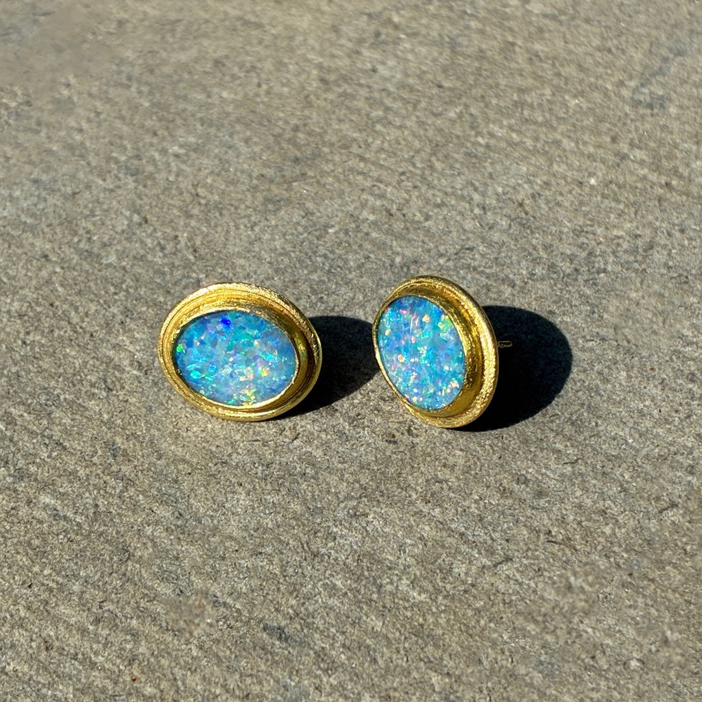 Opal Doublet Earrings handcrafted by acclaimed jewelry maker Petra Class featuring a fantastic matched pair of fiery Australian opal doublets, bezel-set and framed in the artist's intricately-textured 22k yellow gold and finished on 18k yellow gold posts. Stamped and Hallmarked 18k / 22k / PC