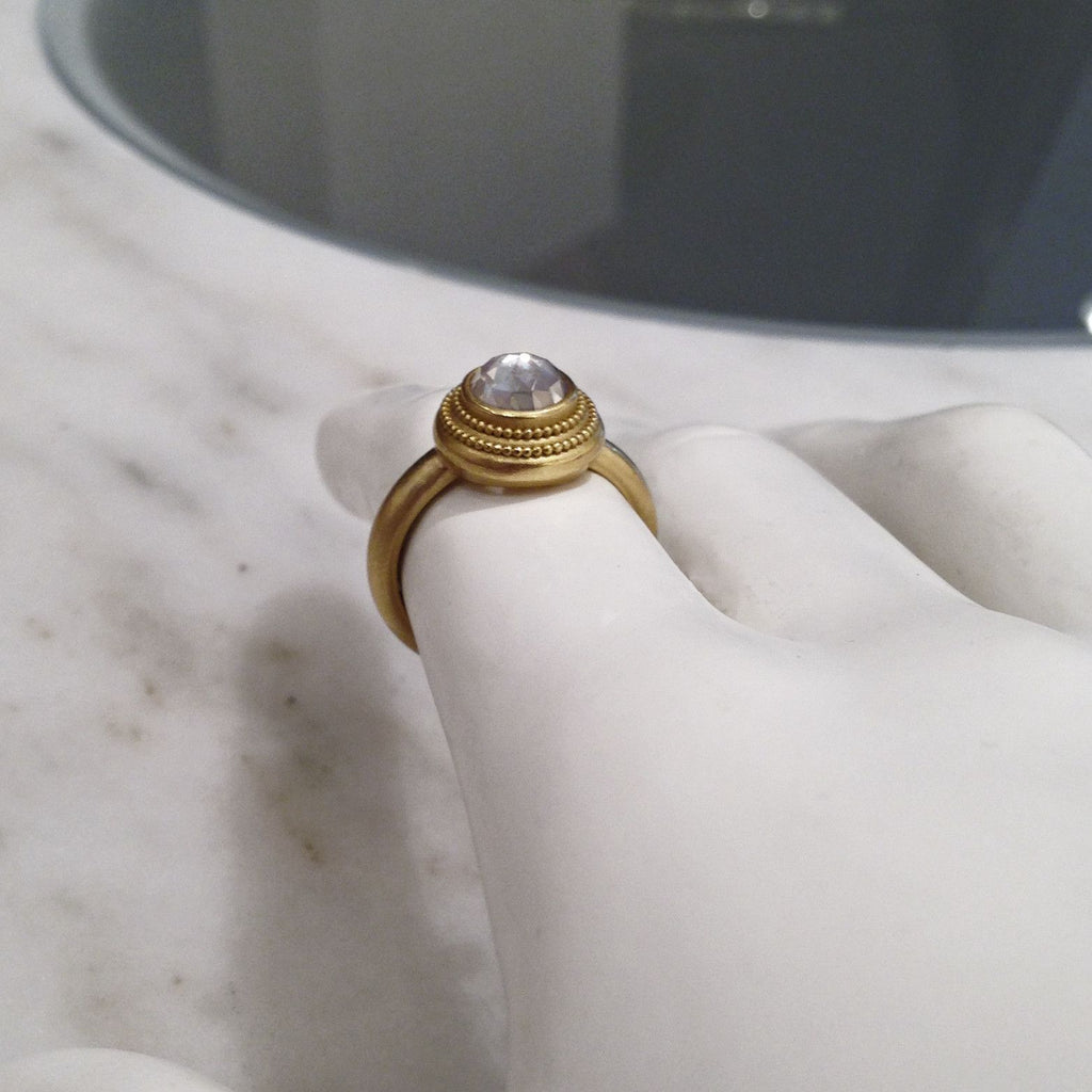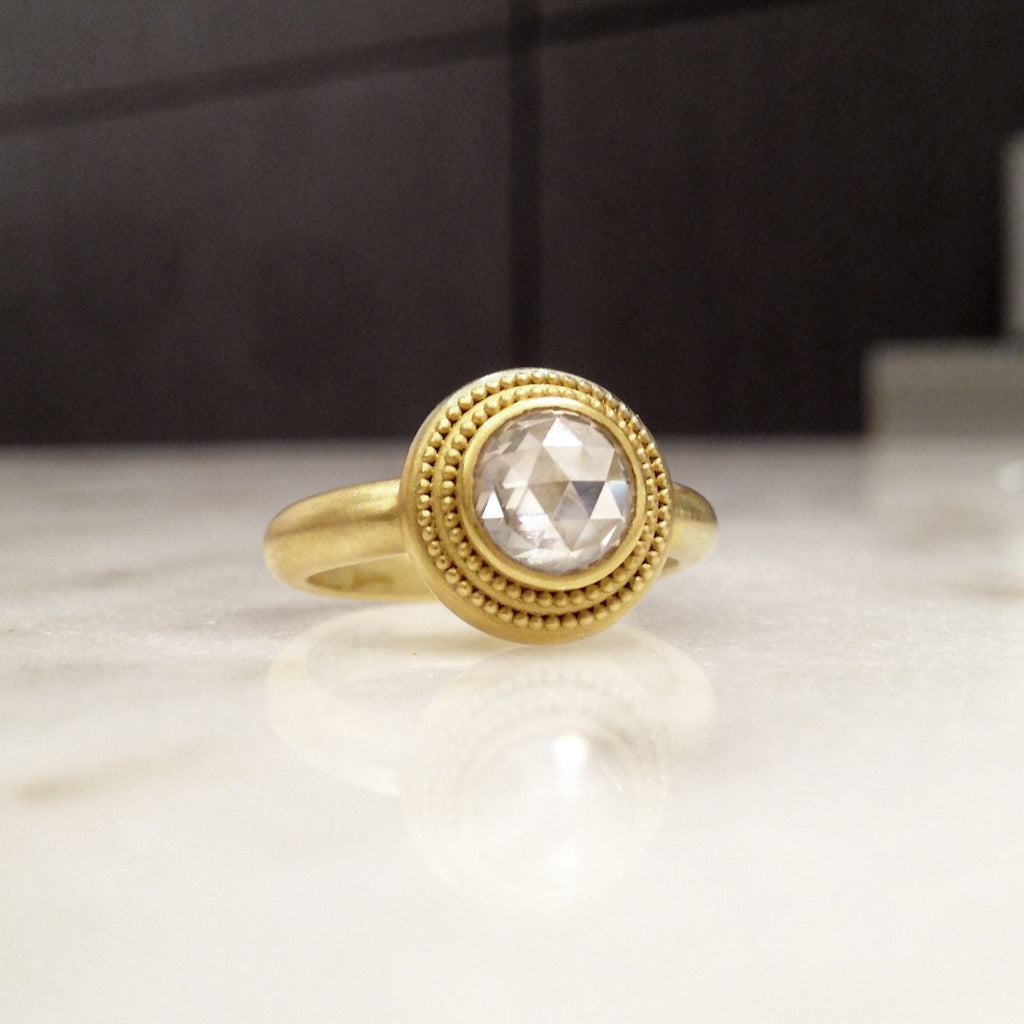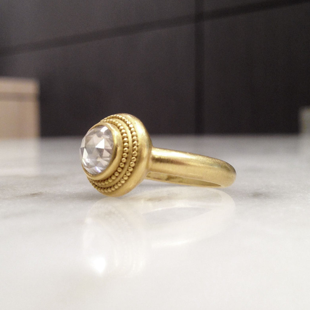 One-of-a-Kind Ring handcrafted in 22k yellow gold with a shimmering 1.22 carat rose-cut white diamond with handmade 22k gold granulated accents and a 20k yellow gold shank. Size 6.5 (Can be Sized).