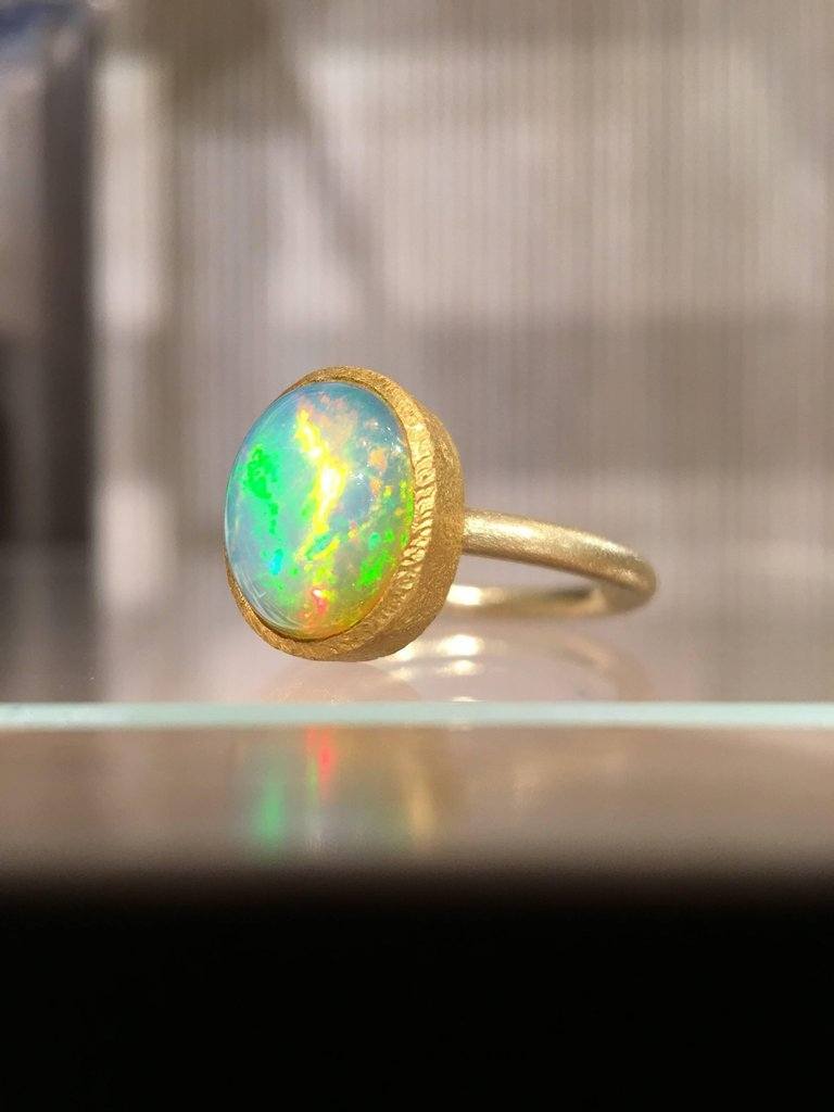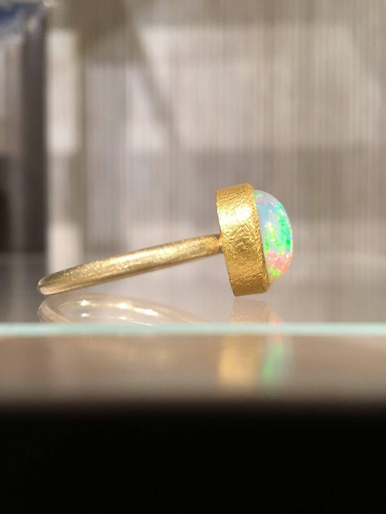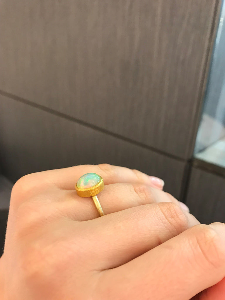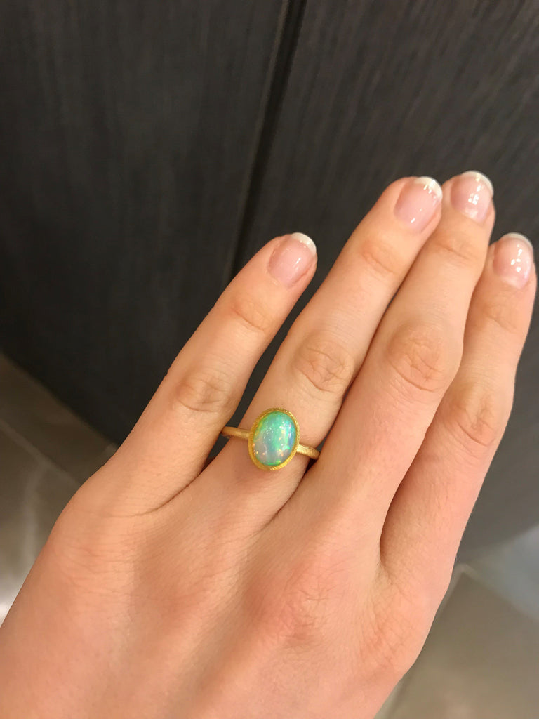 One of a Kind Ring handcrafted by acclaimed jewelry designer Devta Doolan featuring a breathtaking, completely natural translucent Ethiopian white opal (10mm x 7.5mm) with strong primary flashes of electrifying green, orange and pink complemented with intense flashes of blue, violet, red, yellow, and more. The gem is bezel-set in highly-textured 22k yellow gold on an 18k yellow gold band. The ring is currently a size 6.5 but can be sized upon request. Stamped and hallmarked 22k / 18k / 2016 with Devta's signature.