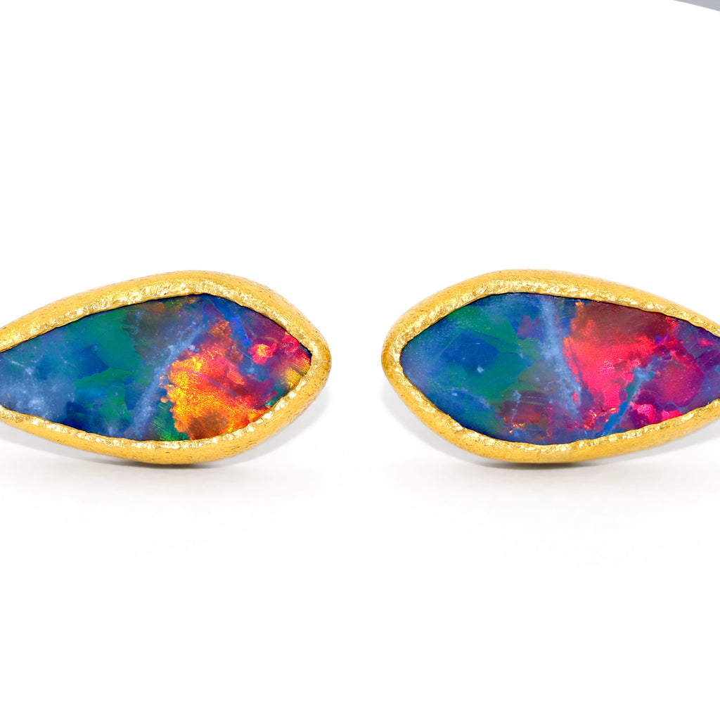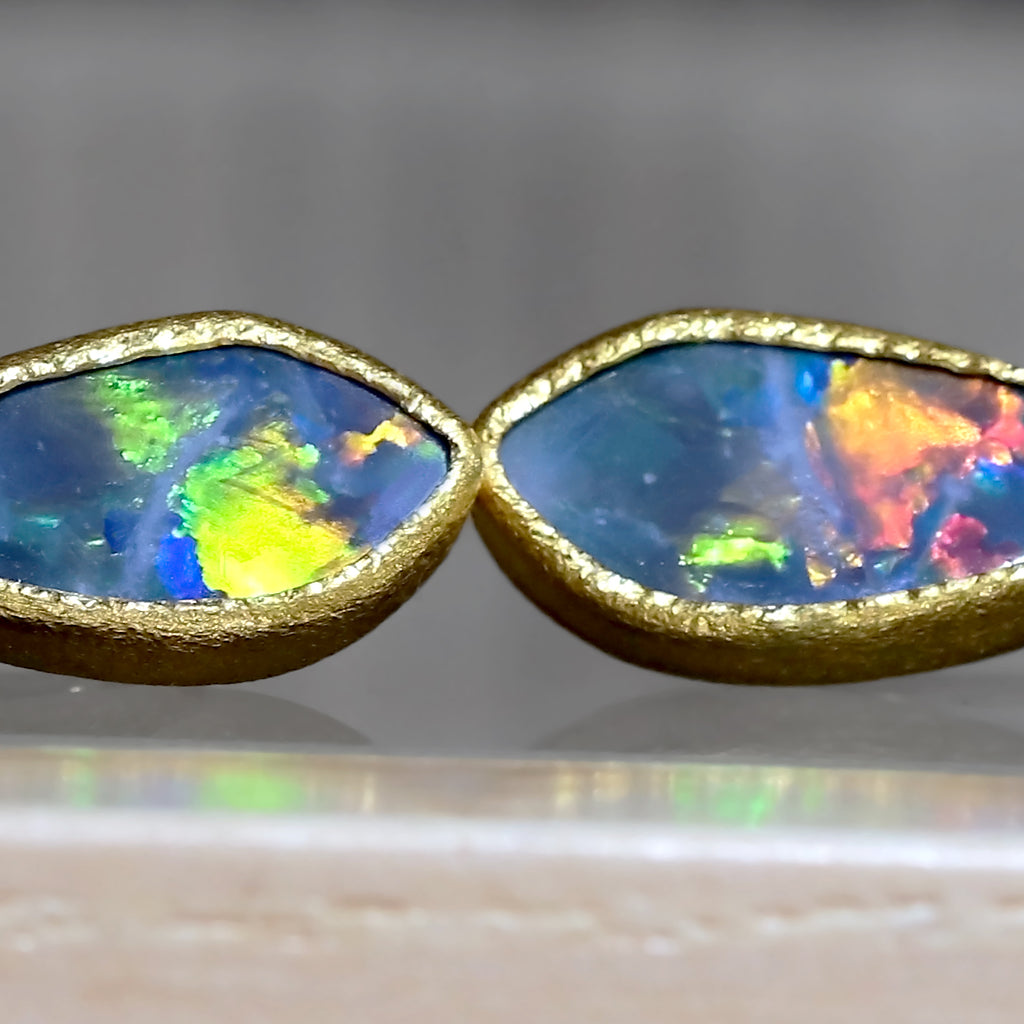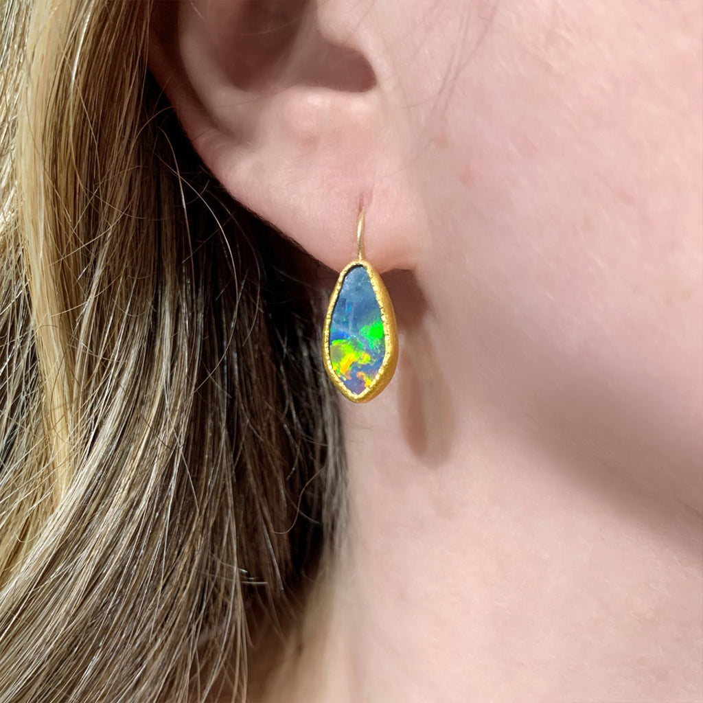 One of a Kind Earrings handcrafted by acclaimed jewelry maker Devta Doolan in signature finished 22k yellow gold showcasing a beautiful matched pair of Australian blue opal doublets with neon green, orange and red primary flash. Finished on 18k yellow gold ear wires. Stamped and Hallmarked.
