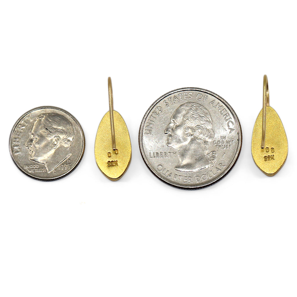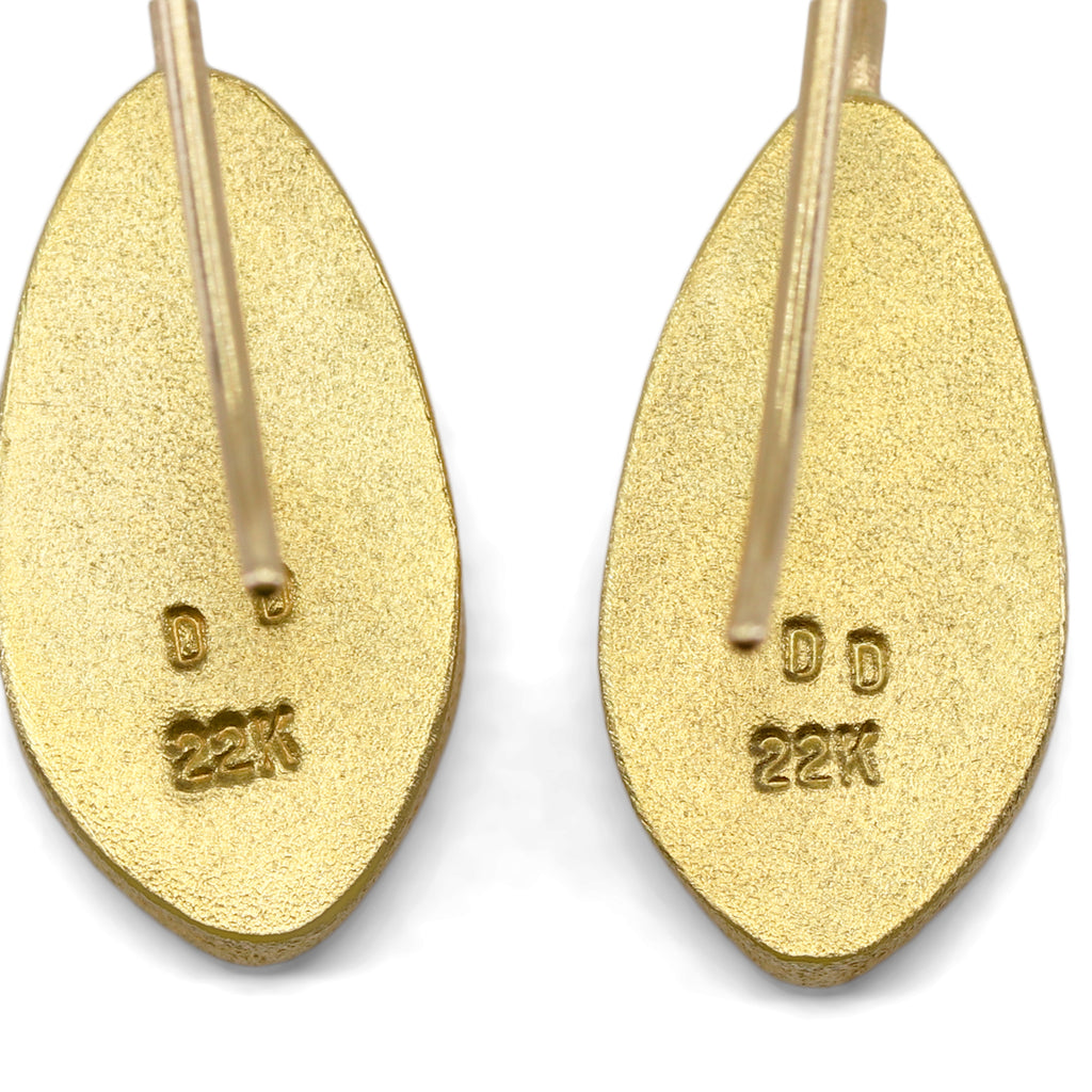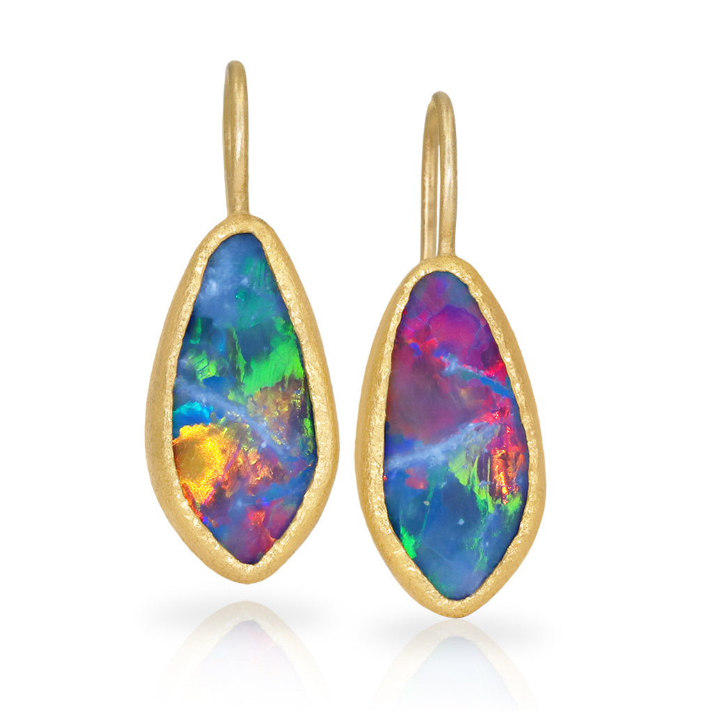 One of a Kind Earrings handcrafted by acclaimed jewelry maker Devta Doolan in signature finished 22k yellow gold showcasing a beautiful matched pair of Australian blue opal doublets with neon green, orange and red primary flash. Finished on 18k yellow gold ear wires. Stamped and Hallmarked.