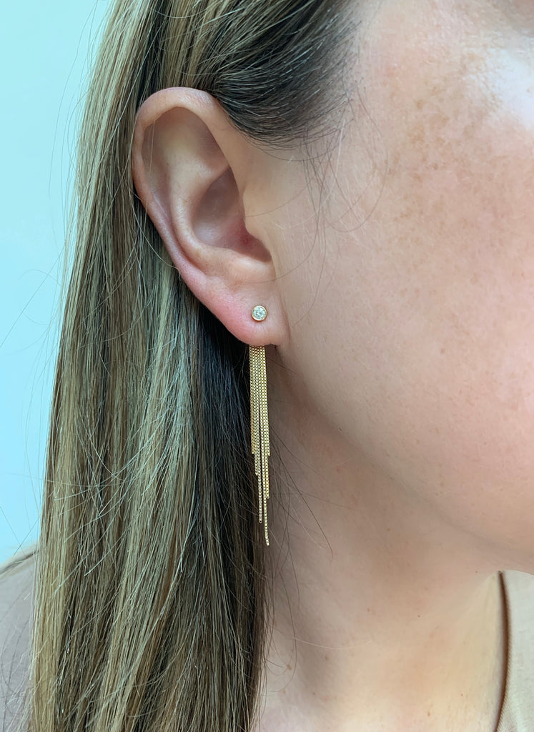 Bianca Drop Earrings in 14k gold featuring bezel set round diamond studs totaling 0.18 carats with shimmering liquid gold chain fringe backings. Earring length 2”.
