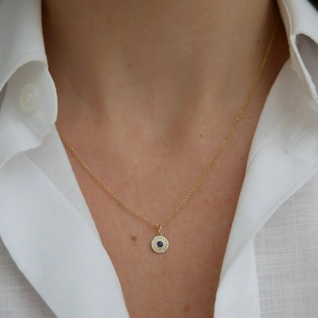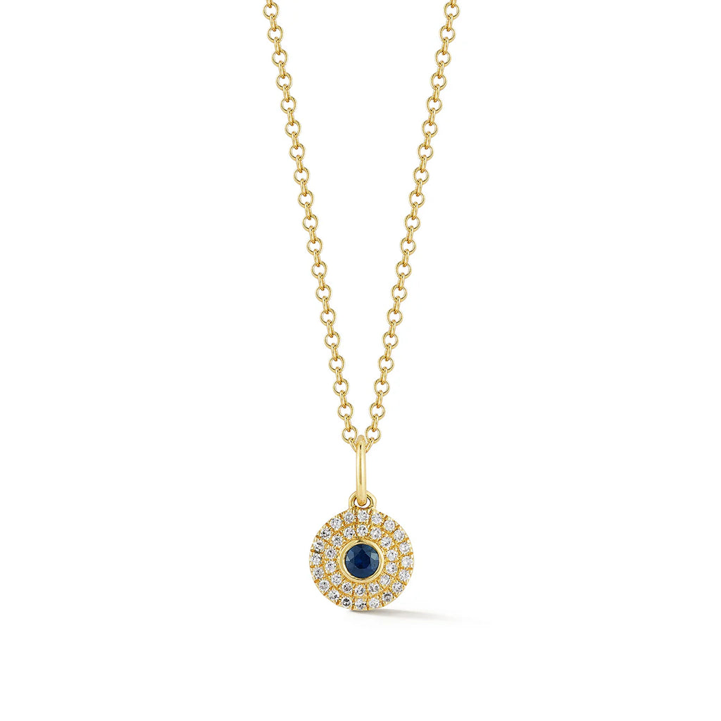 Gem Necklace featuring a round blue sapphire center stone totaling 0.07 carats encircled with two rows of pave diamonds totaling 0.08 carats set in 14k yellow gold.