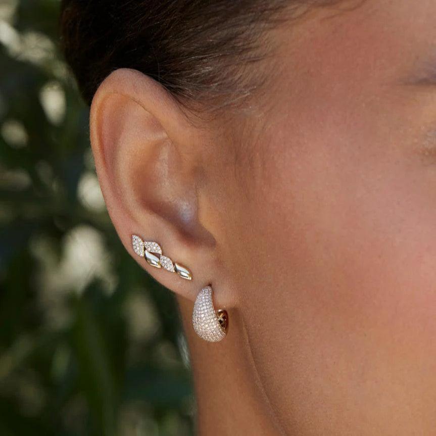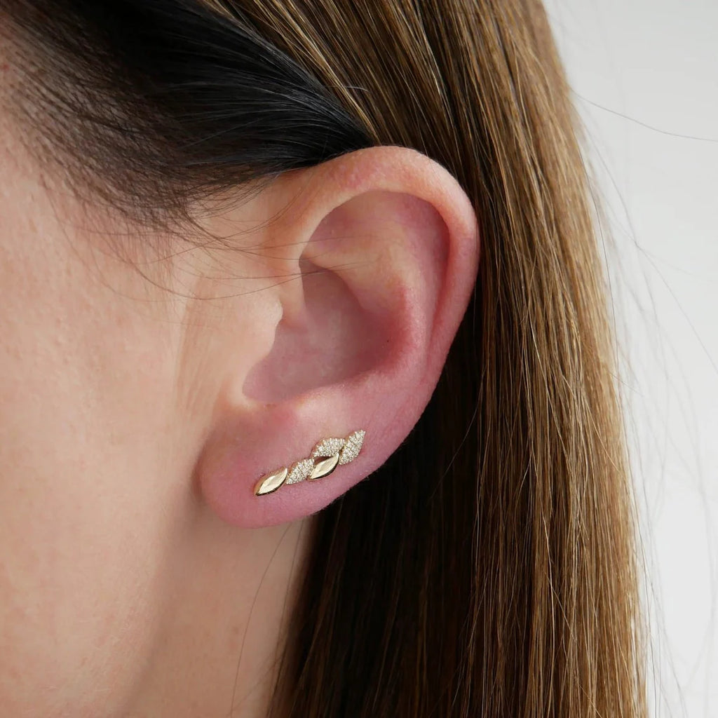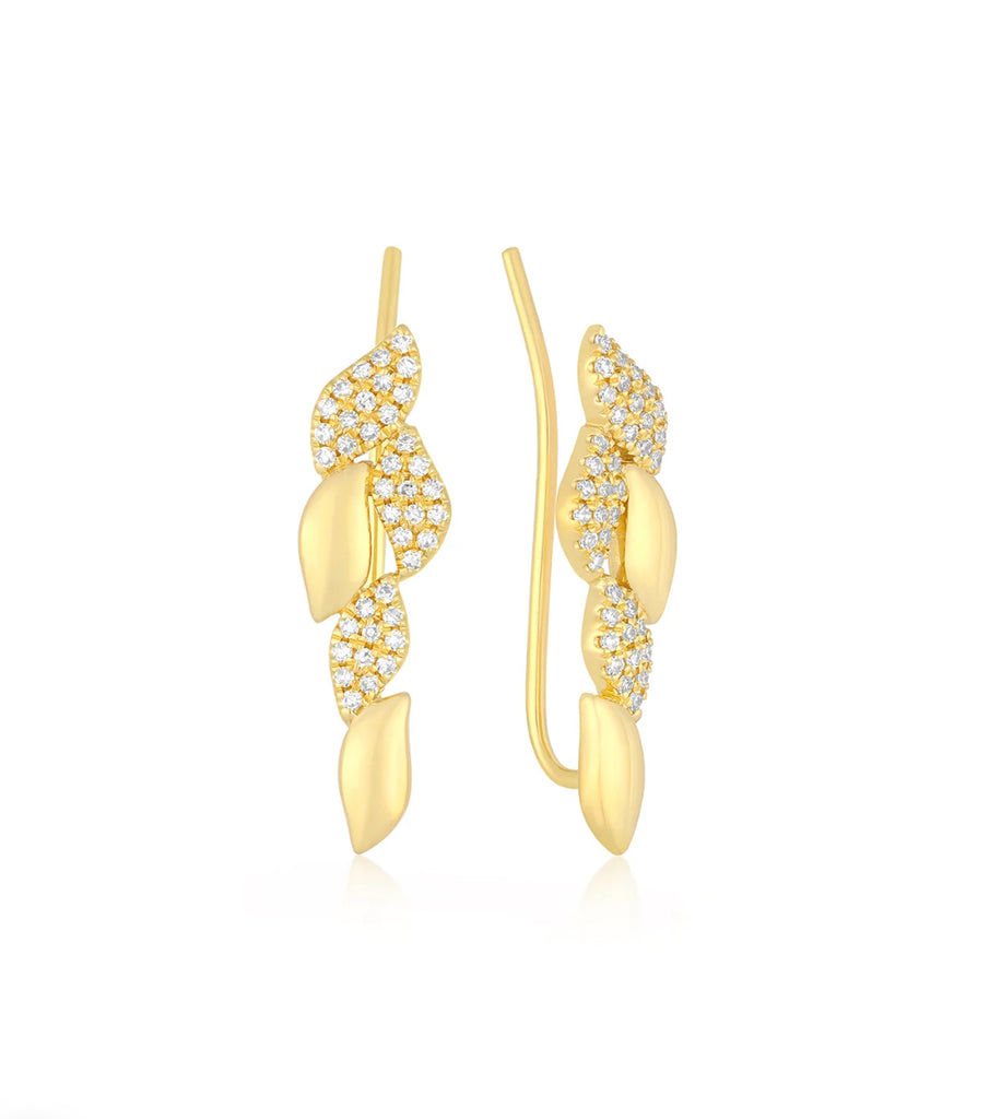 Leaf Ear Climber Earrings set in 14k yellow gold featuring gold and diamond leaves totaling 0.16 carats. Designed to climb up the ear lobe. 20 mm height.