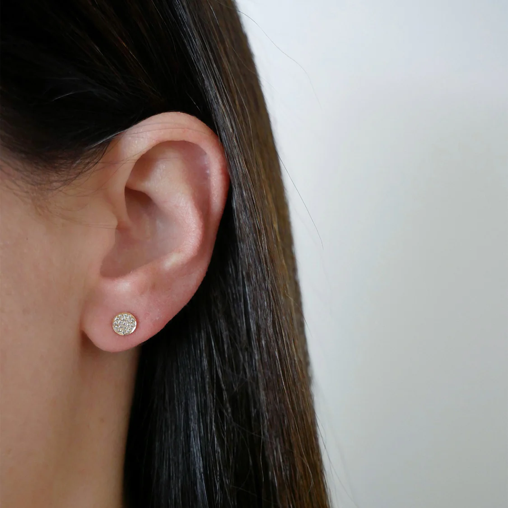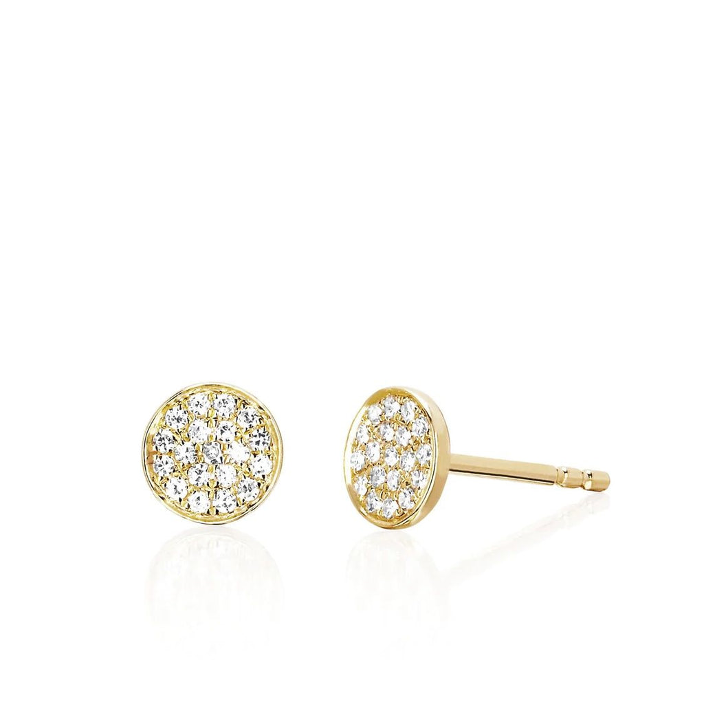Diamond mini disc stud earrings featuring .14 carats of diamond set in 14k yellow gold. Also, available in 14k white gold and 14k rose gold.