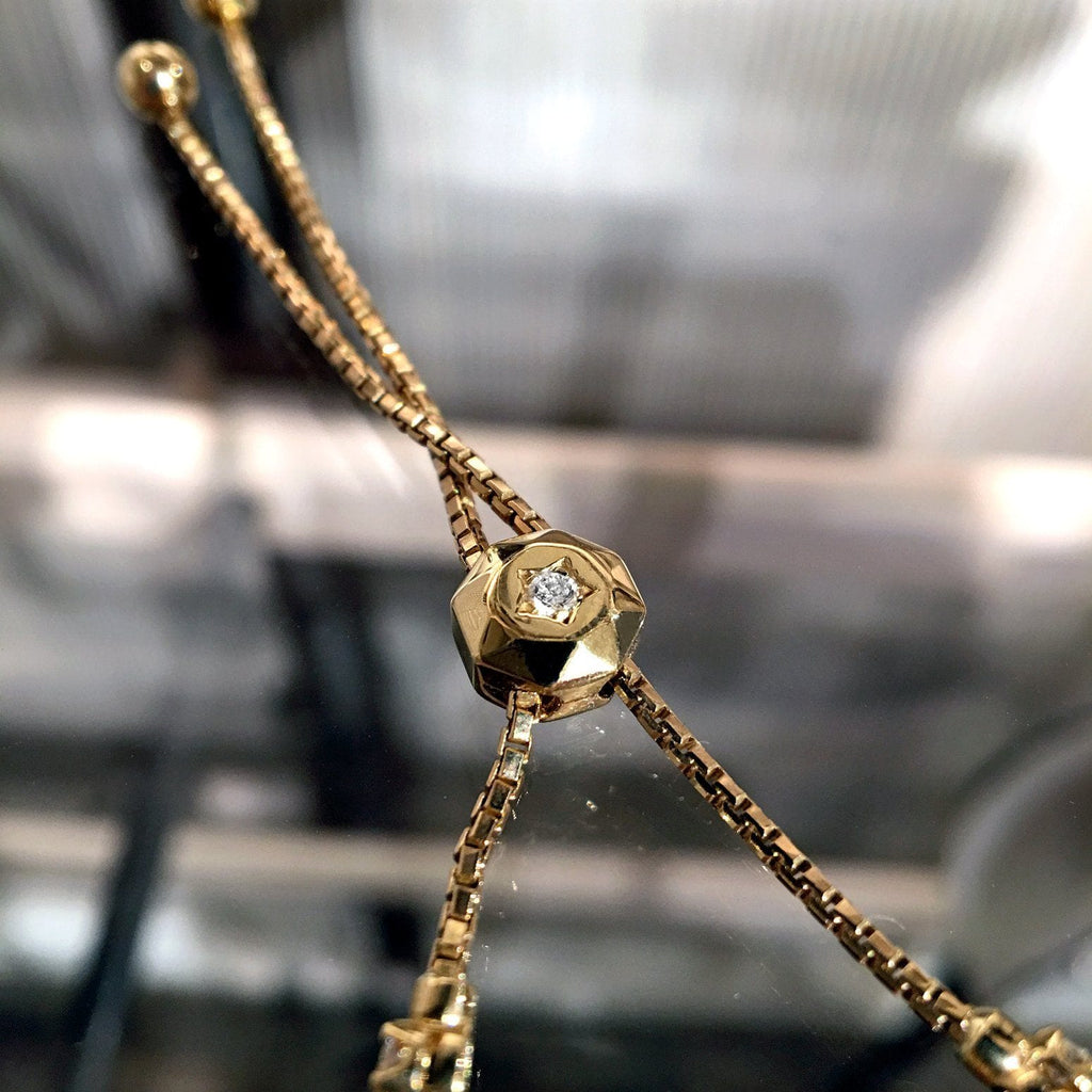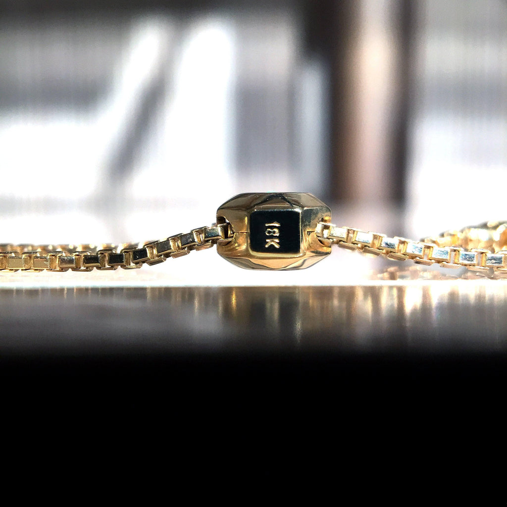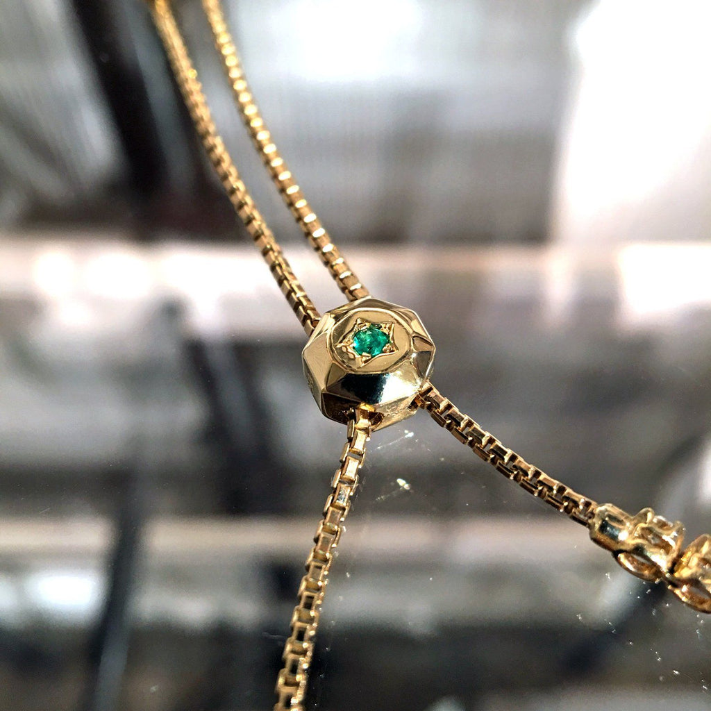 One of a Kind Bolo Bracelet handmade in 18k yellow gold by jewelry designer Fern Freeman featuring 0.45 carats of round brilliant-cut emerald and round brilliant-cut white diamonds totaling 0.96 carats. The solid 18k gold faceted bolo element slides on a sturdy 18k gold box chain and features a single emerald on one side and a single diamond on the other, each set in an engraved star. Wearable between 5.5 and 9.0 inches - Stamped 18k