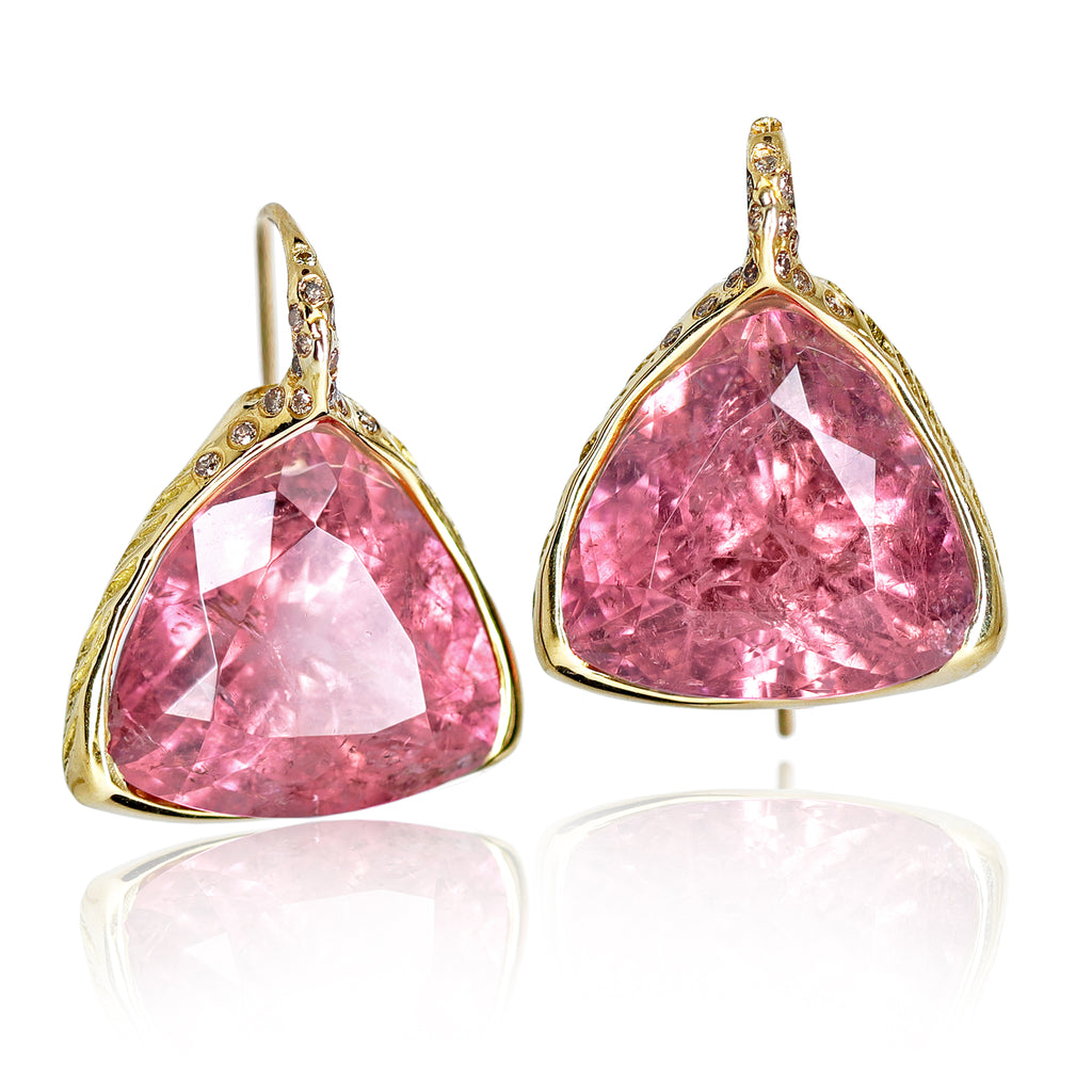 This color!! Trillion Earrings hand-fabricated by jewelry artist Kika Alvarenga in 18k yellow gold featuring a spectacular, incredibly rare matched pair of large trillion-cut pink tourmaline totaling 36 carats and accented with round brilliant-cut cognac diamonds.