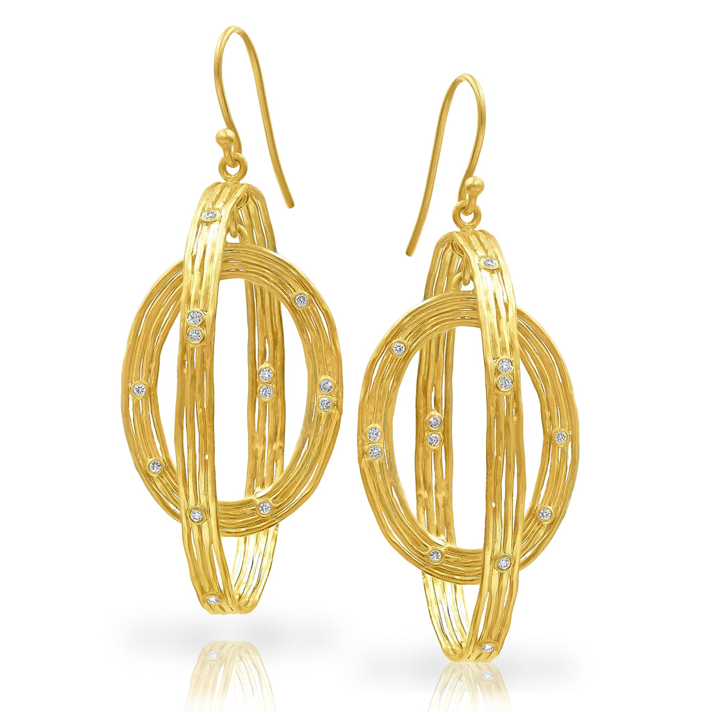 Double Ripple Hoop Dangle Drop Earrings handcrafted in signature-finished 18k yellow gold by Tej Kothari featuring thirty round brilliant-cut white diamonds totaling 0.18 carats.
