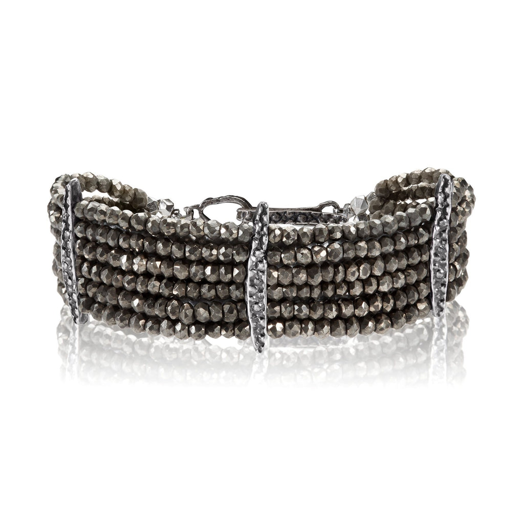 Stingray Bracelet handcrafted by jewelry designer Lauren Wolf featuring six strands of pyrite accented with silver stingray spacers and hook clasp.