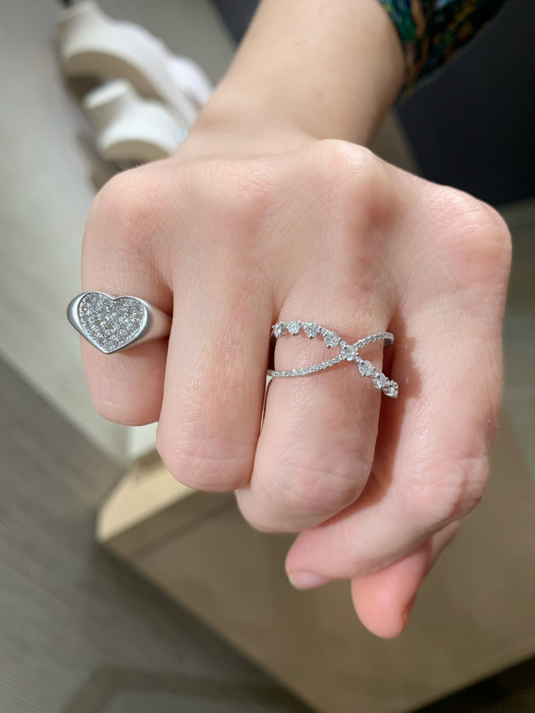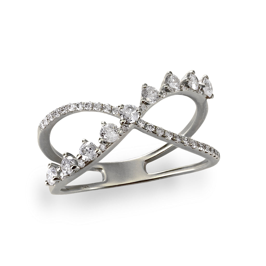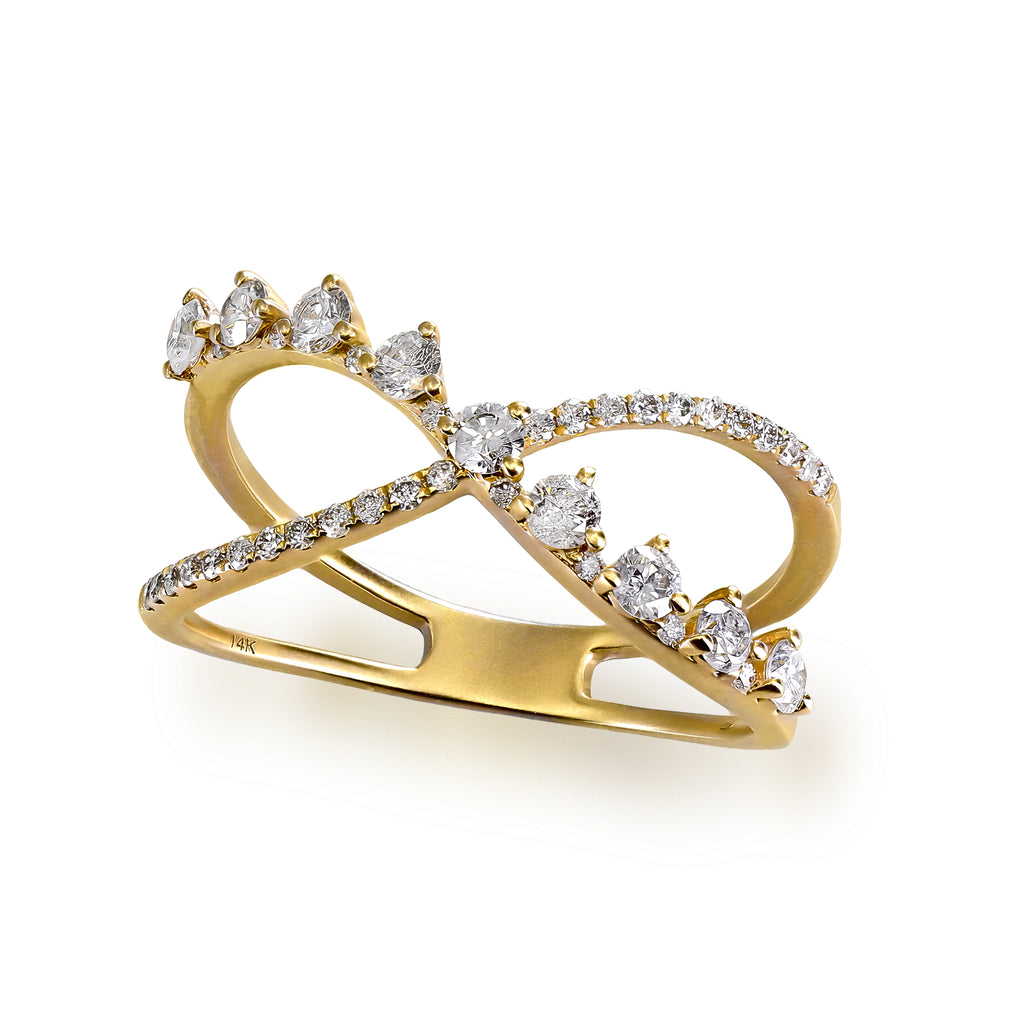 Criss Cross Ring by jewelry designer Liza Beth featuring prong set diamonds and pave diamonds set in 14k gold. Available in white gold or yellow gold. Size 7.