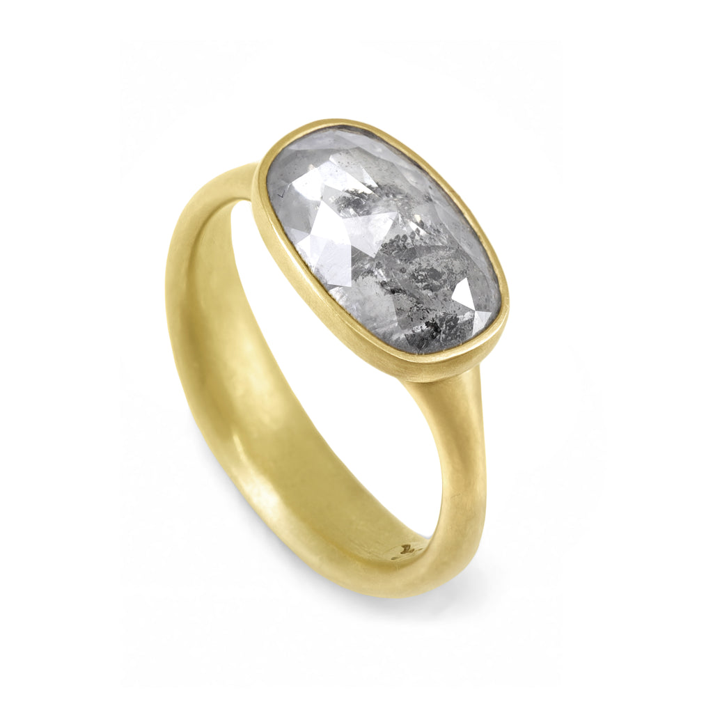 One of a kind ring hand-fabricated by acclaimed jewelry maker Lola Brooks showcasing a shimmering 3.07 carat faceted silver diamond oval set in Lola's signature-finished 18k yellow gold. Size 6.75. Stamped and Hallmarked. Can be sized.