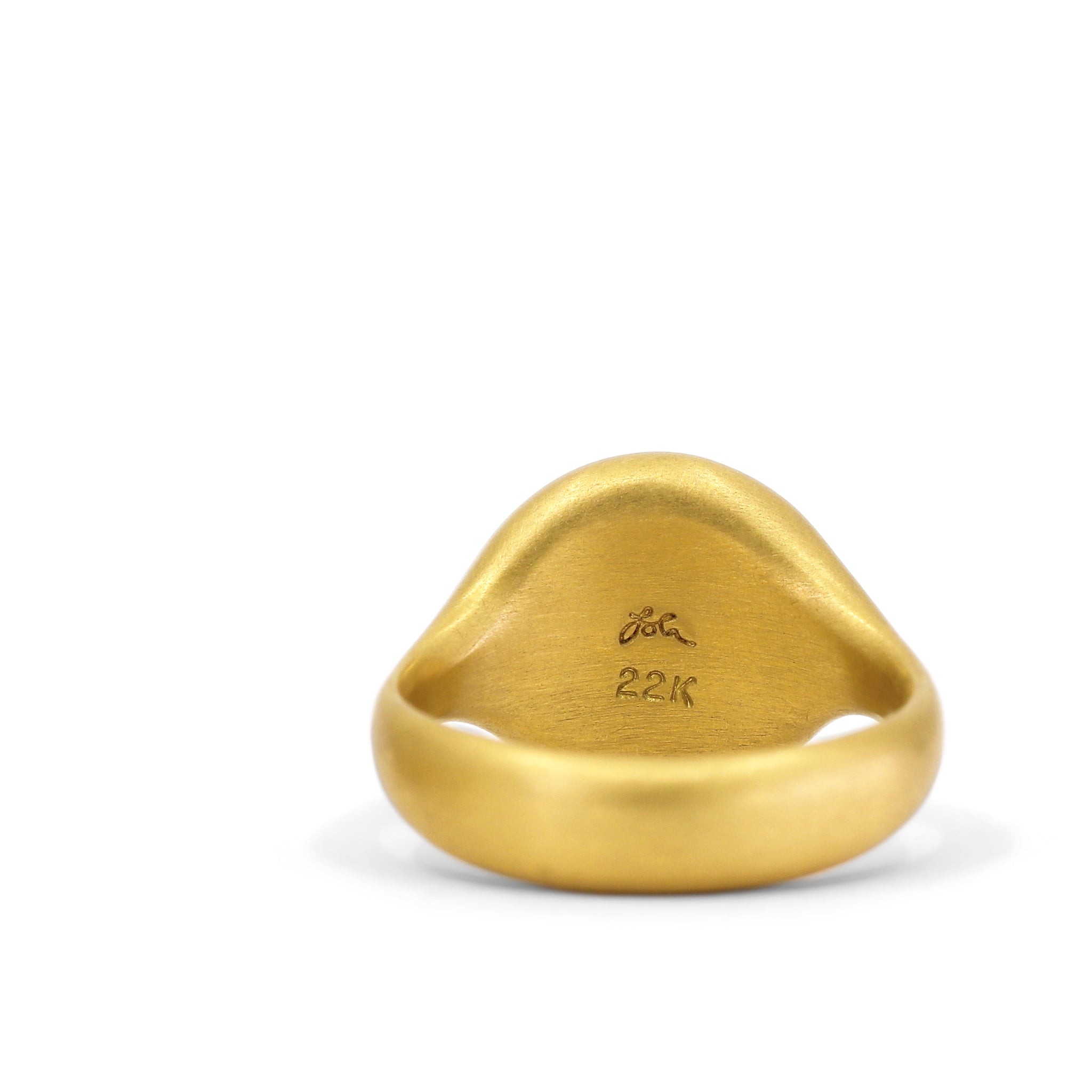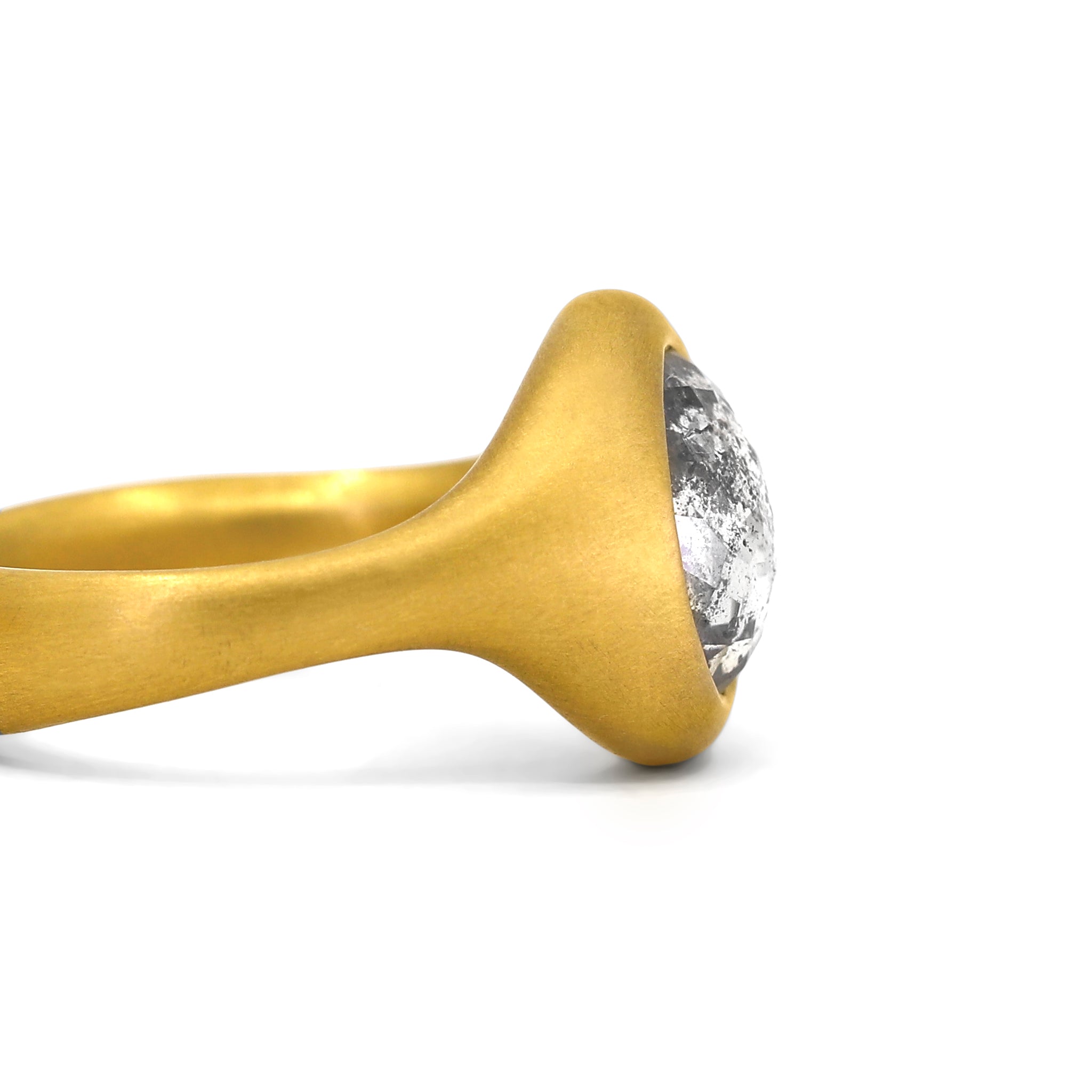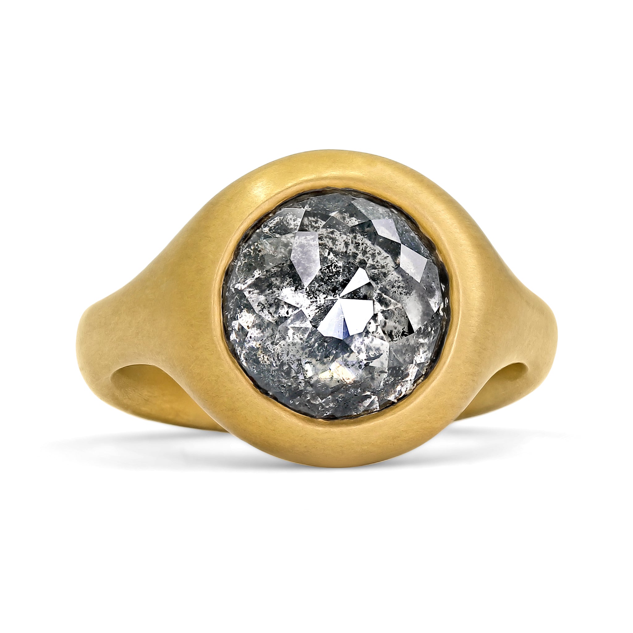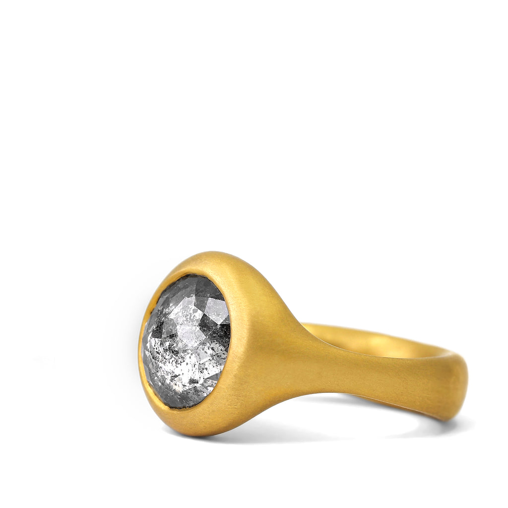 One of a Kind Solitaire Ring hand-fabricated by jewelry maker Lola Brooks featuring a gorgeous, shimmering 4.23 carat round multi-faceted white and black salt and pepper diamond, bezel-set and framed in the artist's signature heavy cast and matte-finished 22k yellow gold. Size 6.5. Stamped and Hallmarked.