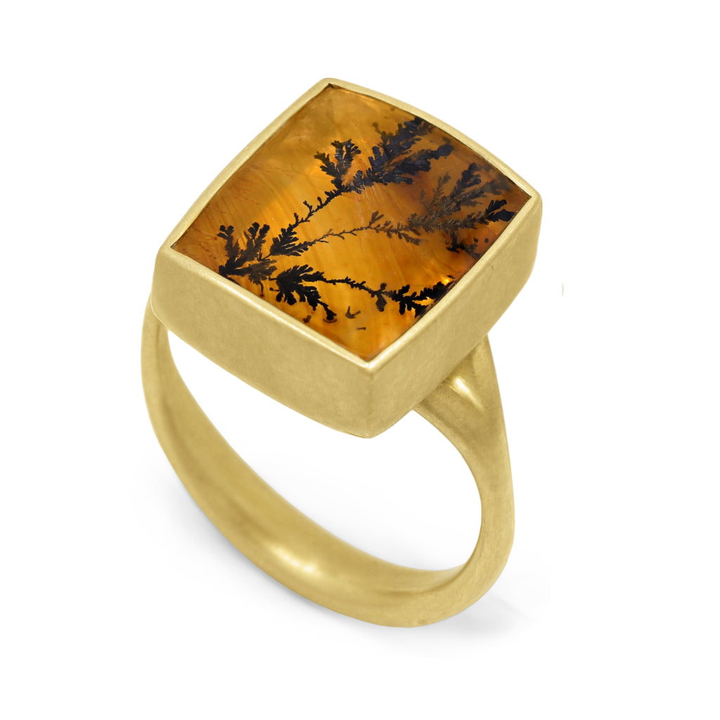 One of a kind ring hand-fabricated by acclaimed jewelry maker Lola Brooks in the artist's signature-finished 18k yellow gold showcasing a stunning and distinctive 7.11 carat natural amber dendritic quartz cushion. Size 6.25. Stamped and Hallmarked. Can be sized.