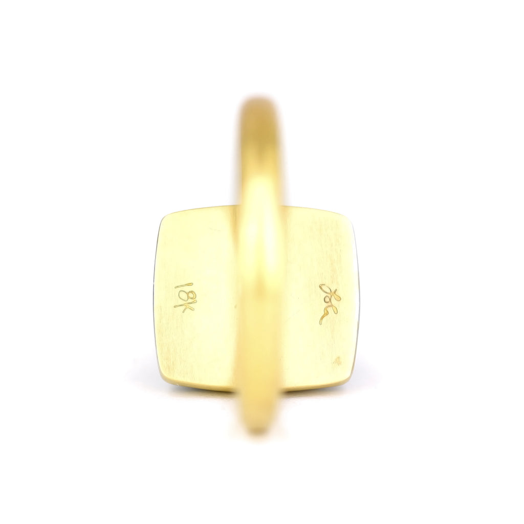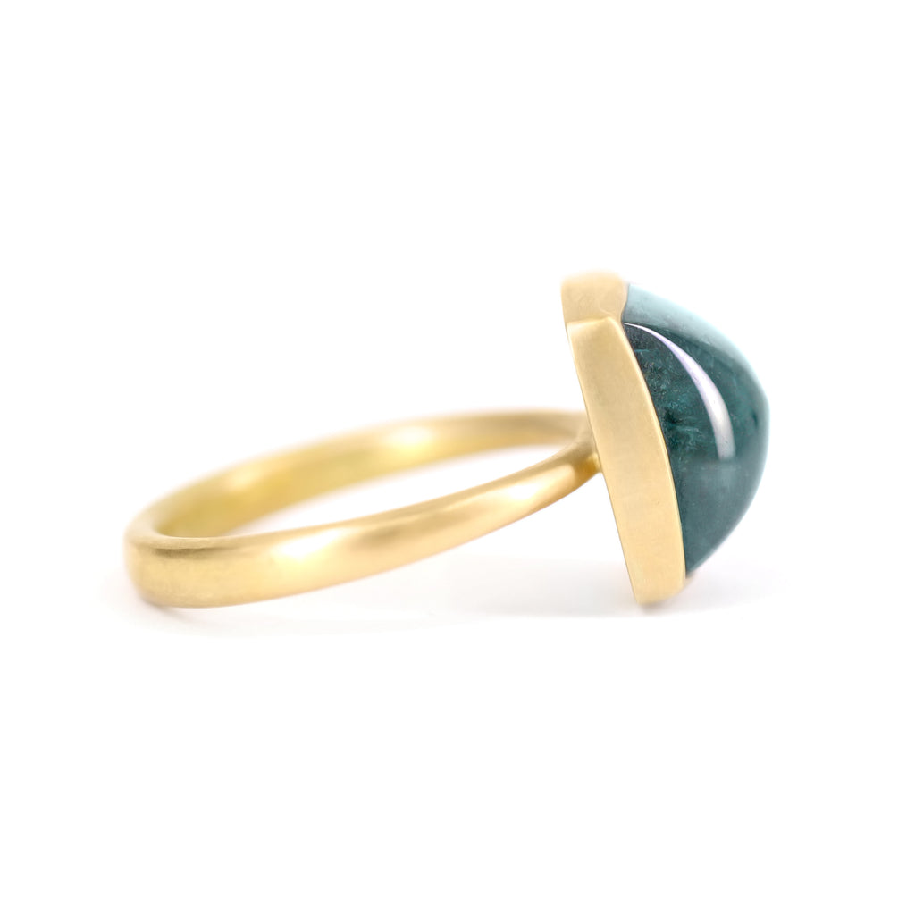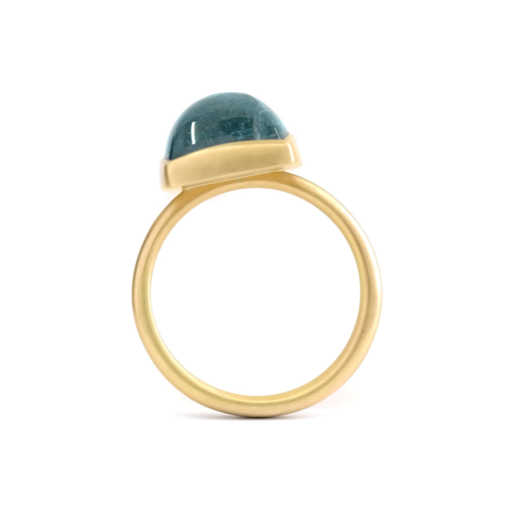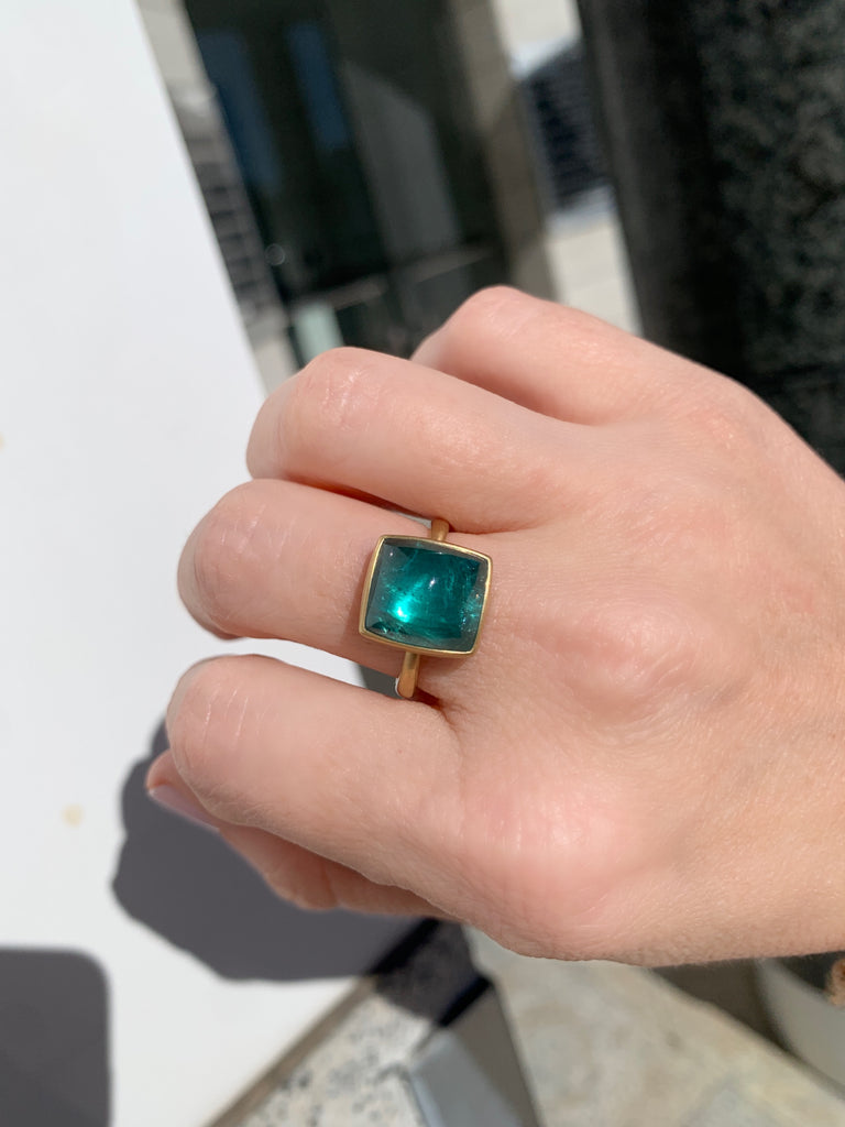 One of a kind ring hand-fabricated by acclaimed jewelry maker Lola Brooks in the artist's signature-finished 18k yellow gold featuring a magical, glowing 9.29 carat greenish-blue indicolite tourmaline cushion cabochon on a tapered 18k yellow gold band. Stamped and Hallmarked. Can be sized.