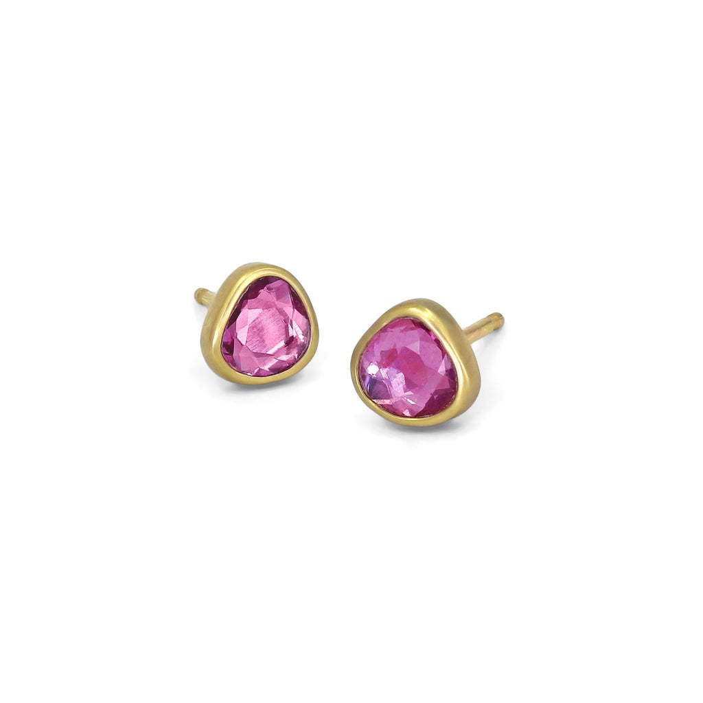 One of a Kind Stud Earrings hand-fabricated by acclaimed jewelry artist Lola Brooks showcasing a gorgeous pair of natural faceted deep pink sapphires totaling 1.18 carats, sit in the makers signature satin-finished 18k yellow gold and finished with 18k yellow gold posts and backs. Stamped and Hallmarked.