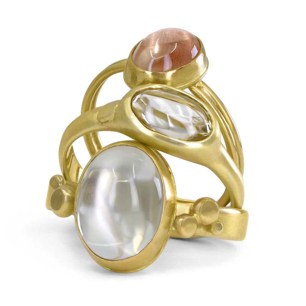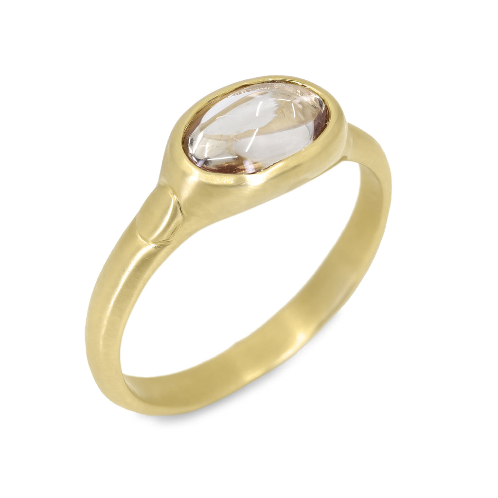 Ring hand-fabricated by acclaimed jewelry maker Monica Marcella in the artist's signature-finished 18k yellow gold showcasing a glowing peachy champagne oval topaz cabochon with Espejo Milagro carved.