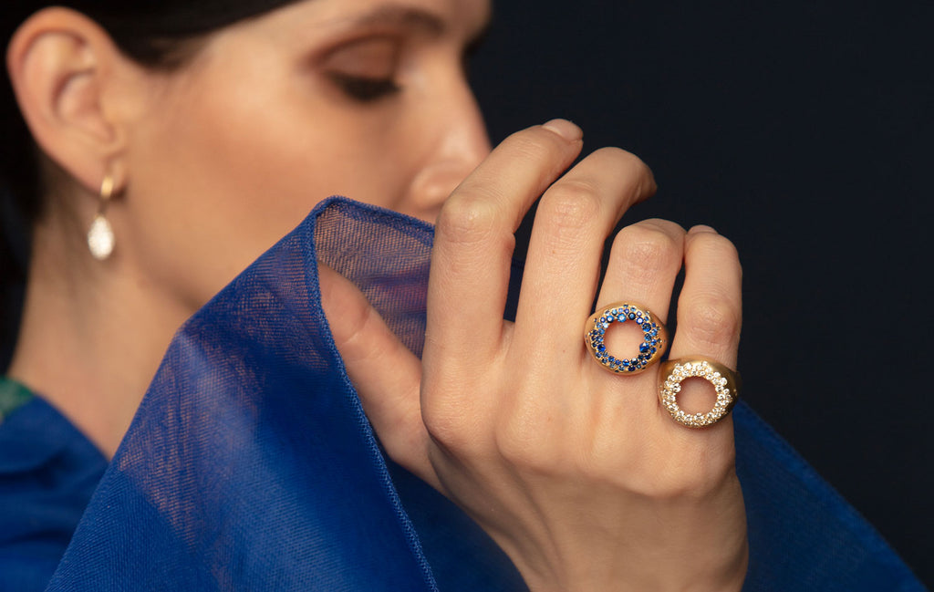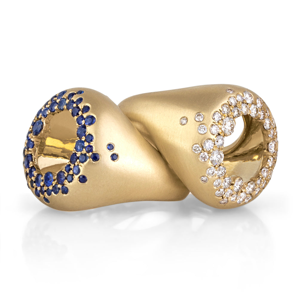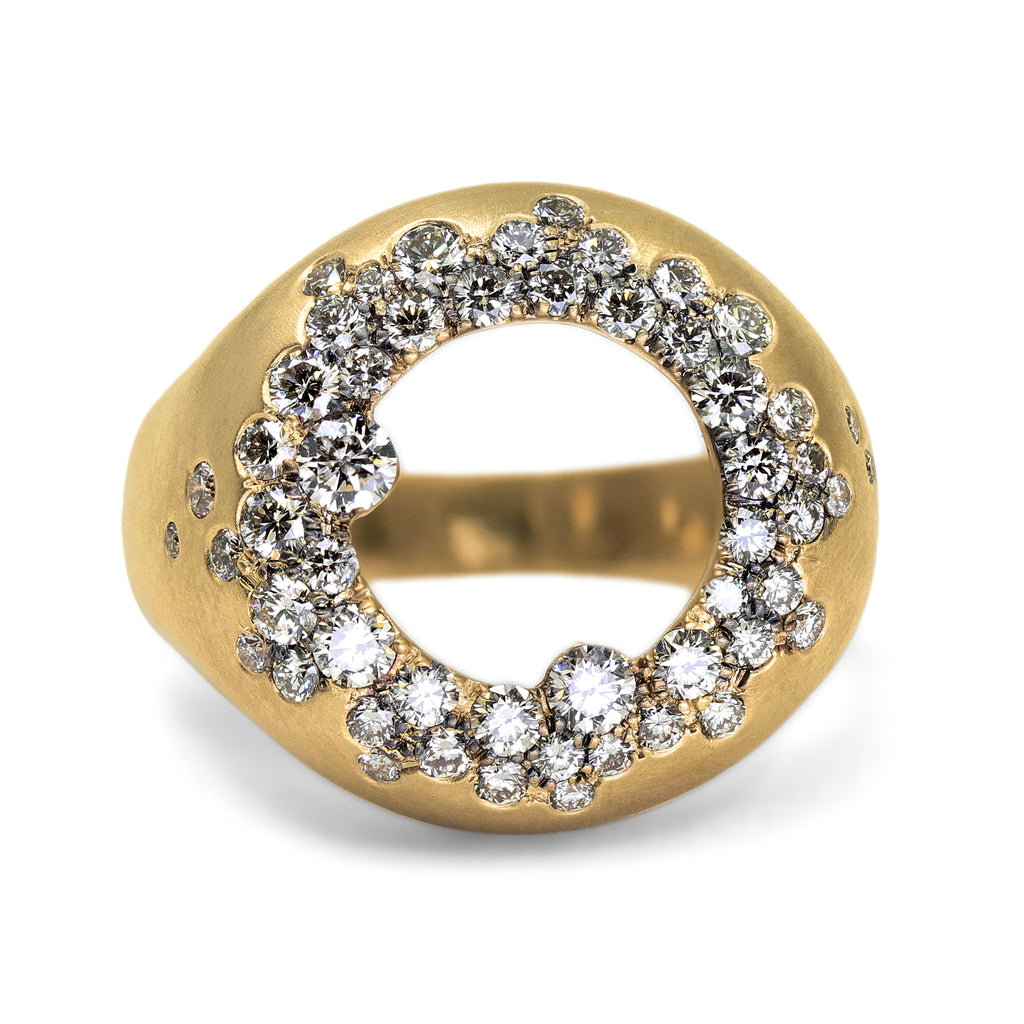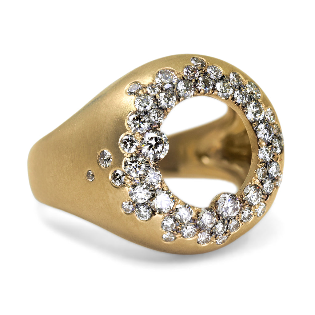 Open Sheer Ring by award-winning jewelry designer Nada Ghazal handmade in 18k yellow gold featuring 1.00 total carats of shimmering brilliant-cut champagne diamonds. Size 7 (can be sized).