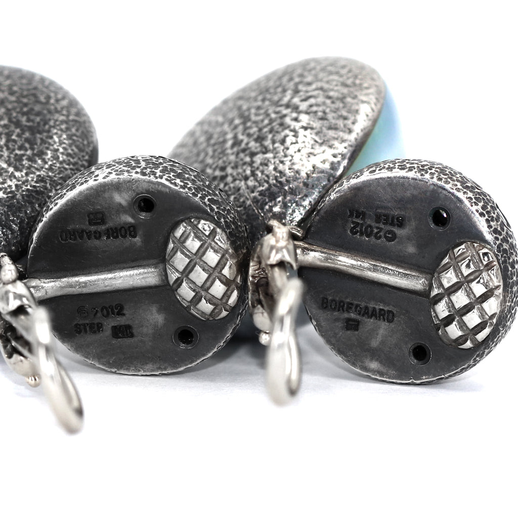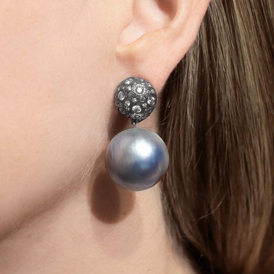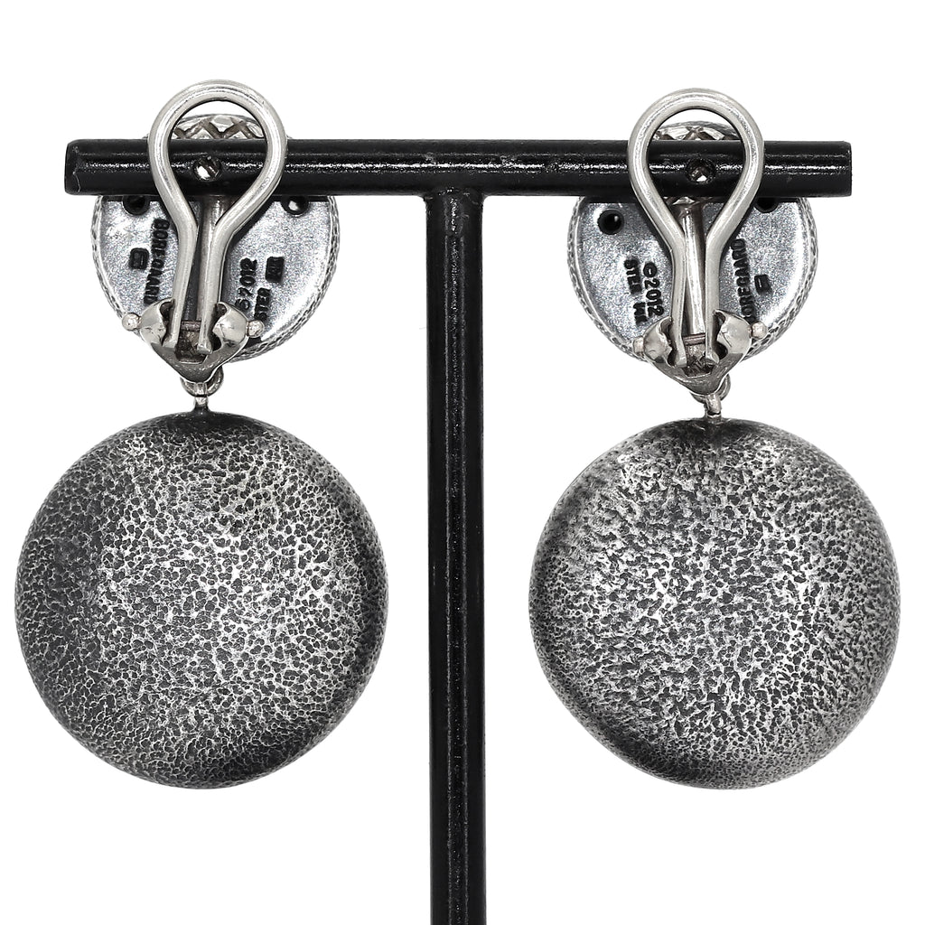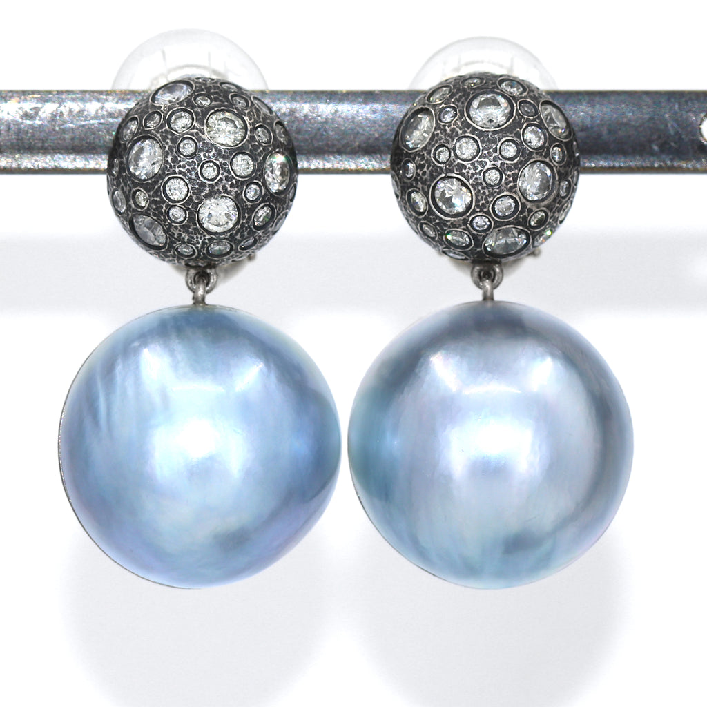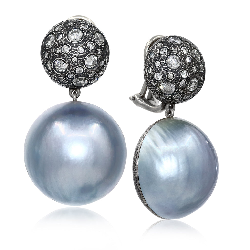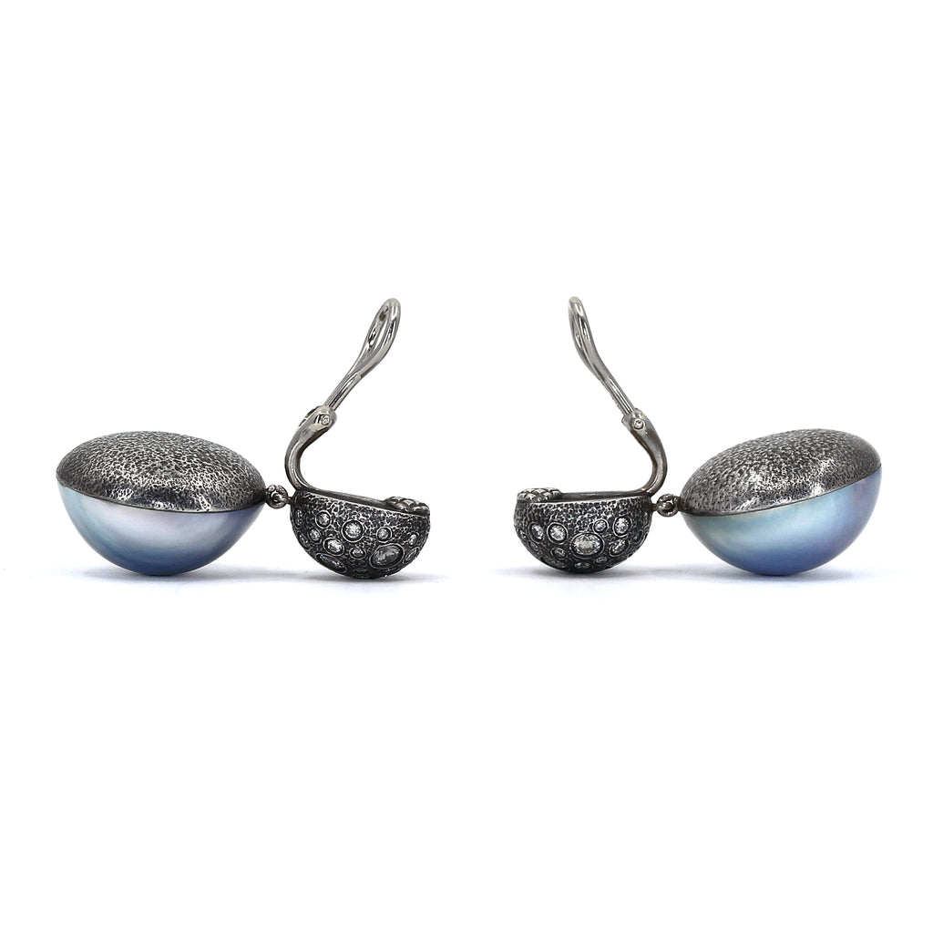 One of a Kind Earrings hand-fabricated by acclaimed master metalsmith and maker Pedro Boregaard showcasing 2.75 total carats of round brilliant-cut diamonds bezel-set in a domed, intricately-textured oxidized sterling silver dome top above a spectacular matched pair of lustrous 31mm violet-blue mabe pearls, also bezel-set in the artist's signature-finished oxidized silver. The pair is finished with 14k gold ear clips and hardware. Each earring stamped and hallmarked.