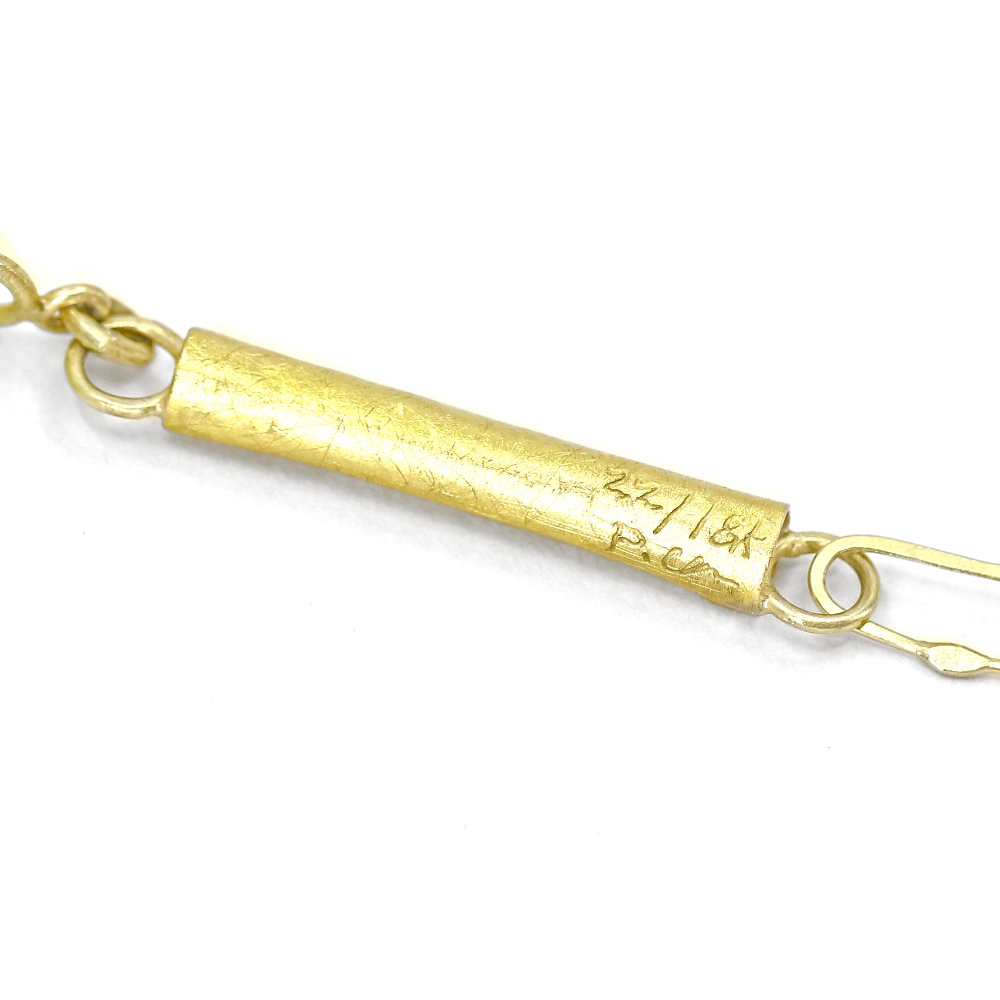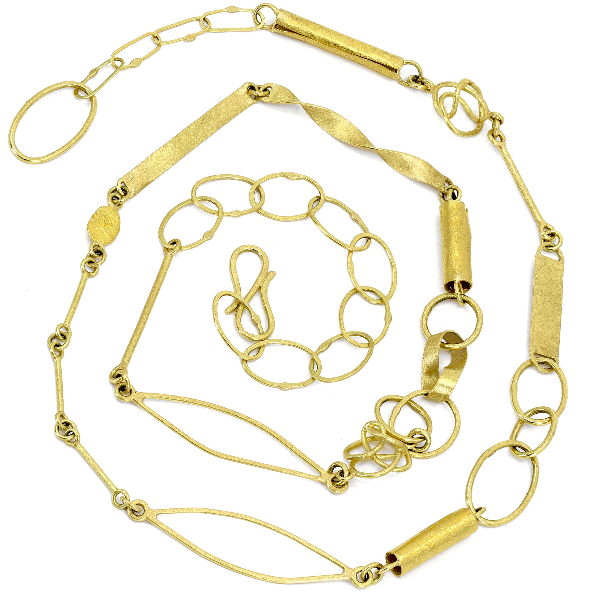 One of a Kind Mix 'n Mingle Chain hand-fabricated by jewelry maker Petra Class featuring a spectacular assortment of the artist's signature 18k yellow gold and 22k yellow gold links intricately laid out and connected to optimize wearability in multiple positions and at multiple lengths. The artisan chain is 24.5 inches in length and is finished with a handmade hook and eye clasp that seamlessly integrates into the design. Stamped and Hallmarked