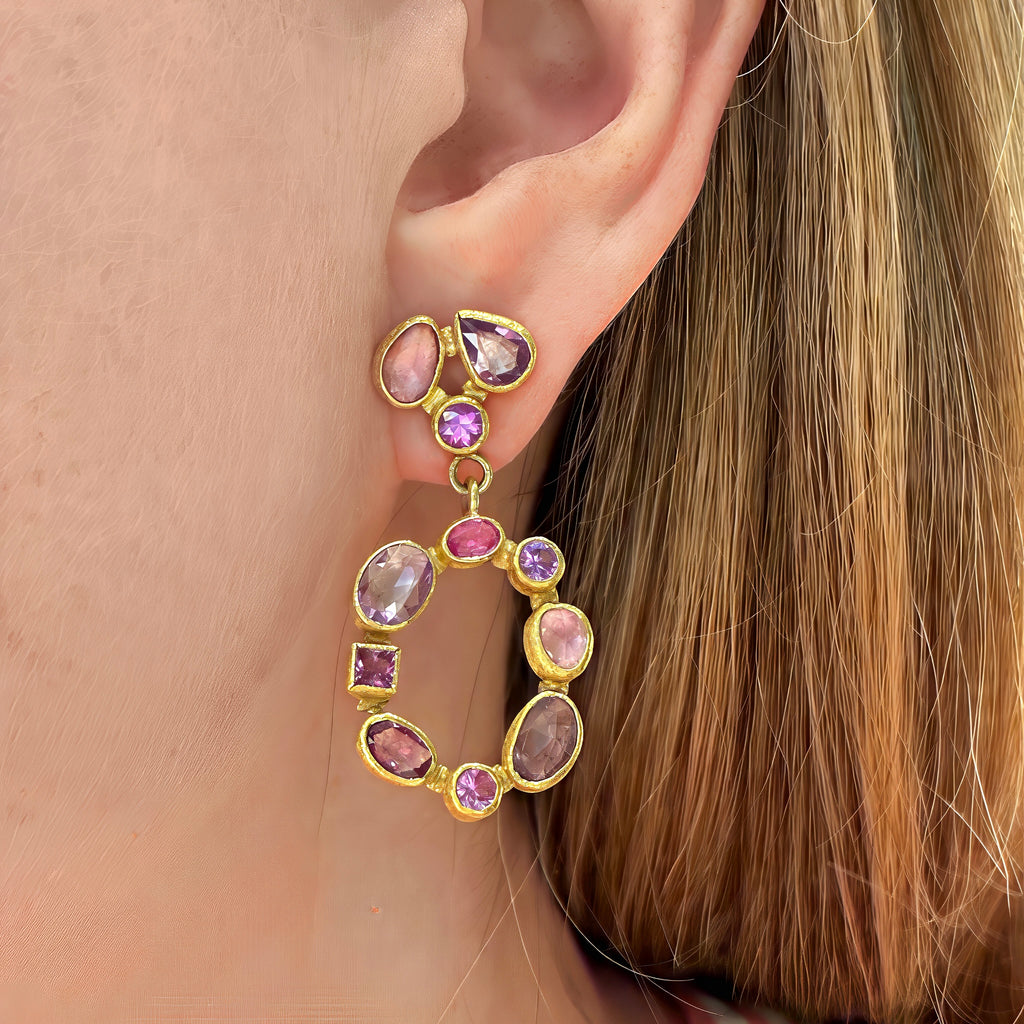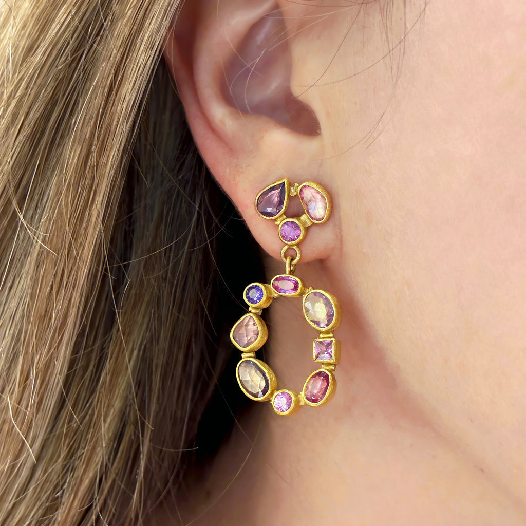 One of a Kind Mosaic Circle Drop Earrings handmade in signature-finished 22k yellow gold by master jewelry artist Petra Class featuring eight stunning matched pairs of shimmering, faceted aquamarine of assorted shape and hue, intricately bezel-set in a mirrored circular mosaic pattern and finished with 18k yellow gold jump rings, posts, and 14k yellow gold backs. Stamped and Hallmarked.