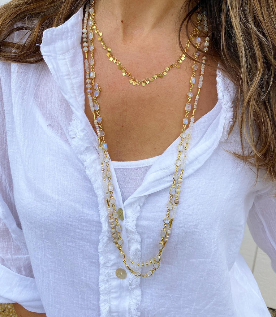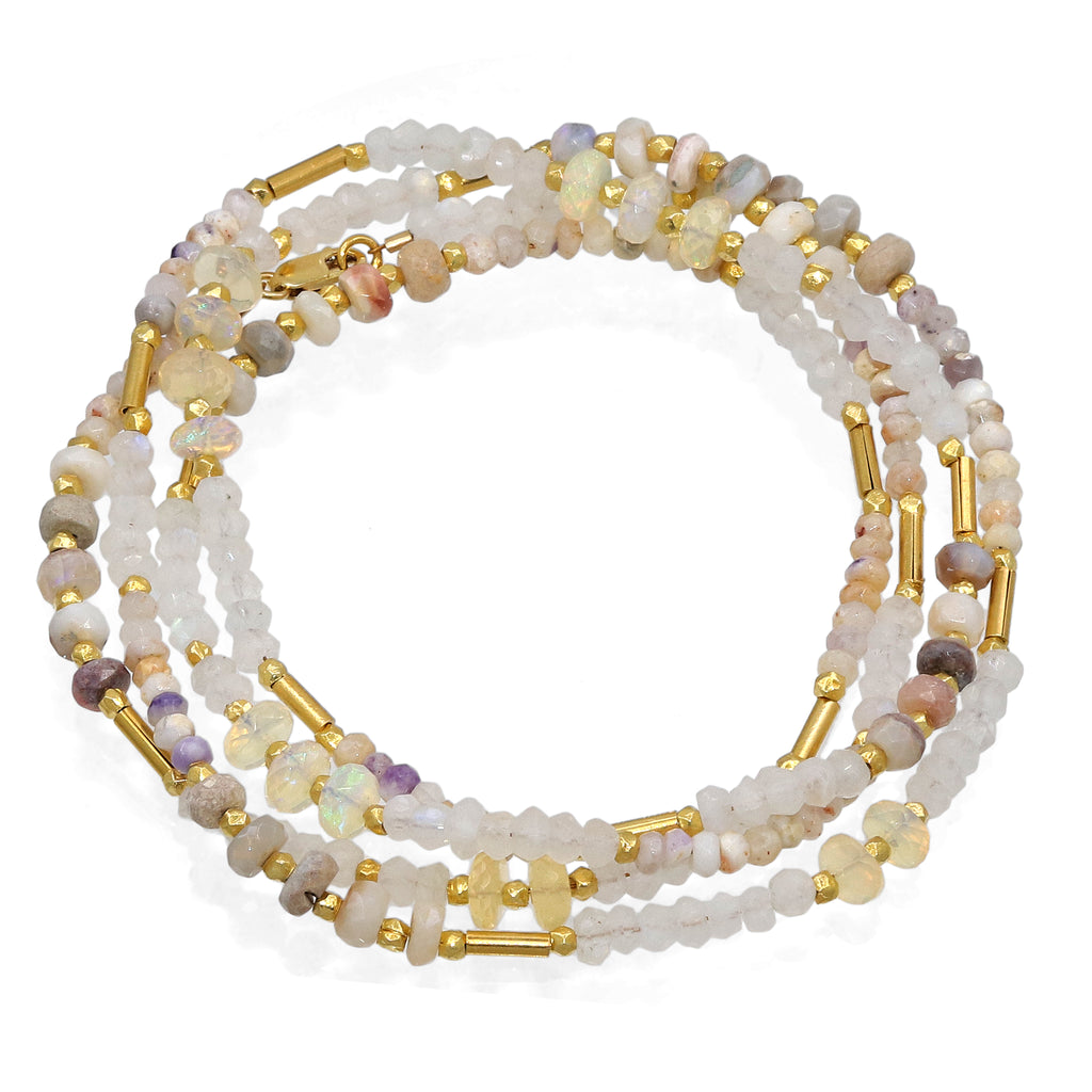 Long Beaded Necklace by jewelry maker Robindira Unsworth featuring assorted faceted Ethiopian opal and faceted moonstone beads flanked with 22k yellow gold vermeil accenting and finished with a lobster clasp for easy doubling.