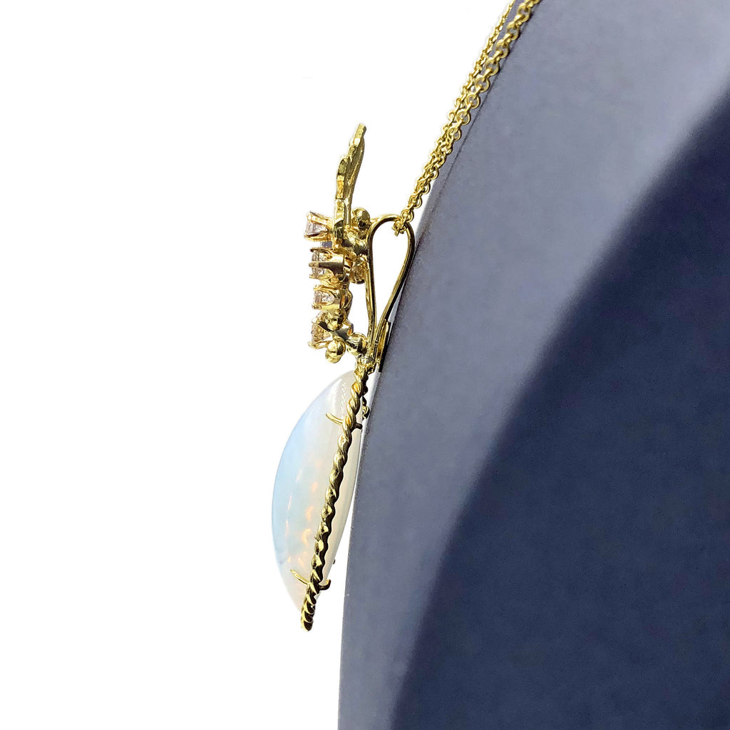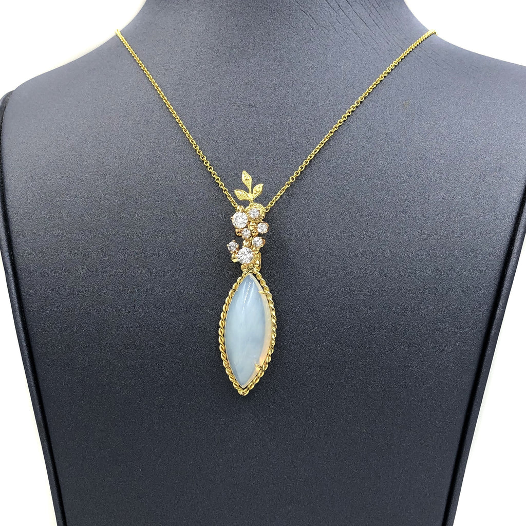 One of a Kind Necklace by acclaimed jewelry maker Russell Trusso featuring a spectacular milky marquise chalcedony cabochon with a subtle yellow-orange glows. The gem is wrapped in a handmade 18k yellow gold setting and sits beneath seven shimmering round white sapphires set in an ornamental floral pattern. Finished on an 18k yellow gold 17 inch chain. 19.5 inches in total length with pendant. Stamped and Hallmarked.